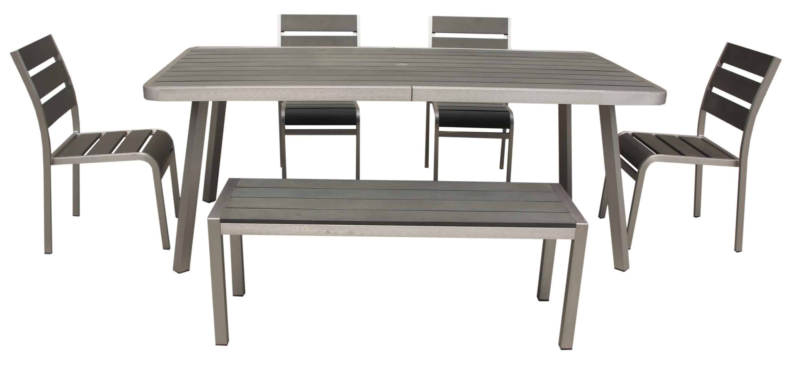Time to refresh your indoor or outdoor space with the new Brava Six Piece Dining Set from Boraams Polylumber line. The Brava set includes the Fresca Rectangle Dining Table, four stackable Fresca Side Chairs and the Fresca Bench. Constructed with an Aluminum frame and stainless steel hardware. The table top, chairs and bench are also made of high-density polyethylene. Contrast to outdoor wood furniture, Polylumber is environmentally friendly, low maintenance and resistant to heat and water. The Fresca is naturally immune to corrosion, durable and light weight. The table features a pluggable umbrella hole and both the table, chairs and bench are all finished in a Gray stain Polylumber finish and brushed Aluminum frame. Make sure to pick up your Brava Dining Set today!