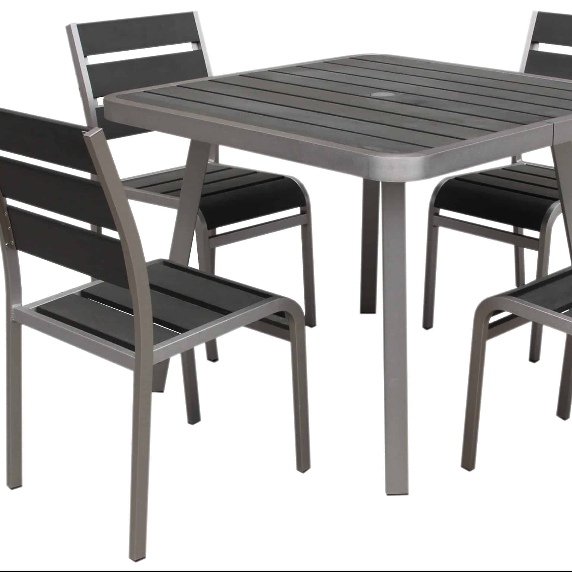 Time to refresh your indoor or outdoor space with the new Brava Five Piece Dining Set from Boraams Polylumber line. The Brava set includes the Fresca Square Dining Table and four Fresca Side Chairs. Constructed with an Aluminum frame and stainless steel hardware. The table top and chair is also made of high-density polyethylene. Contrast to outdoor wood furniture, Polylumber is environmentally friendly, low maintenance and resistant to heat and water. The Fresca is naturally immune to corrosion, durable and light weight. The table features a pluggable umbrella hole and both the table and chairs are finished in a Gray stain Polylumber finish and brushed Aluminum frame. Make sure to pick up your Brava Dining Set today!