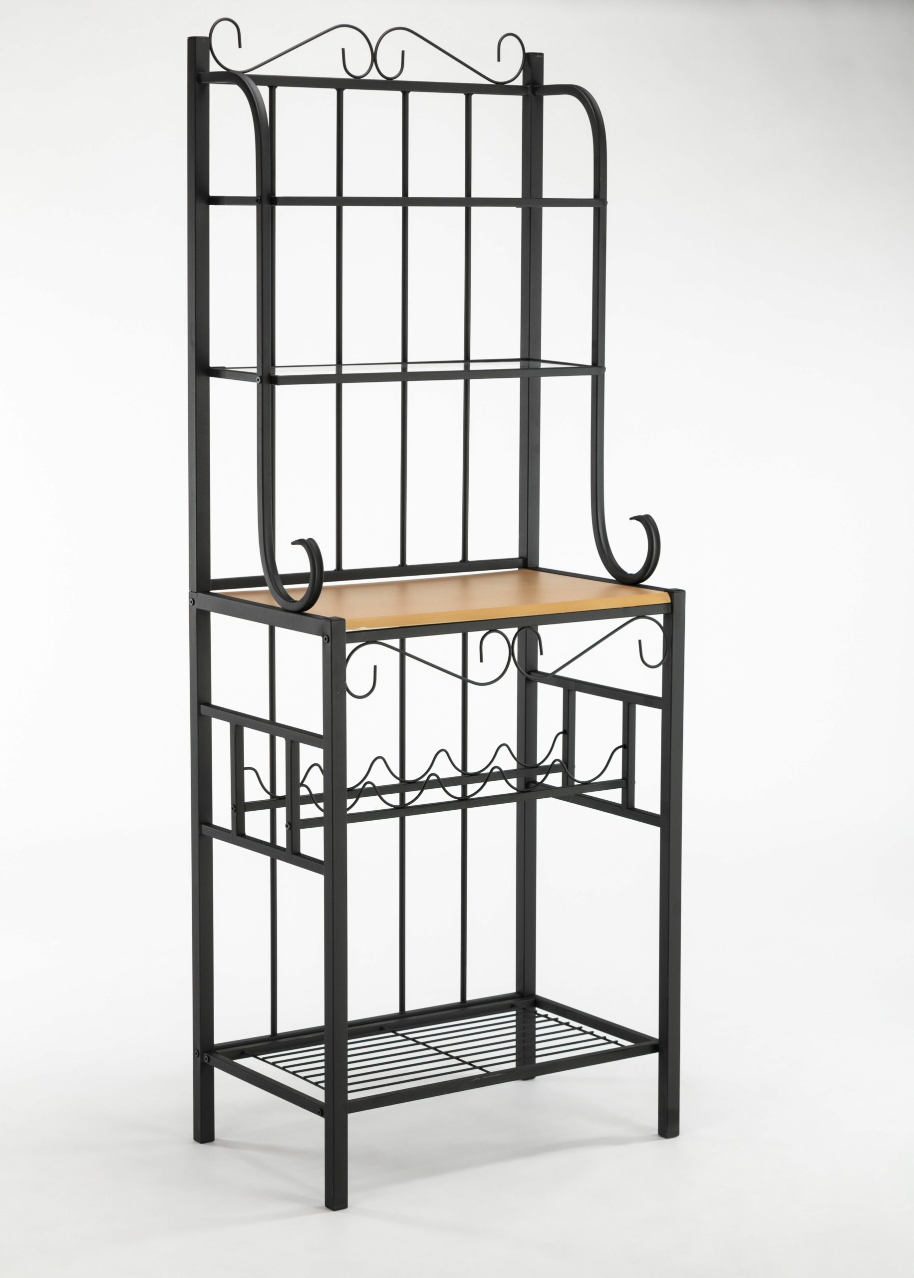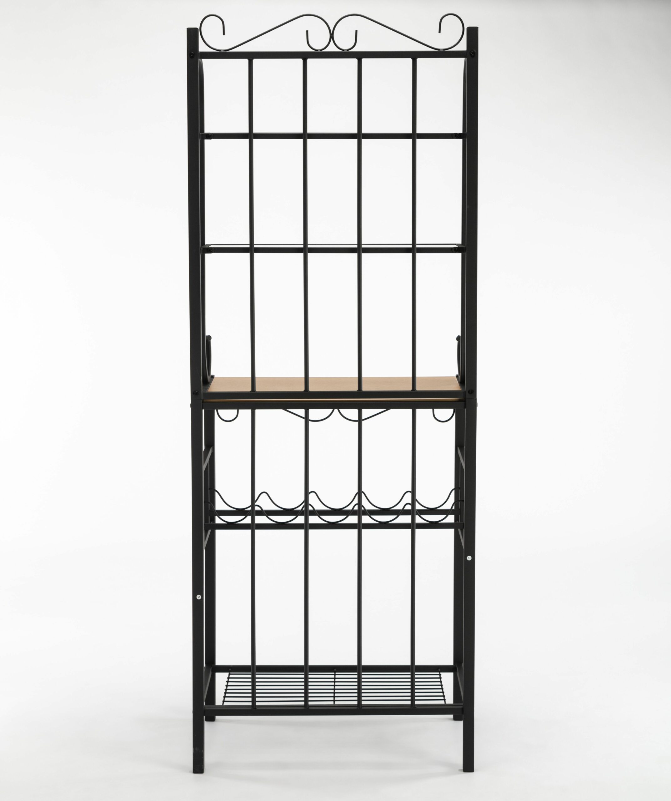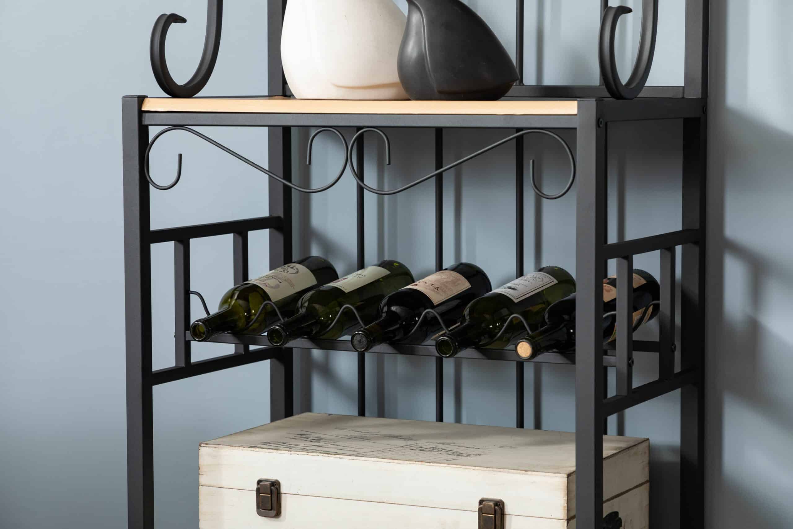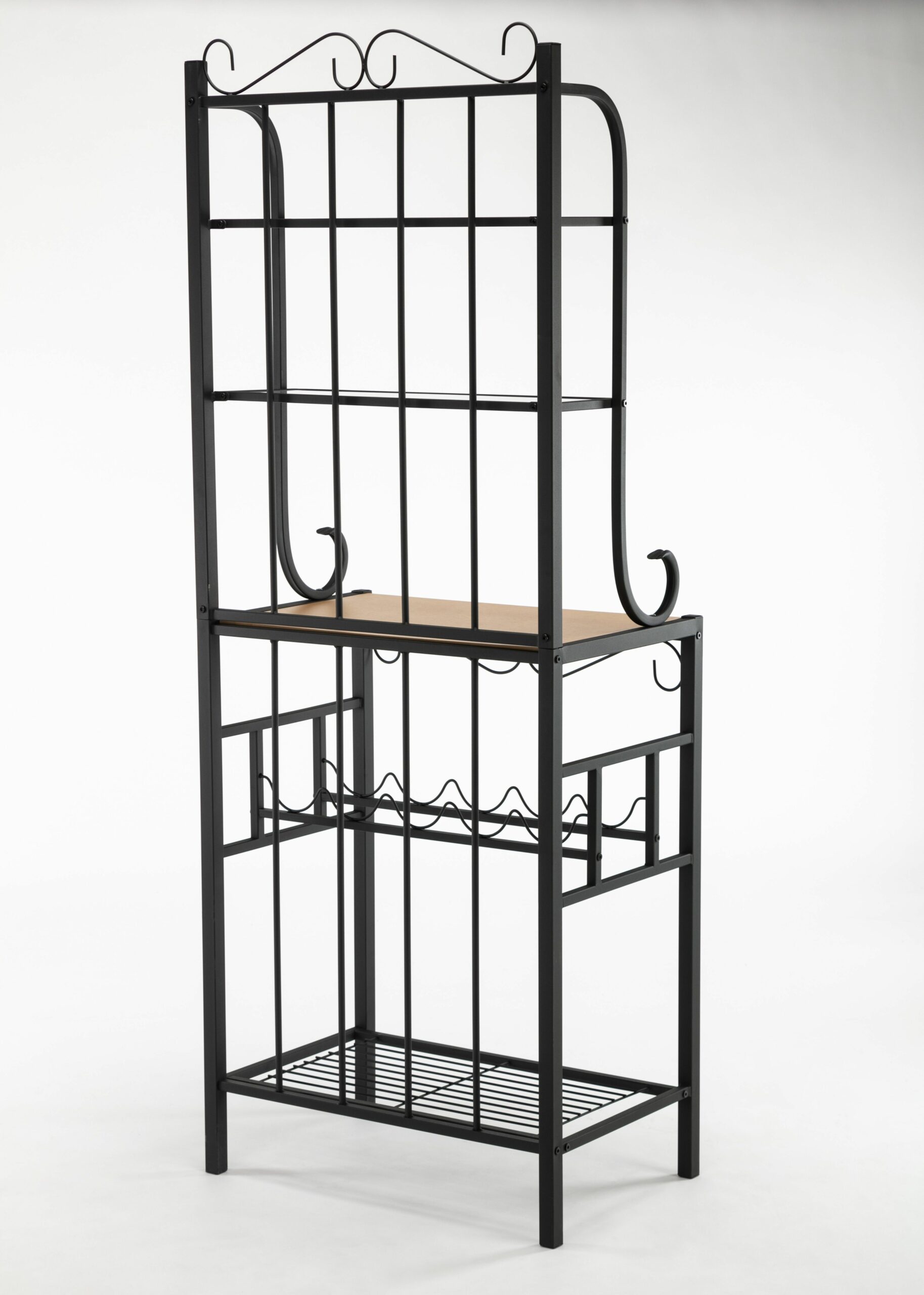 Complete your dream kitchen with the Praha Baker’s Rack. Built from sturdy steel with a black powder-coated finish, this durable rack fits into any design aesthetic. Its four shelves hold kitchen implements, such as glassware and china, or decorative accents. A wine rack offers convenient storage for keeping your favorite bottles within easy reach. Get the best of design and functionality with the Praha Baker’s Rack.