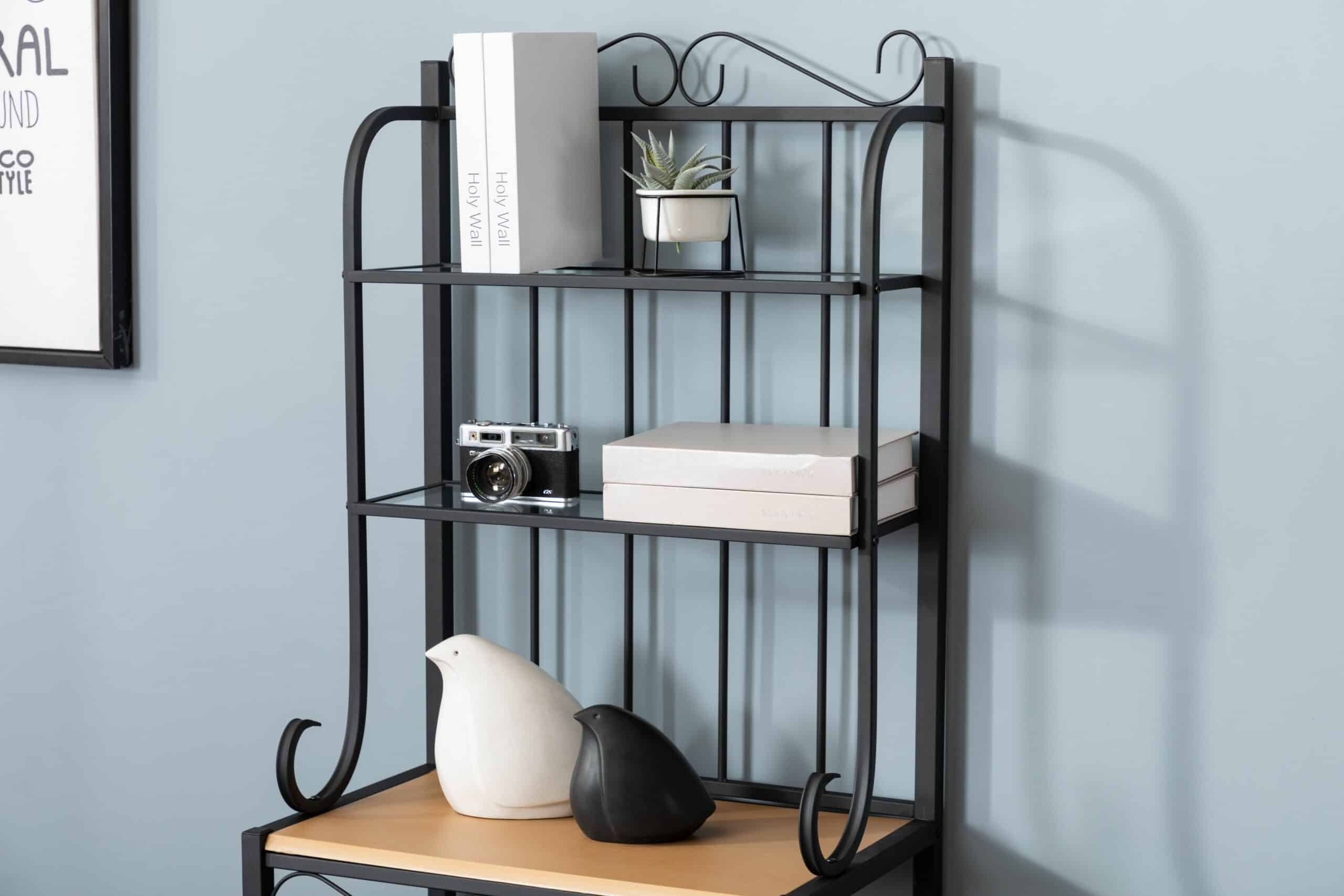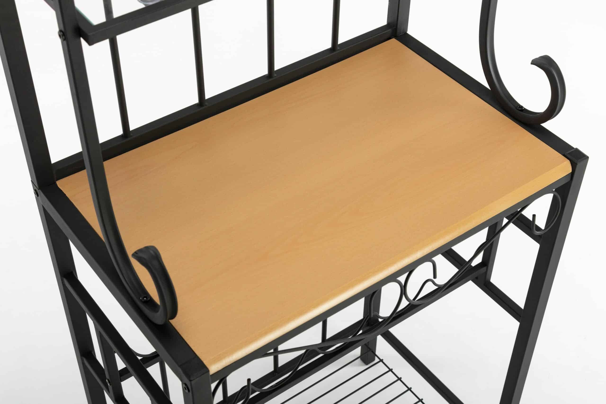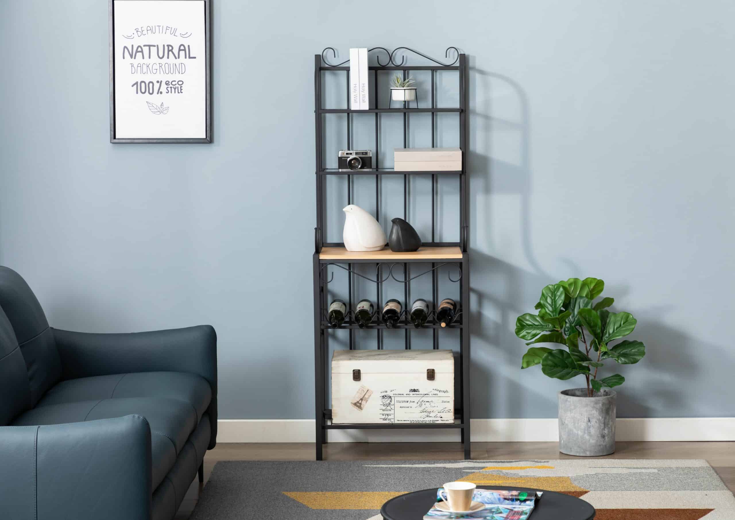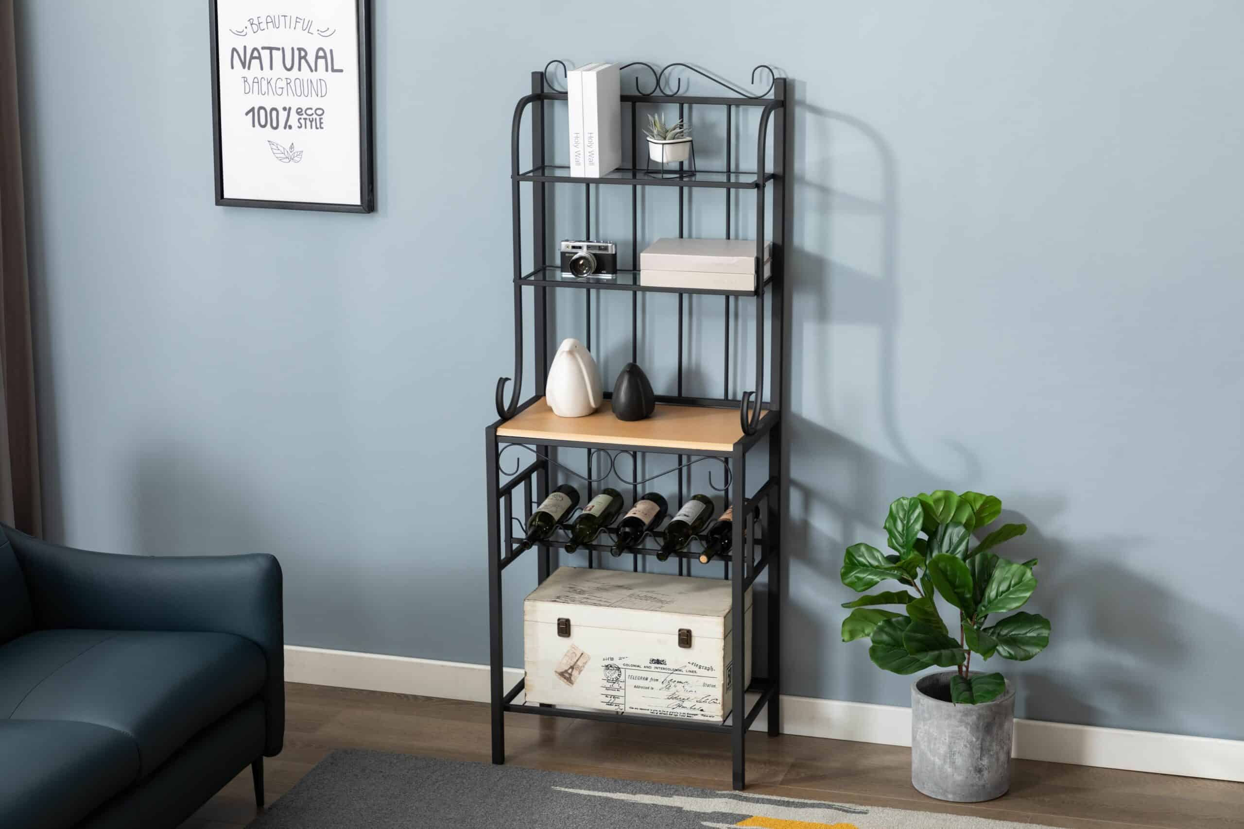 Complete your dream kitchen with the Praha Baker’s Rack. Built from sturdy steel with a black powder-coated finish, this durable rack fits into any design aesthetic. Its four shelves hold kitchen implements, such as glassware and china, or decorative accents. A wine rack offers convenient storage for keeping your favorite bottles within easy reach. Get the best of design and functionality with the Praha Baker’s Rack.