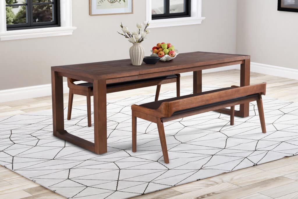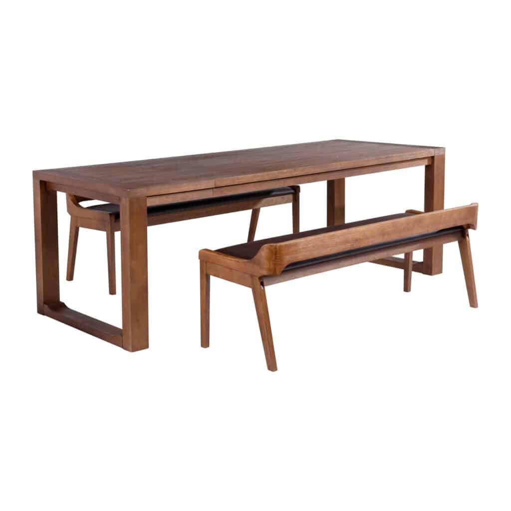Add the Boraam 3-piece Rasmus Dining Set to your living or dining room. This set includes a dining table and two dining benches. The table and benches are constructed with solid rubberwood. The benches are also upholstered with padded faux leather. This 3-piece set is available in our new chestnut wire-brush finish. The dining table has a drop leaf extension that is included. This set is ready for assembly upon delivery with all tools and hardware included. The chestnut feel will bring a warm energy to your home.