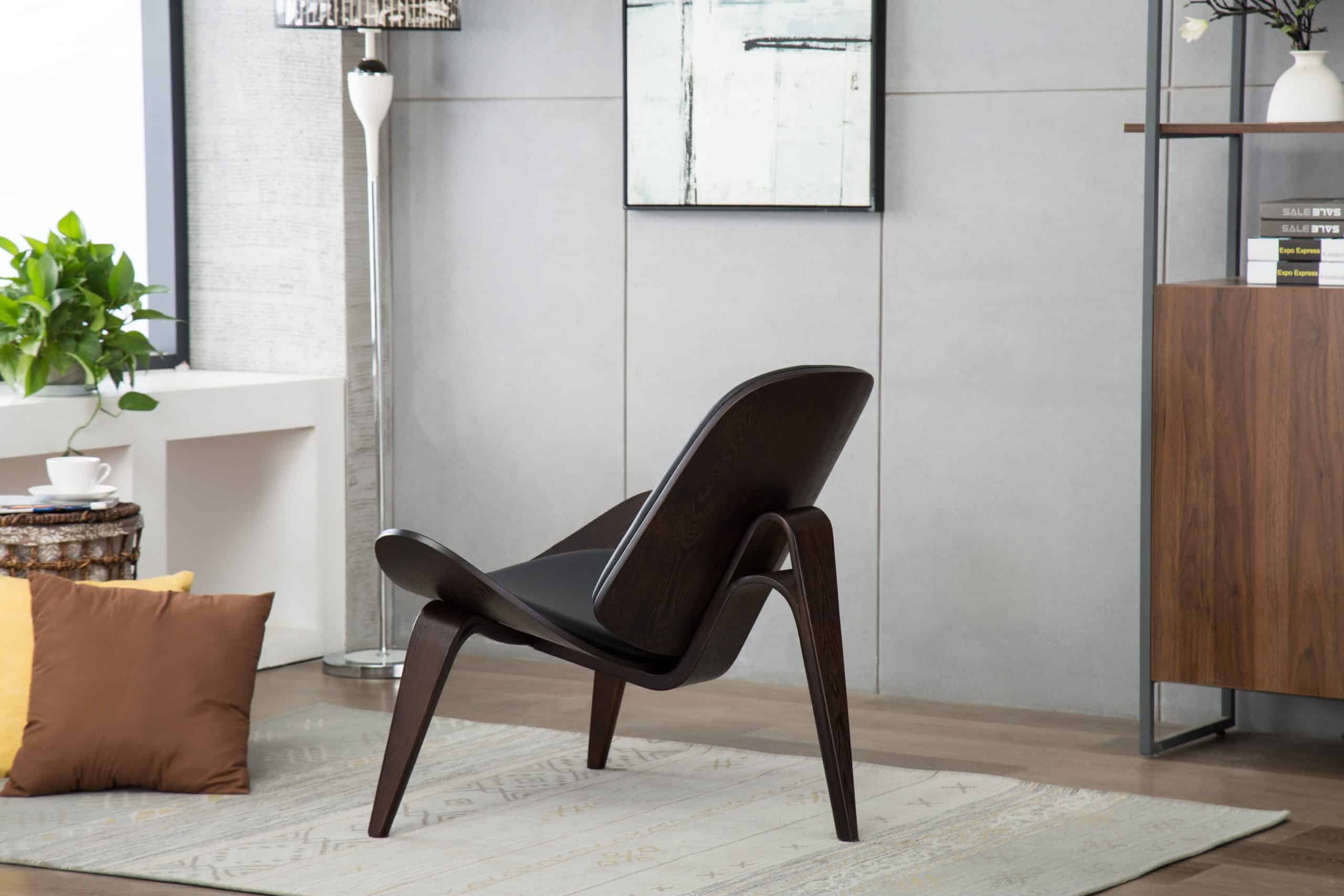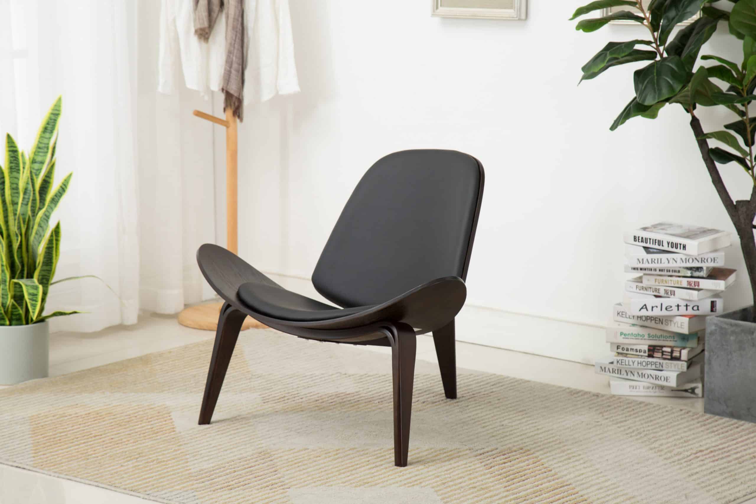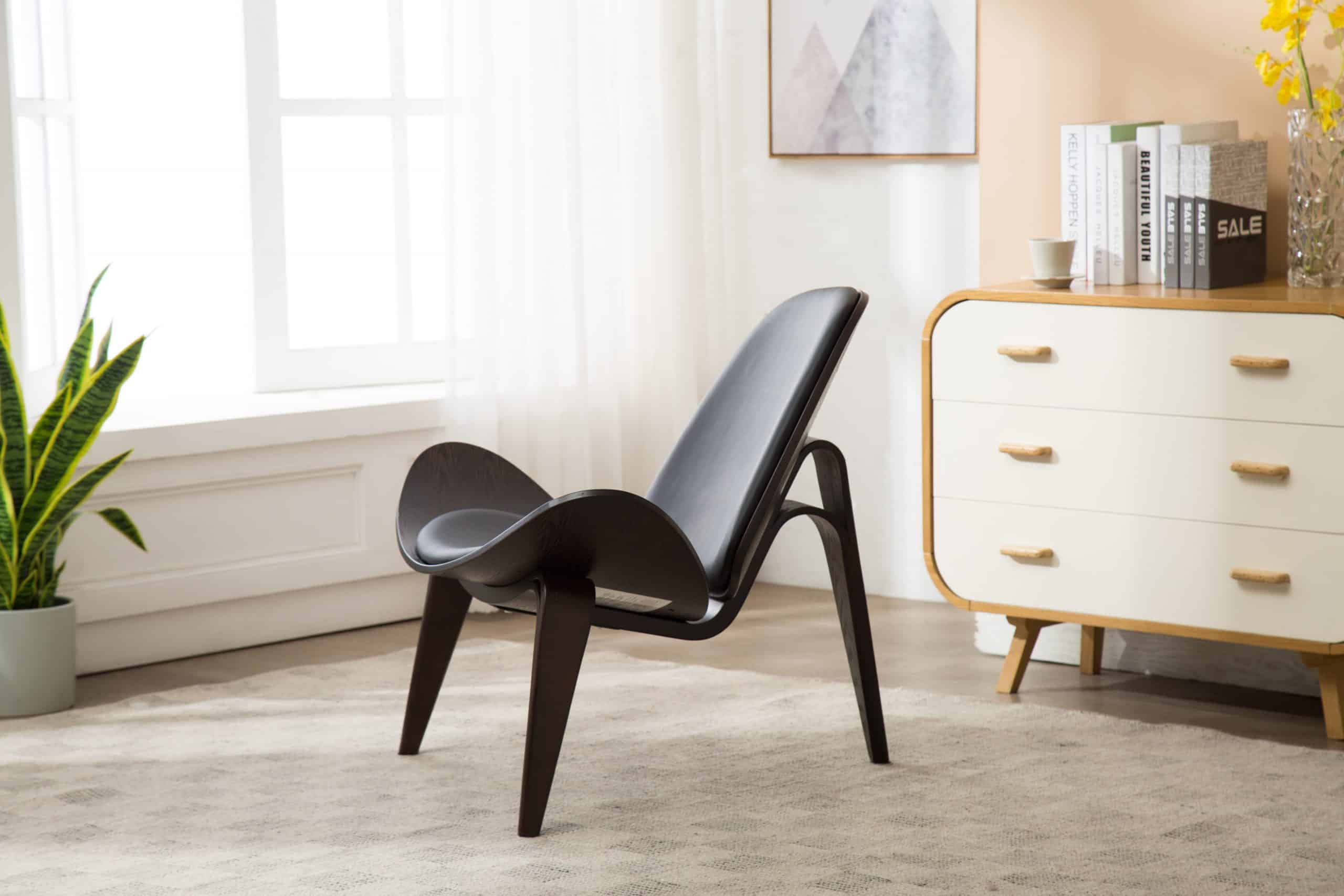 Retro style is back – and it looks better than ever in the Shell Side Chair. This vintage-inspired chair features tapered legs and curved seating for a sophisticated silhouette that is sure to be a winner with the guests. Its floating wingspan is roughly 3 feet, creating an impressive presence in any room. Clever craftsmanship ensures that this three-legged chair is even more stable than the traditional variety. The combination of the rich brown wood and the dark faux leather creates a warm, masculine edge. Get the designer looks without the designer price tag with the Shell Side Chair.