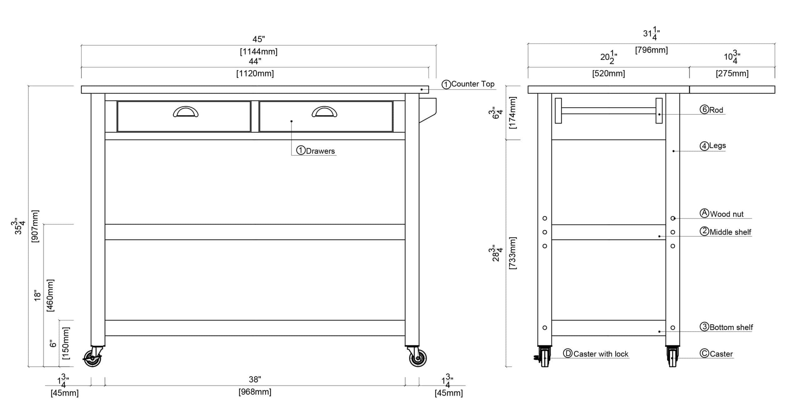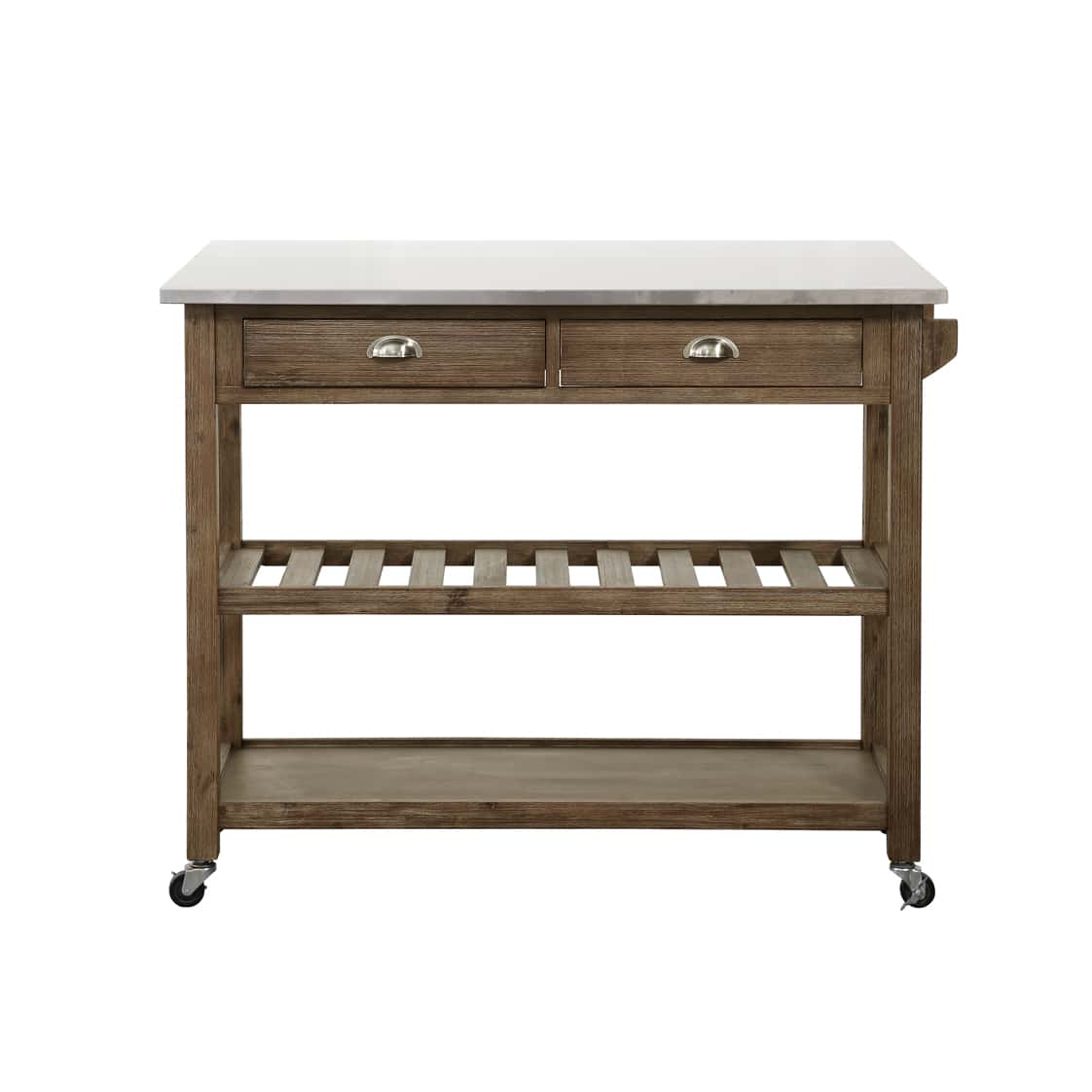 Bring portable storage and prep space to your kitchen with the Napa Kitchen Cart with Drop-Leaf. Whether your current kitchen is lacking in cupboard space or you dream of a kitchen island, this cart has the functionality and handsome good looks to suit your needs. Use the adjustable open shelving to store extra pots, pans, and dishes, while storing utensils and other cookware in the two drawers. There’s even a towel rack on the side to keep your tea towels close to hand while you cook. The use of mixed materials allows you the versatility to seamlessly fit this cart in any rustic, farmhouse, or industrial style home with effortless ease. This kitchen cart is constructed from durable solid Acacia wood and stainless steel. Finally, the wood is finished in a wire-brushed Barnwood color which enhances the beauty of the Acacia wood’s natural grain.