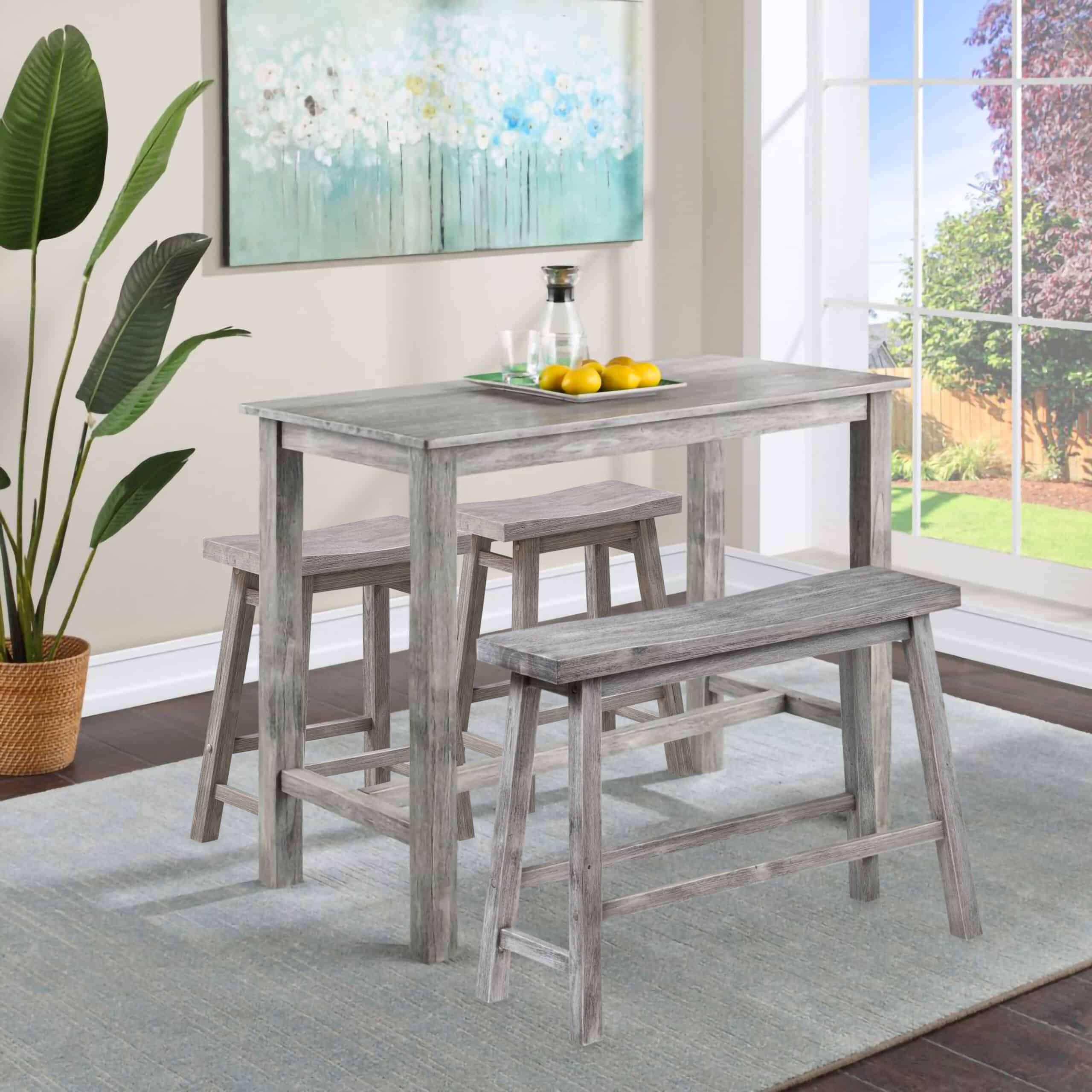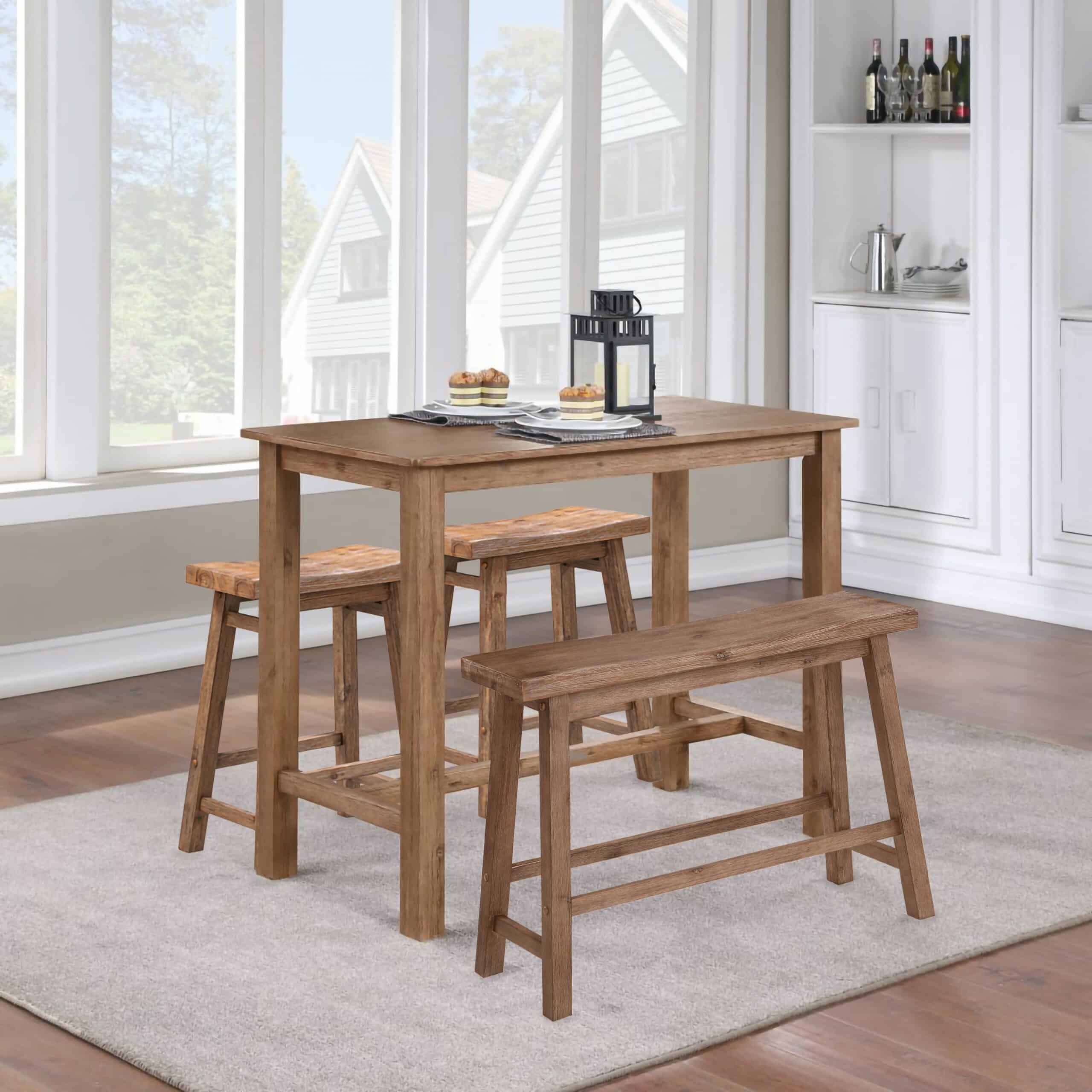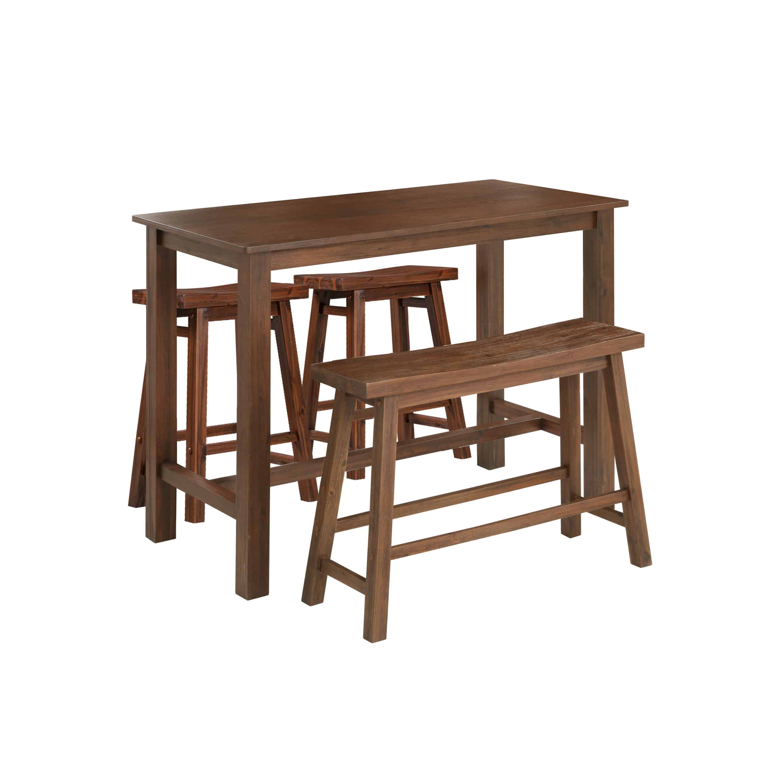 Welcome family and friends to casual after-dinner drinks and easy Sunday brunches around the Sonoma Pub Set. This four-piece set includes everything you need to create a cozy eating nook in the kitchen or living area. The pub table is paired with matching saddle stools and a saddle bench, easily fitting four people total. The seats are all contoured for your comfort, while built-in footrests offer a place to rest your feet. Every piece is made from solid acacia wood in your choice of three available finishes: Barnwood, Chestnut, and Storm Gray. Each finish undergoes a multistep wire-brush process to bring out the inherent beauty of the wood even more.