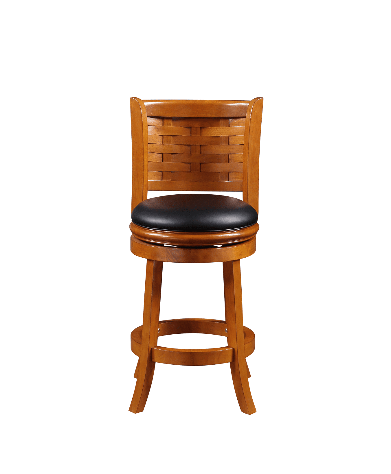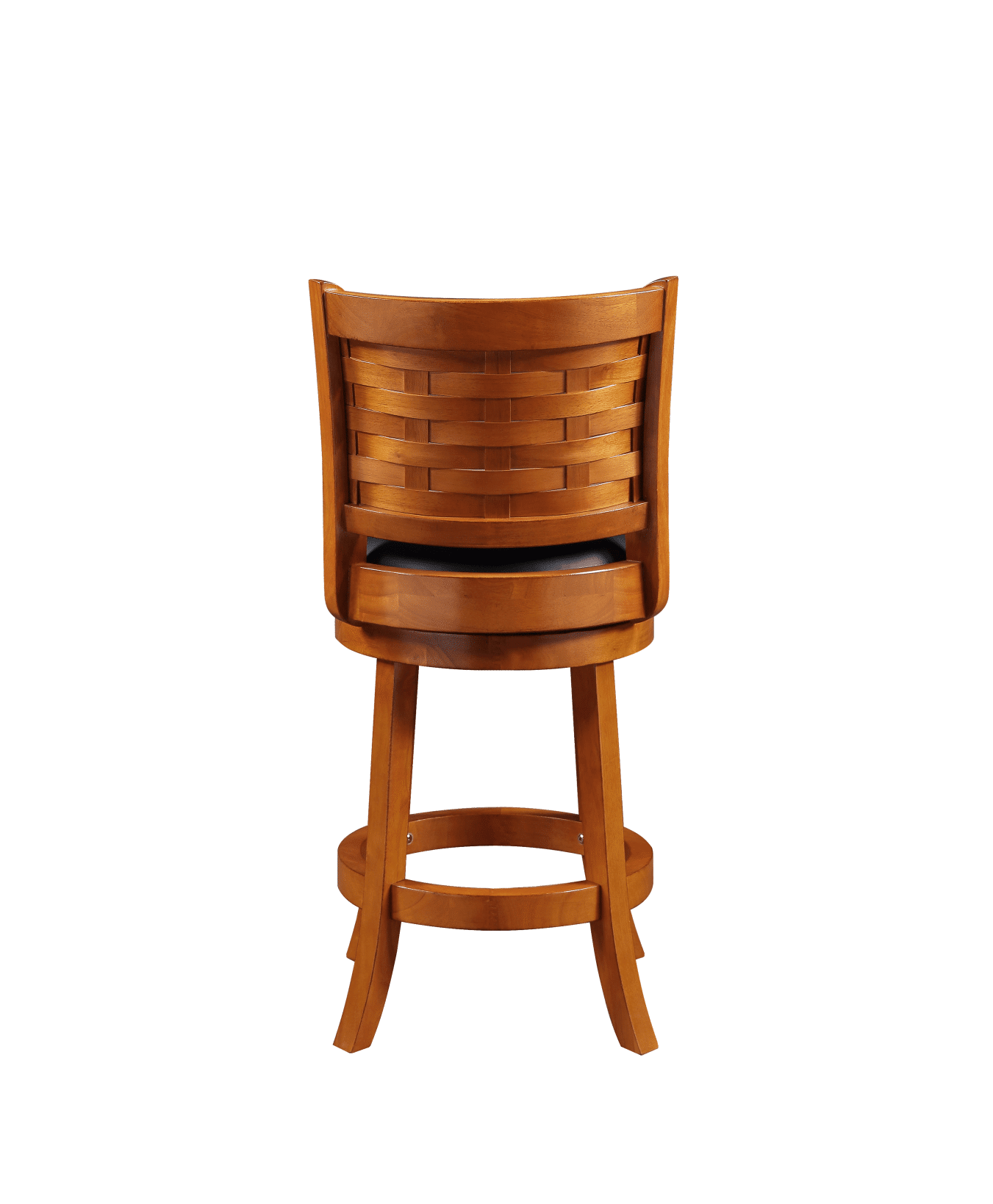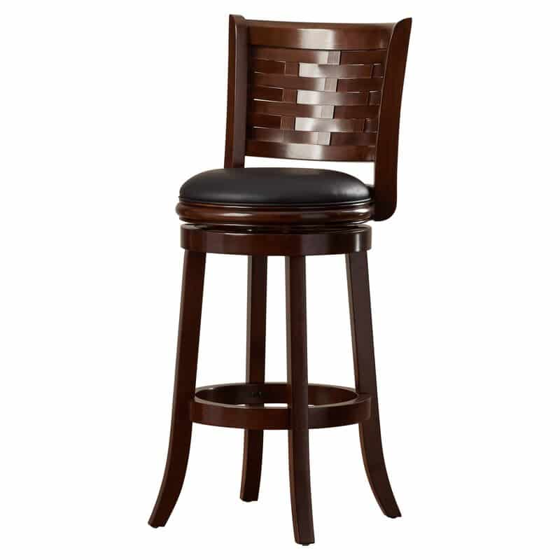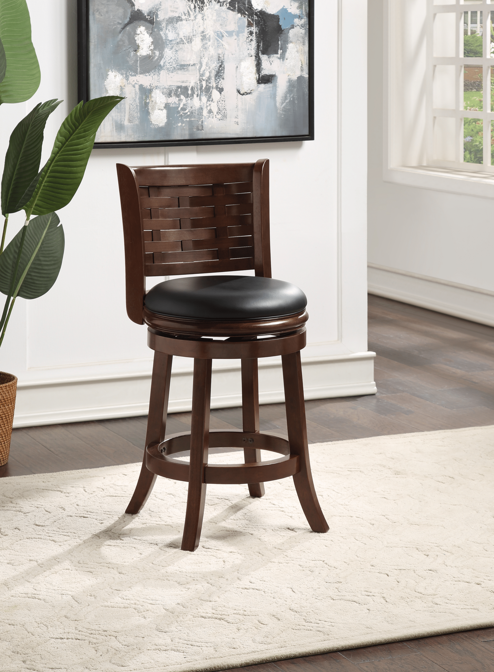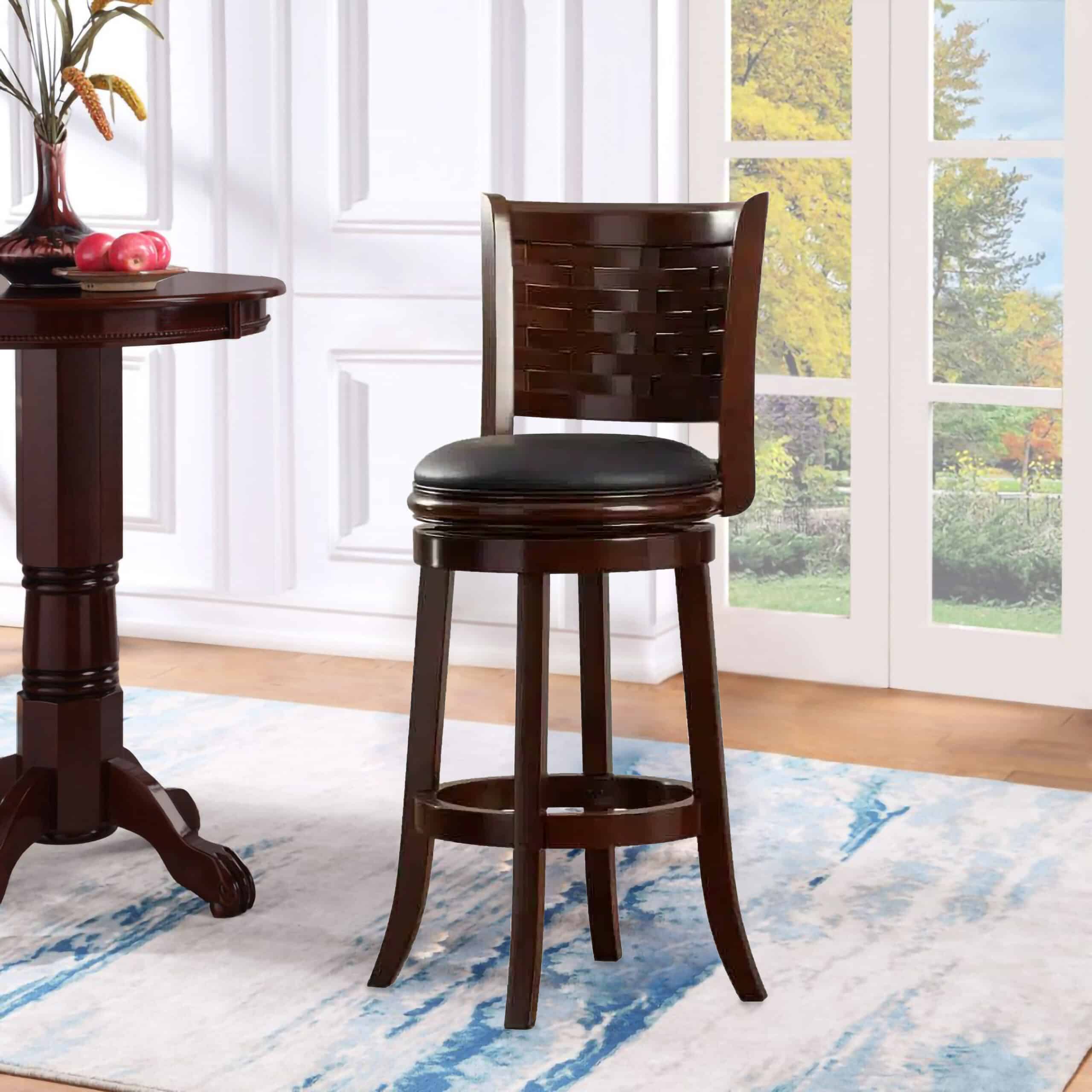 Seek out a style update with Boraam’s Sumatra Swivel Bar Stool. Offering a unique take on traditional design, this stool features a woven wood backrest crafted from rubberwood. The wood frame pairs with black faux leather upholstery (easy to wipe clean in case of spills or crumbs). A full 360-degree swivel offers you a full range of motion, while the steel ball-bearing swivel plate provides increased durability. Performance tested by leading testing facilities for your peace of mind. The Sumatra’s effortless style looks at home in any kitchen, basement, game room, or home bar. Customize it even further by choosing from the available color and height options.