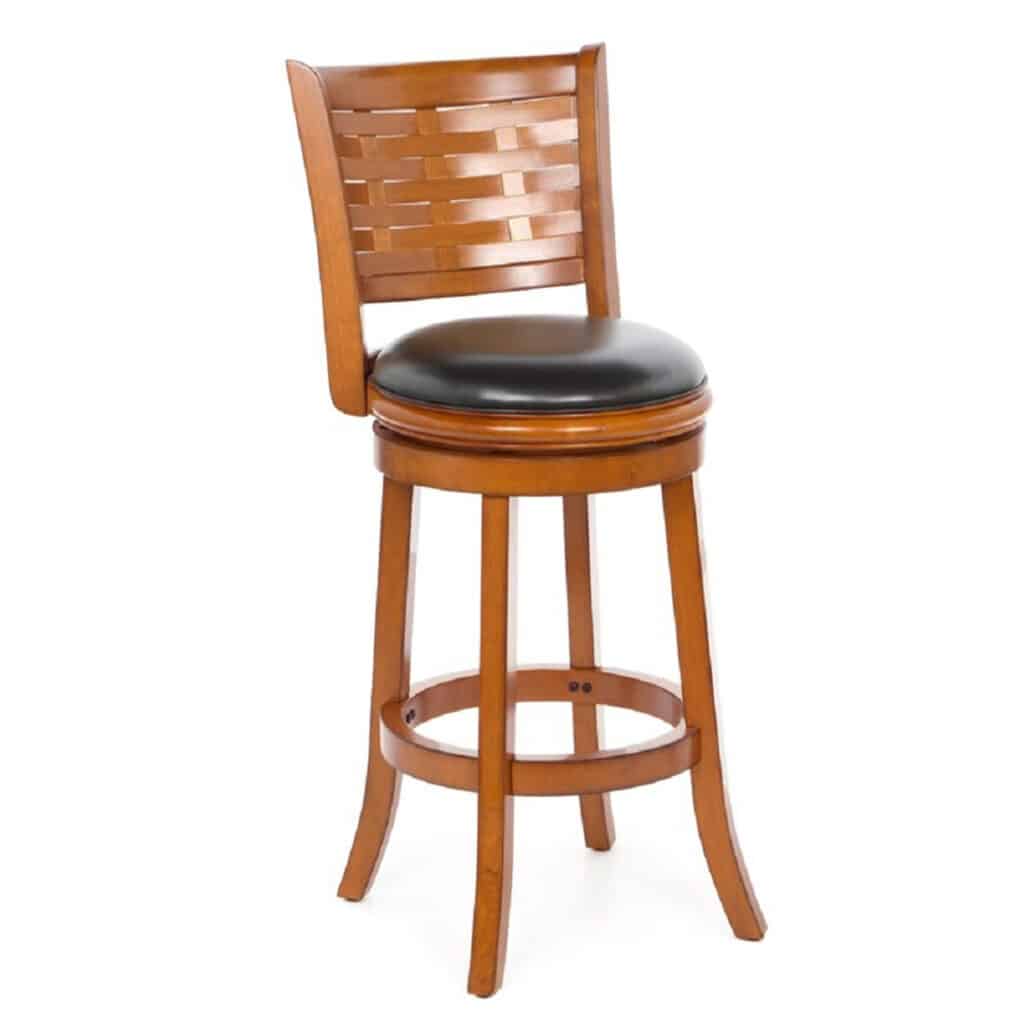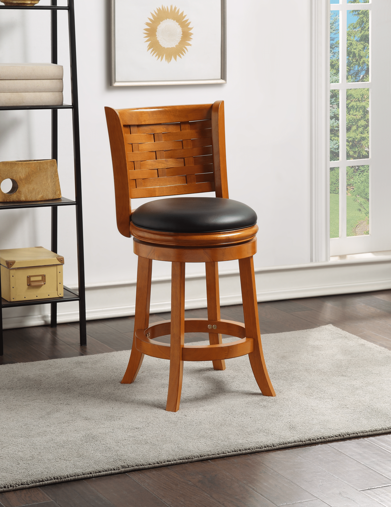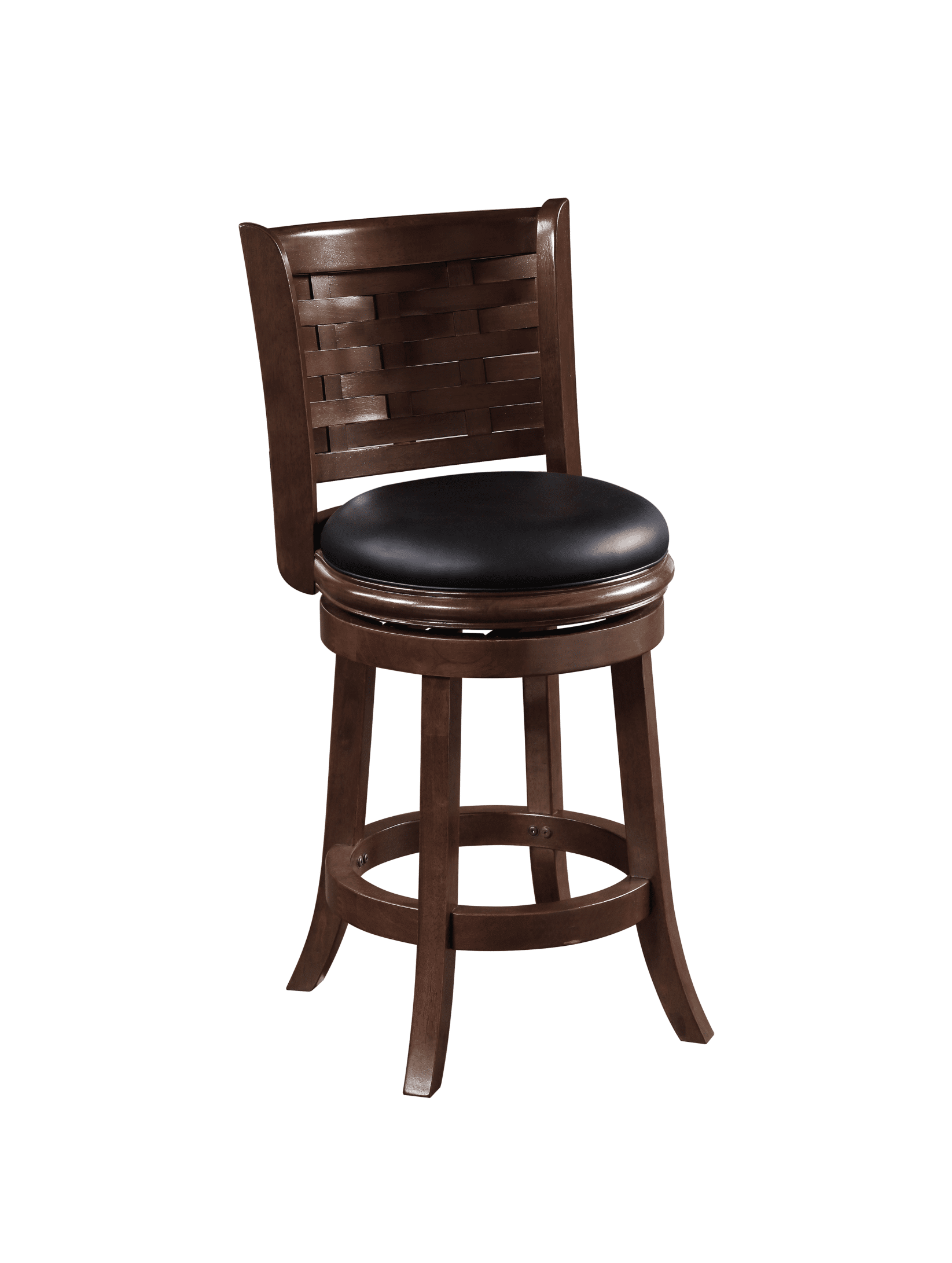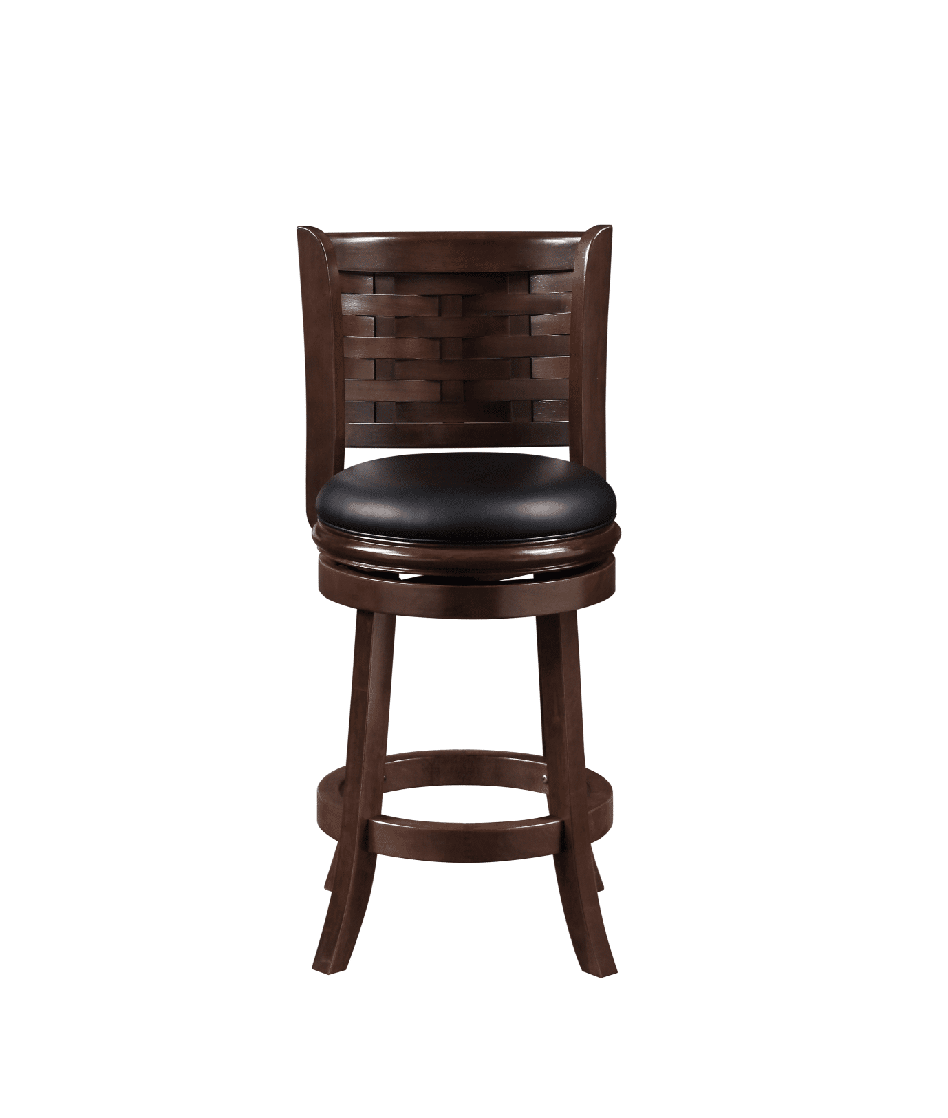 Seek out a style update with Boraam’s Sumatra Swivel Bar Stool. Offering a unique take on traditional design, this stool features a woven wood backrest crafted from rubberwood. The wood frame pairs with black faux leather upholstery (easy to wipe clean in case of spills or crumbs). A full 360-degree swivel offers you a full range of motion, while the steel ball-bearing swivel plate provides increased durability. Performance tested by leading testing facilities for your peace of mind. The Sumatra’s effortless style looks at home in any kitchen, basement, game room, or home bar. Customize it even further by choosing from the available color and height options.