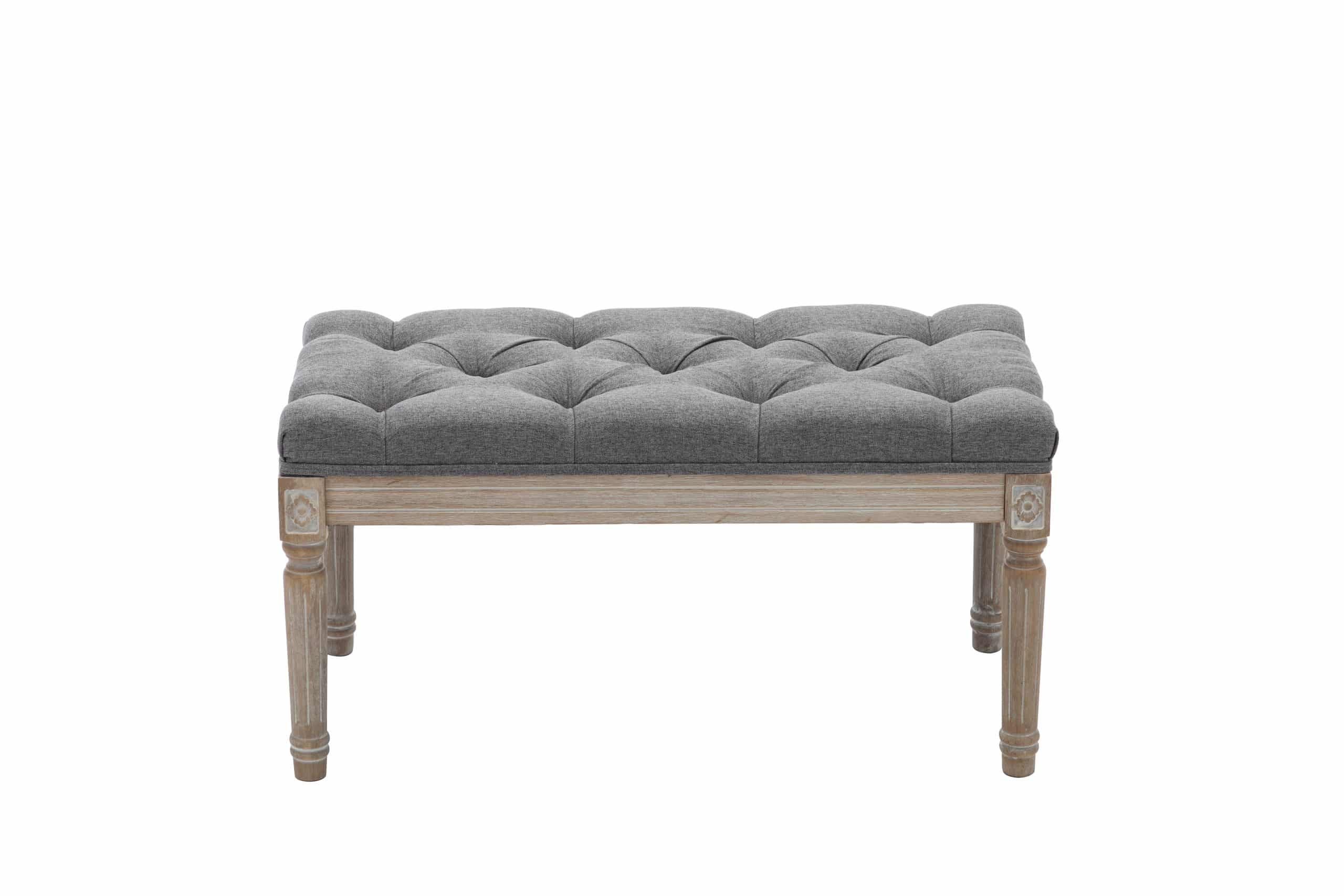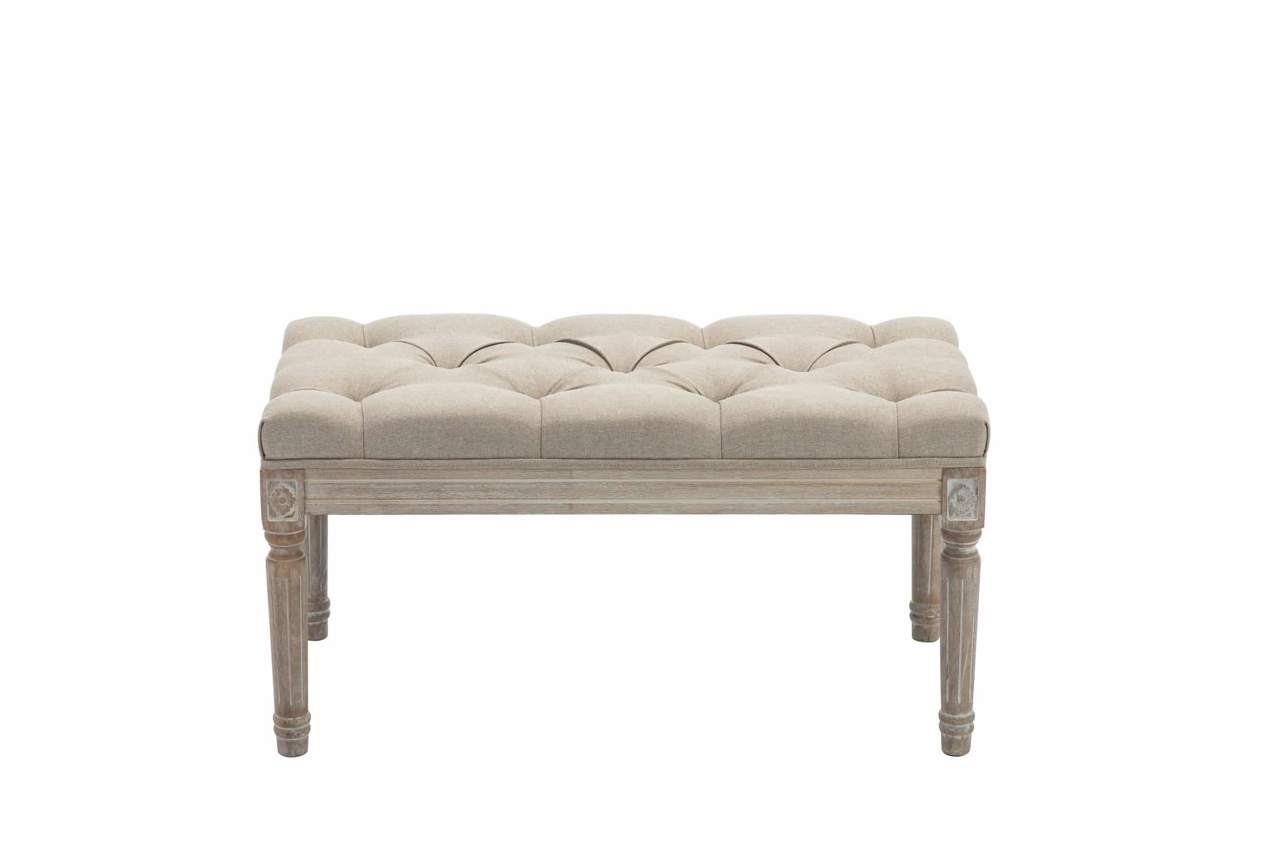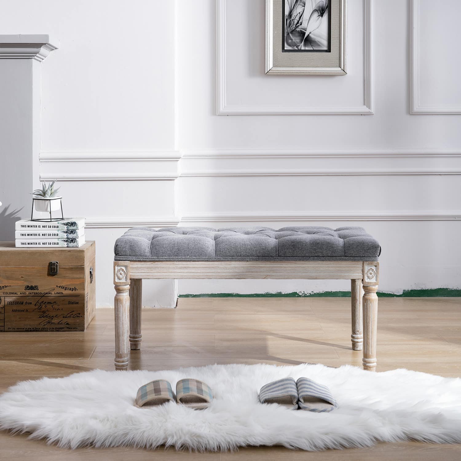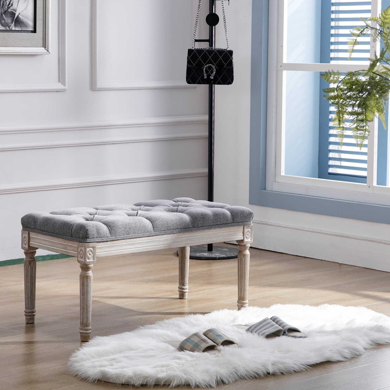 Add a tufted bench into your hall way or living room. Beautifully sculpted, this bench is available with two finishes; gray and taupe. The seats are tufted and padded. The bases are in a natural wood finish. Constructed with rubber wood, PU sponge, and polyester. Some assembly is required.