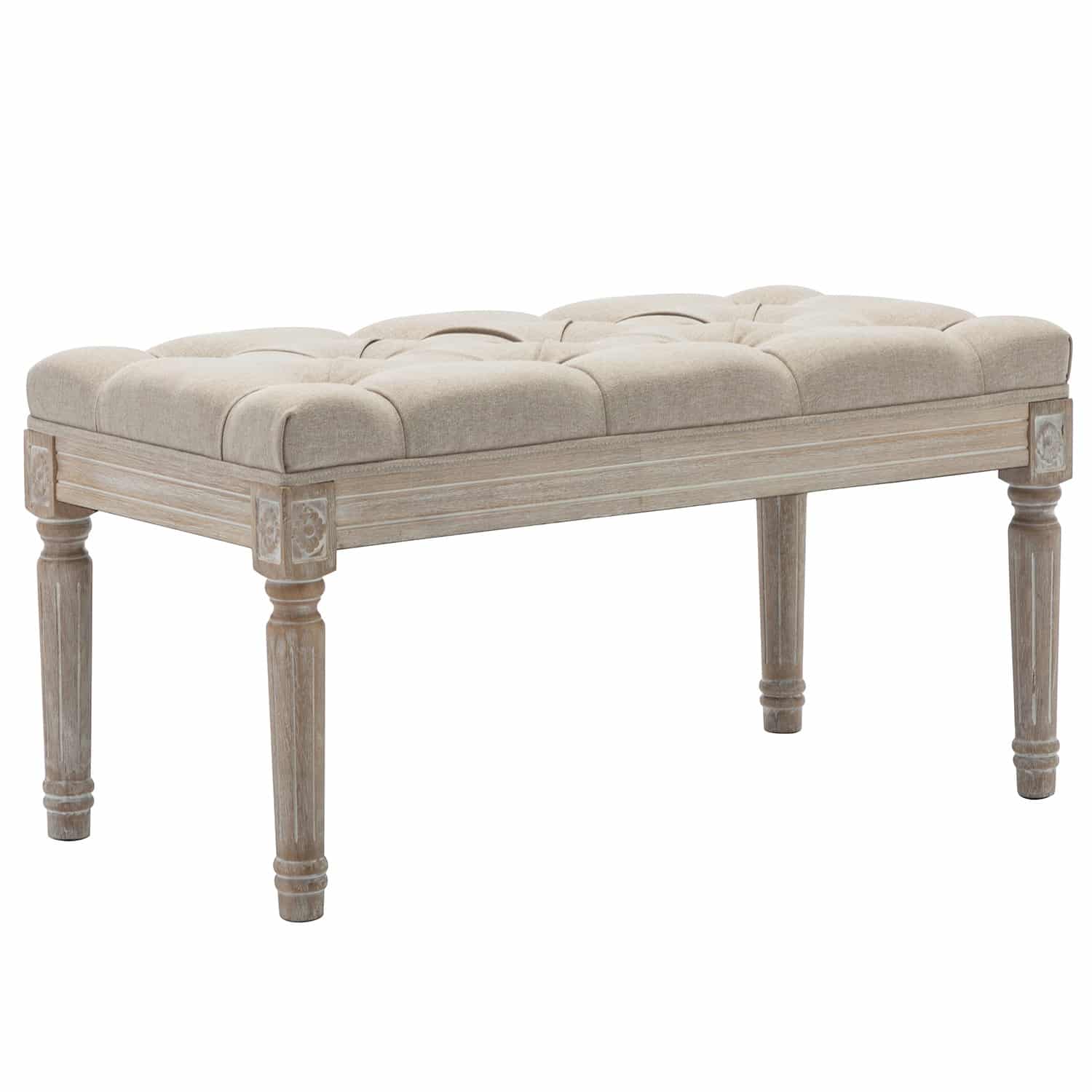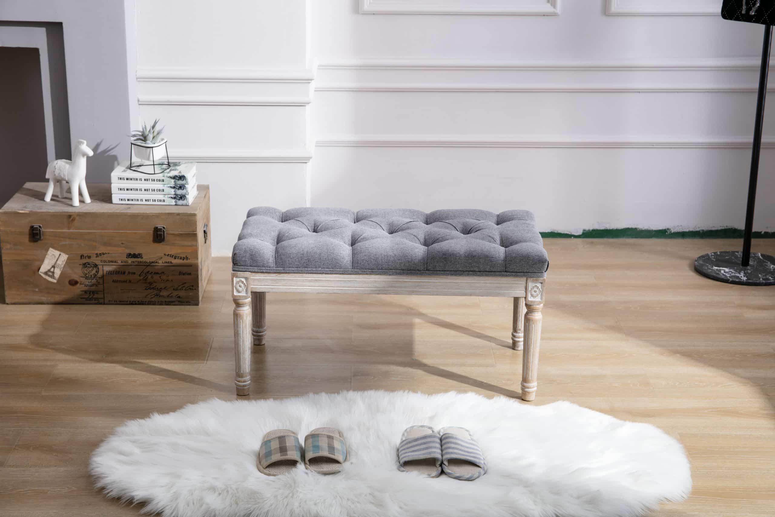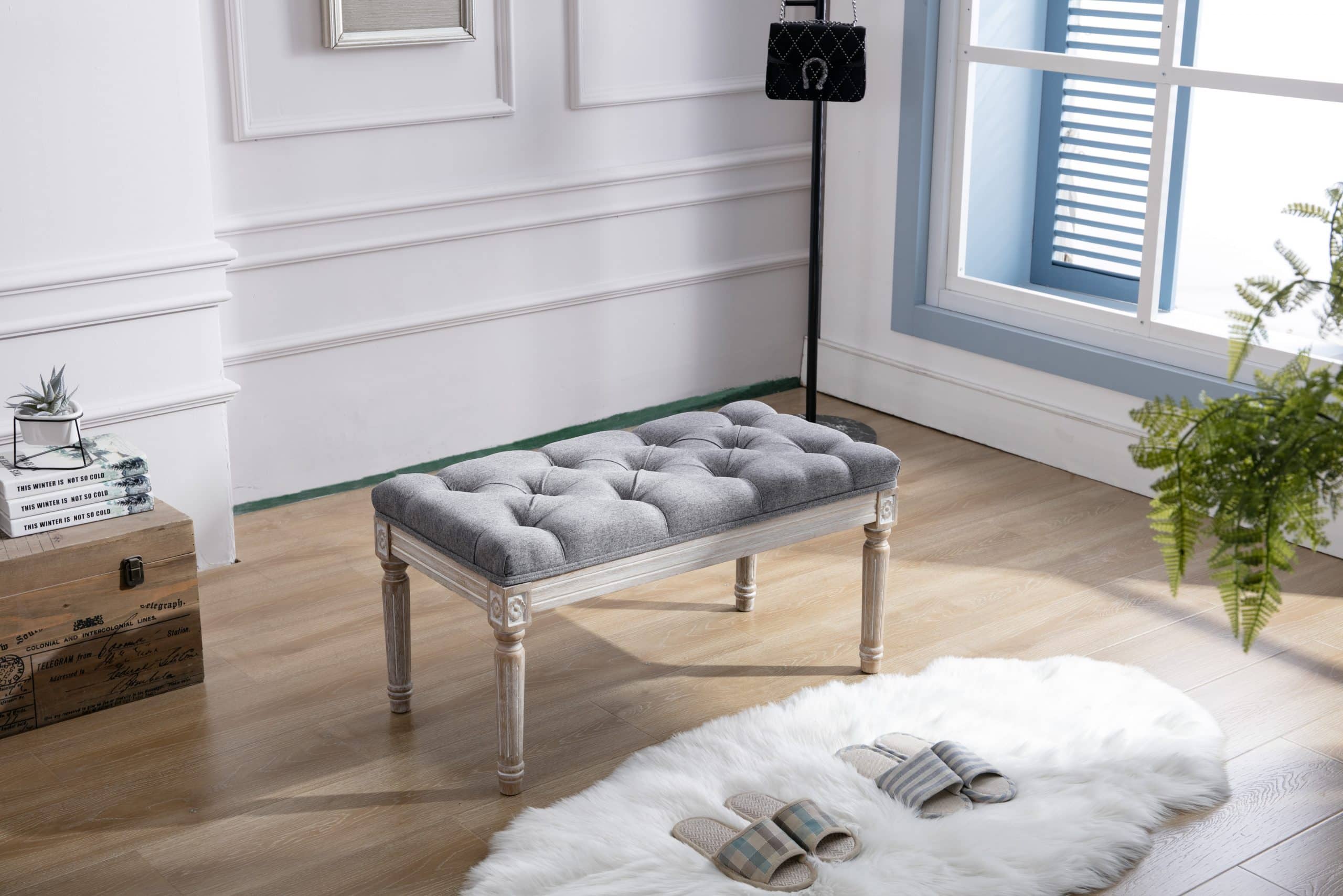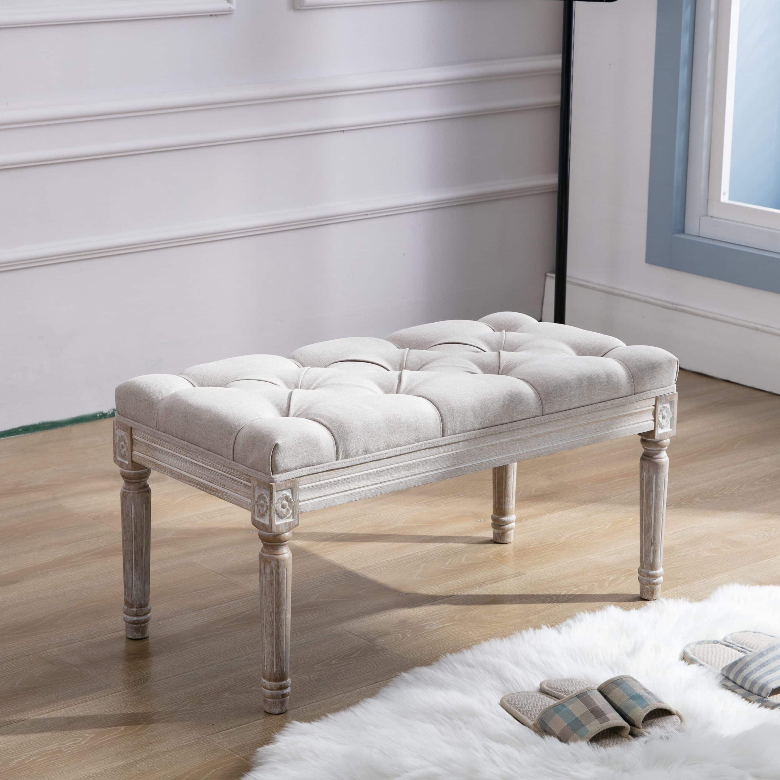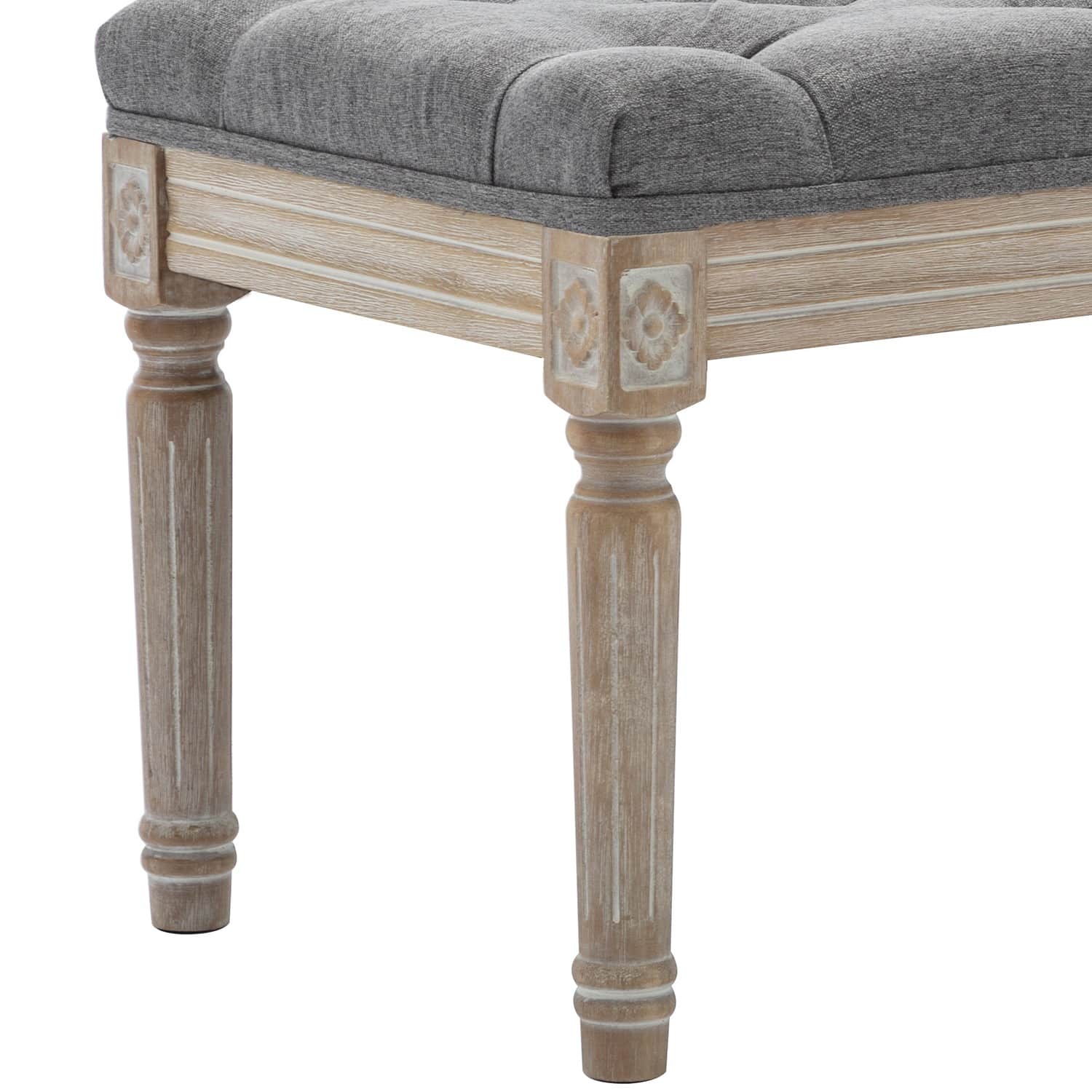 Add a tufted bench into your hall way or living room. Beautifully sculpted, this bench is available with two finishes; gray and taupe. The seats are tufted and padded. The bases are in a natural wood finish. Constructed with rubber wood, PU sponge, and polyester. Some assembly is required.