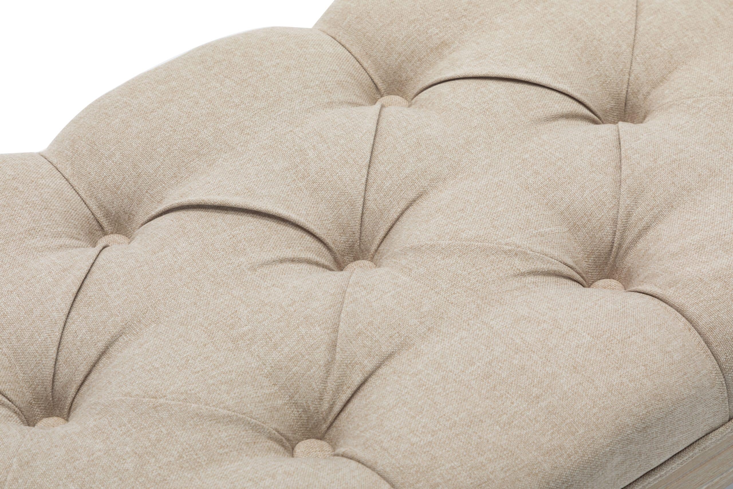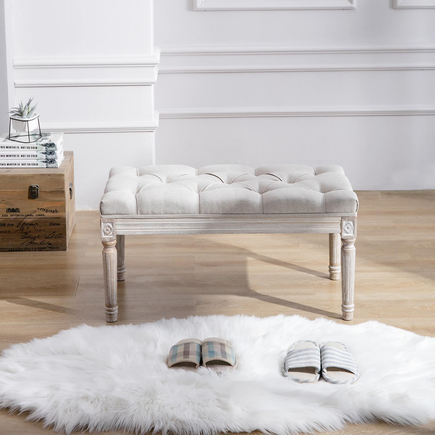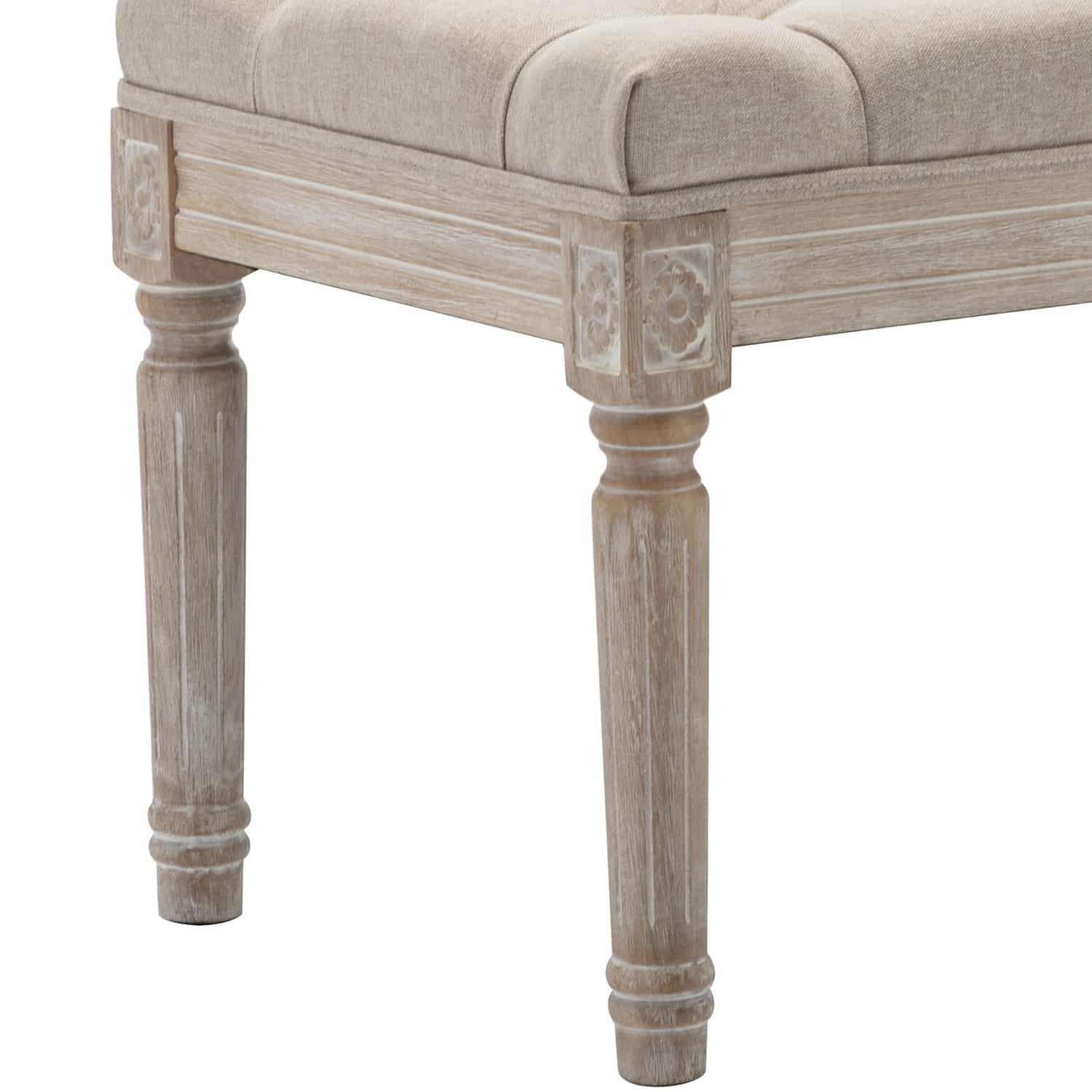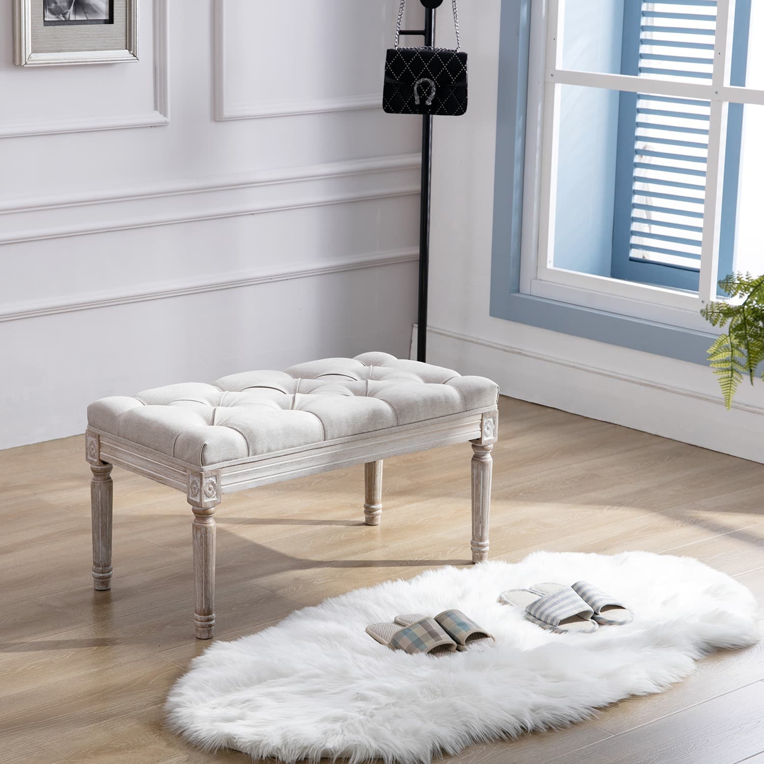 Add a tufted bench into your hall way or living room. Beautifully sculpted, this bench is available with two finishes; gray and taupe. The seats are tufted and padded. The bases are in a natural wood finish. Constructed with rubber wood, PU sponge, and polyester. Some assembly is required.