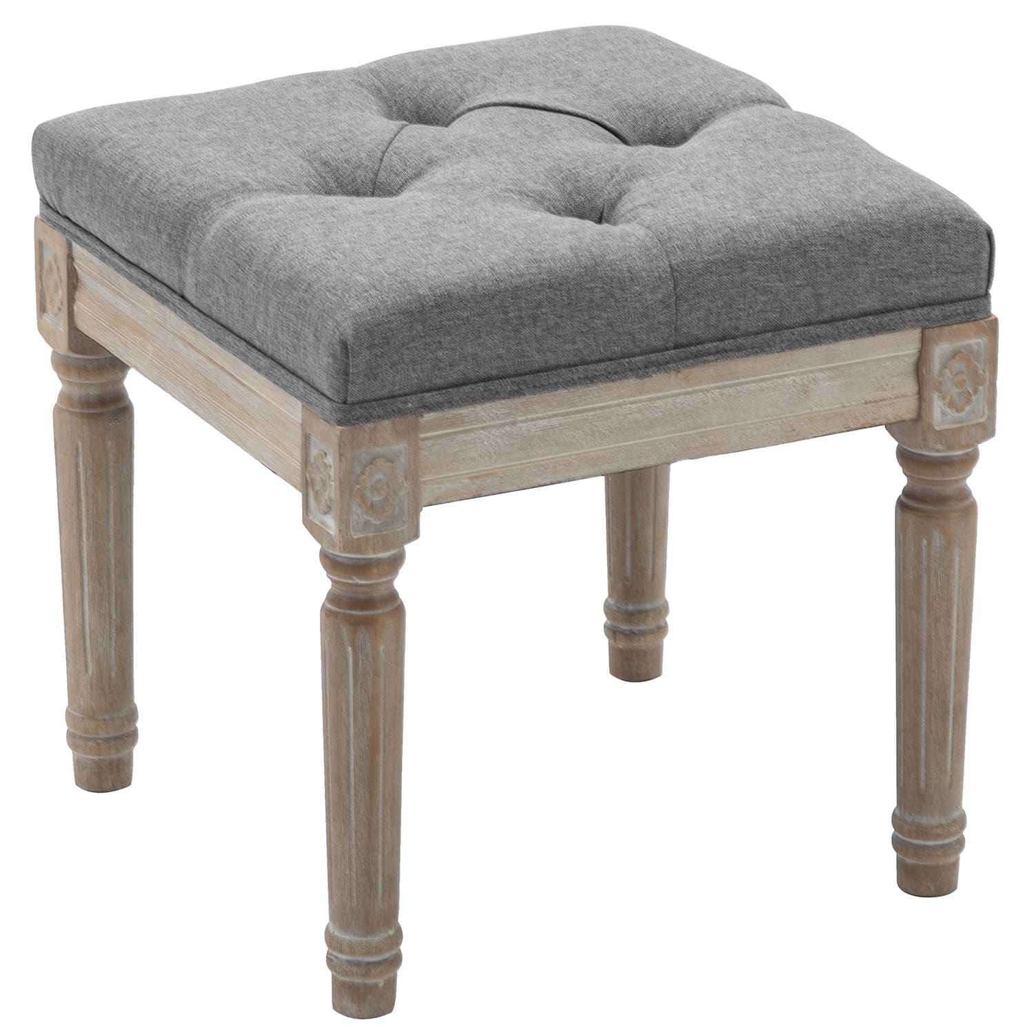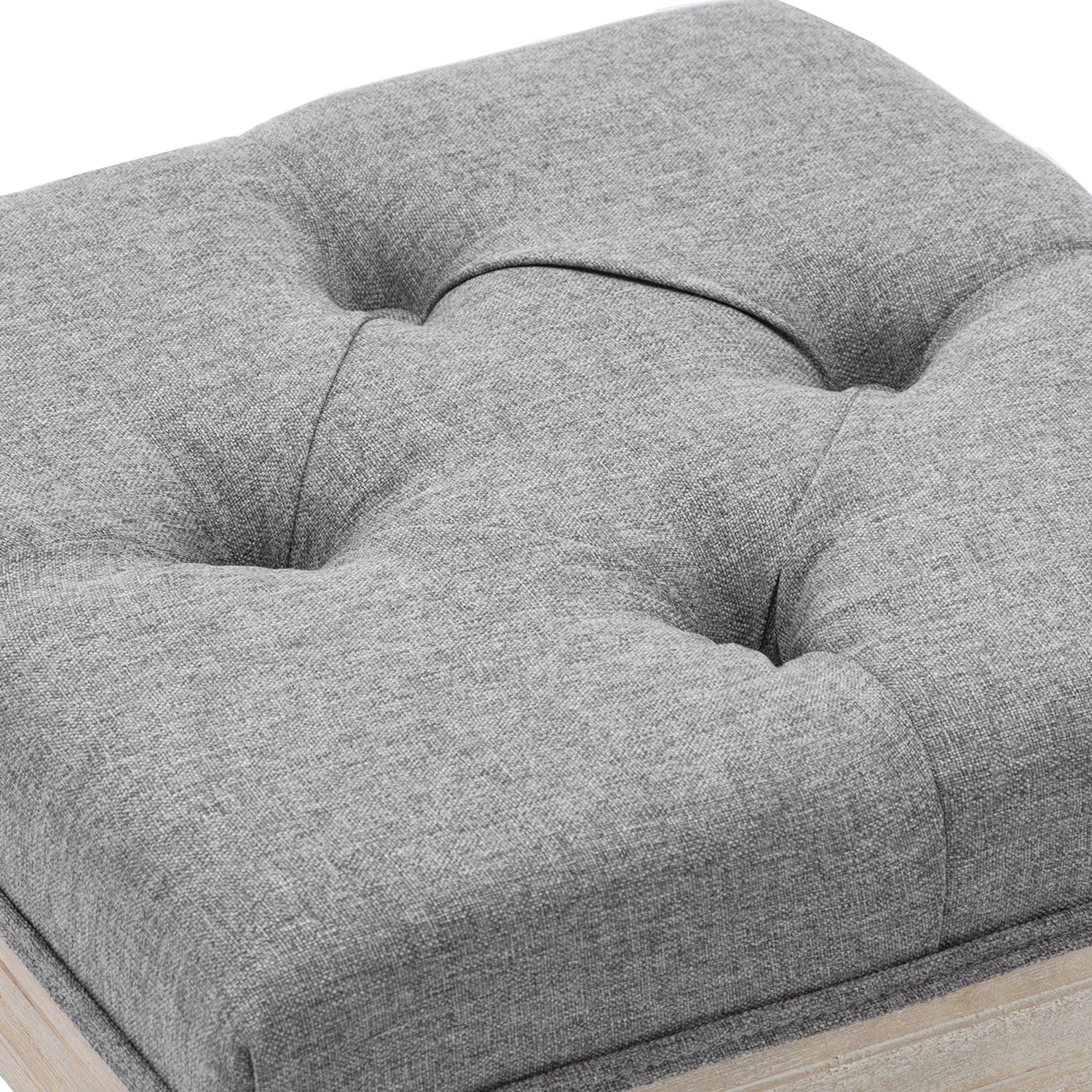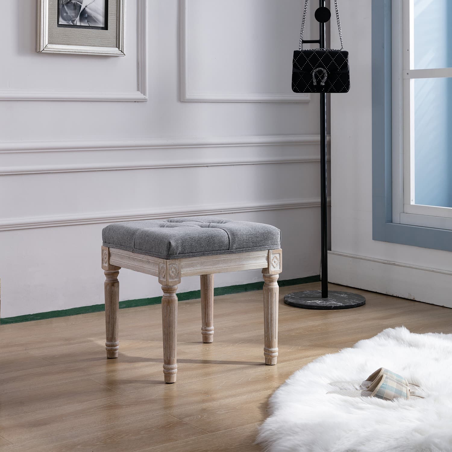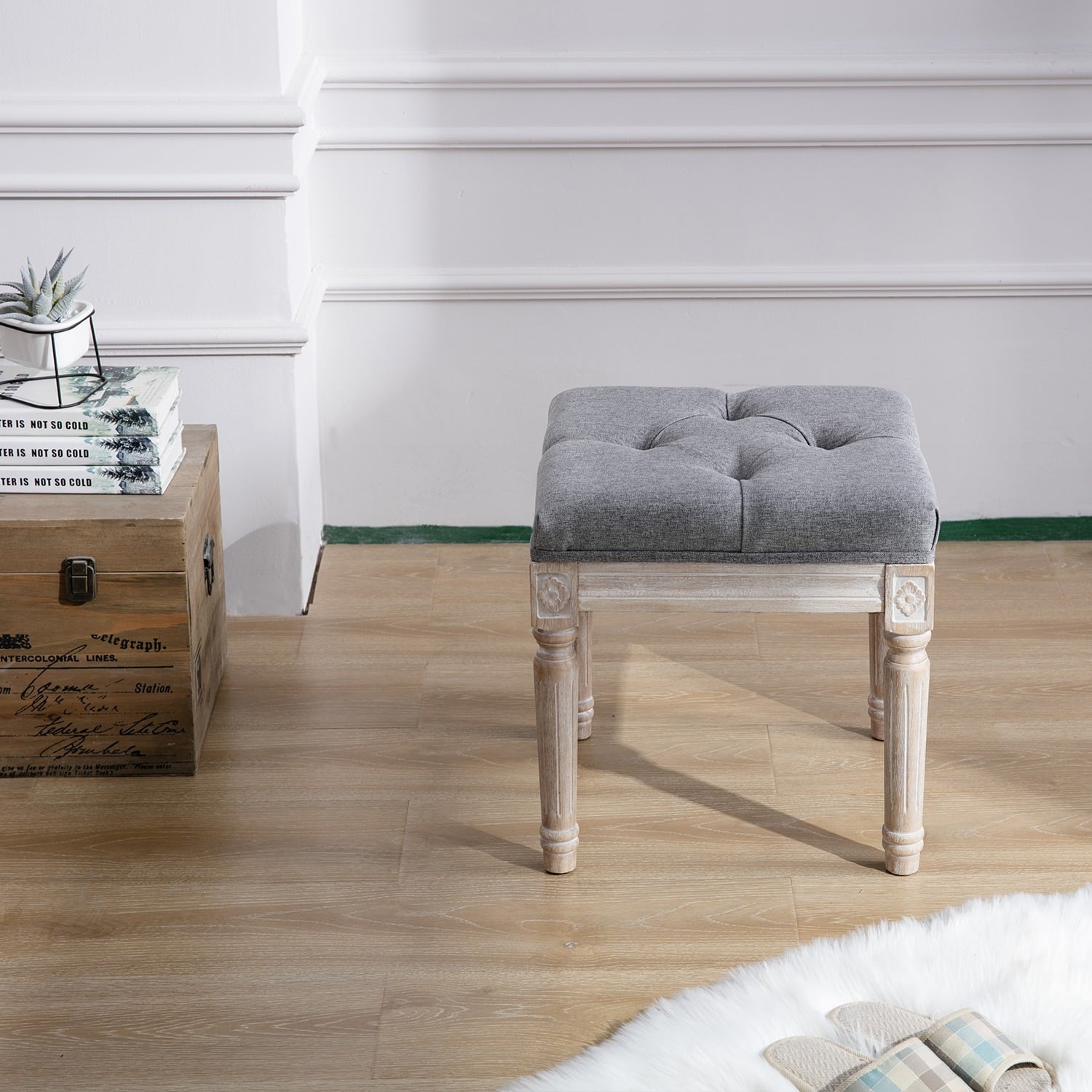 Square tufted footrest brings a nice touch into your living room and to pair with your furniture. Available in two finishes; gray and taupe. The bases for these stools are a natural wood color. These are constructed with rubber wood, PU sponge, and polyester. Only the seat is tufted and padded. Some assembly required.