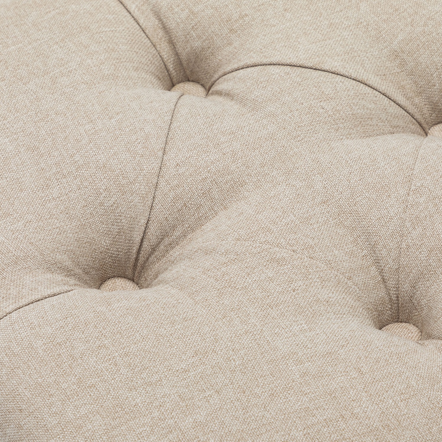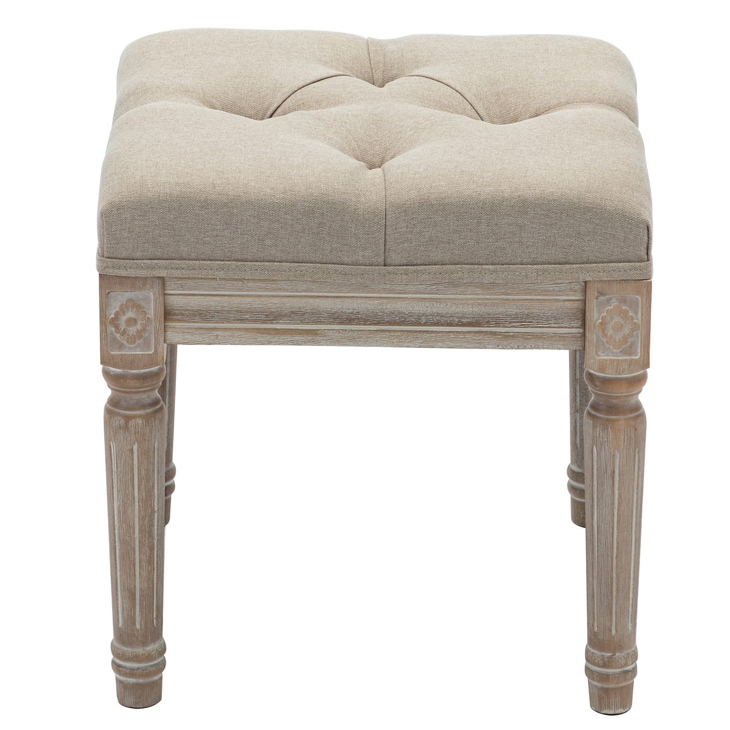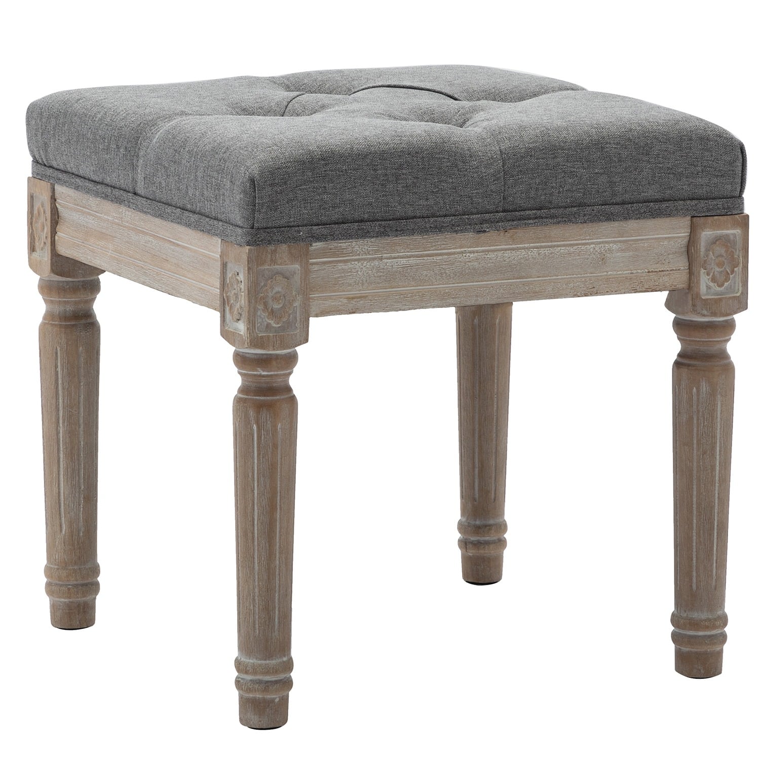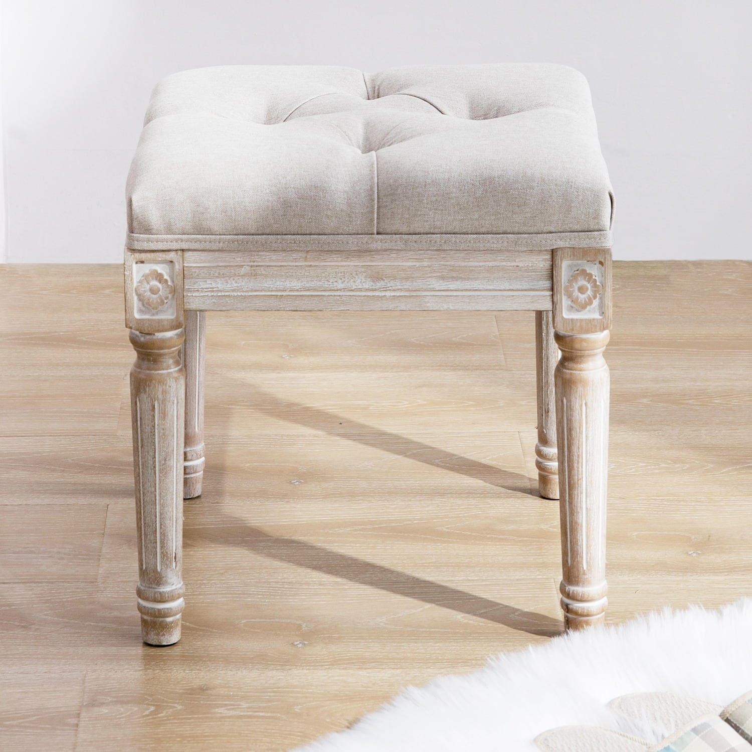 Square tufted footrest brings a nice touch into your living room and to pair with your furniture. Available in two finishes; gray and taupe. The bases for these stools are a natural wood color. These are constructed with rubber wood, PU sponge, and polyester. Only the seat is tufted and padded. Some assembly required.