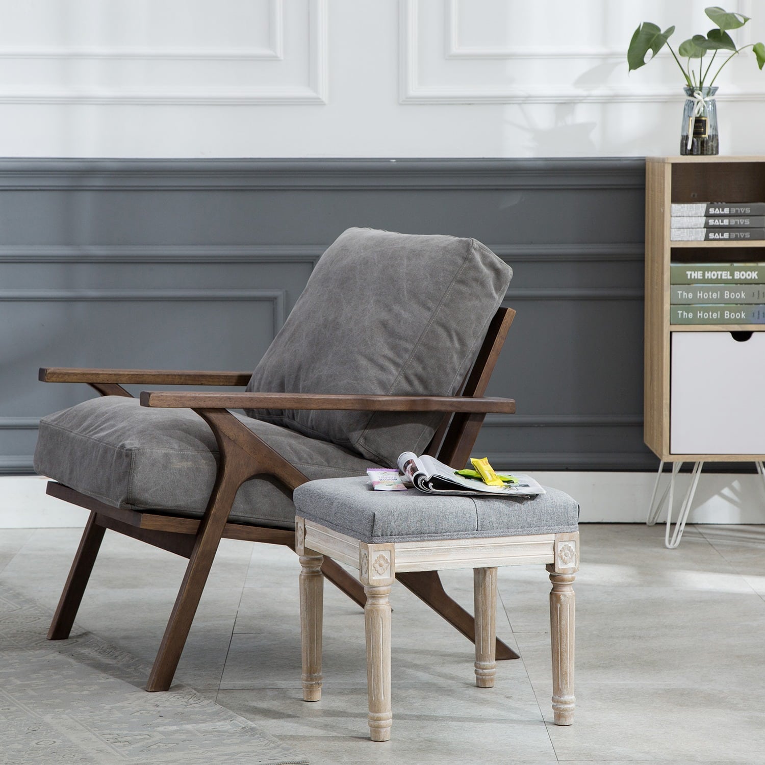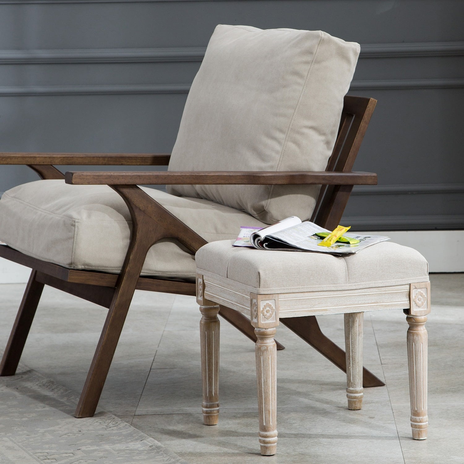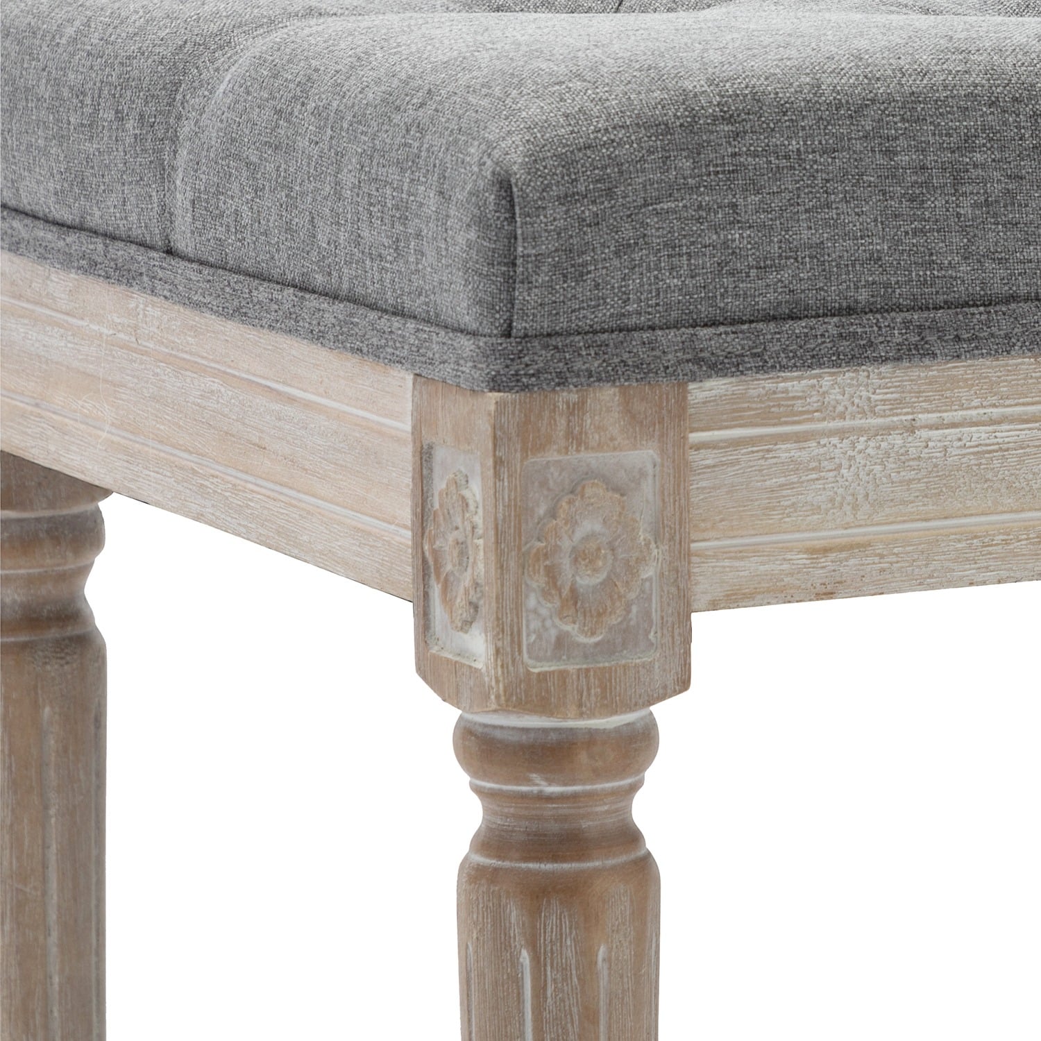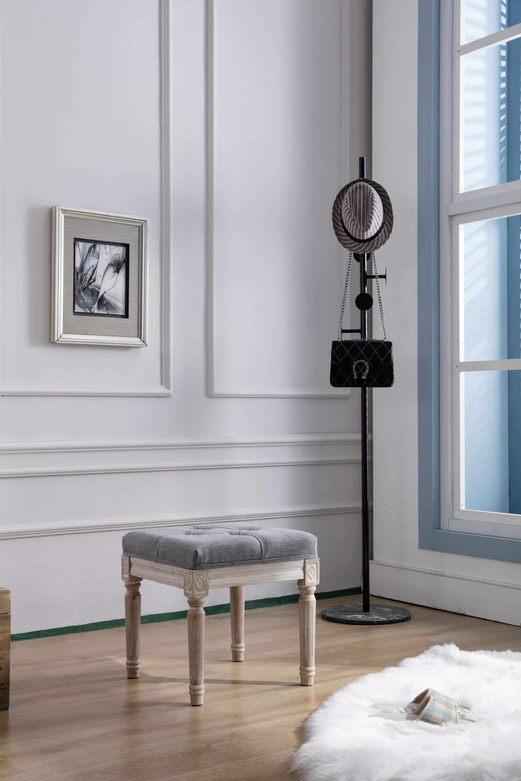 Square tufted footrest brings a nice touch into your living room and to pair with your furniture. Available in two finishes; gray and taupe. The bases for these stools are a natural wood color. These are constructed with rubber wood, PU sponge, and polyester. Only the seat is tufted and padded. Some assembly required.
