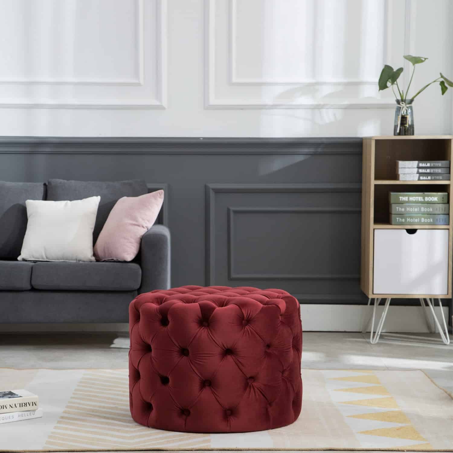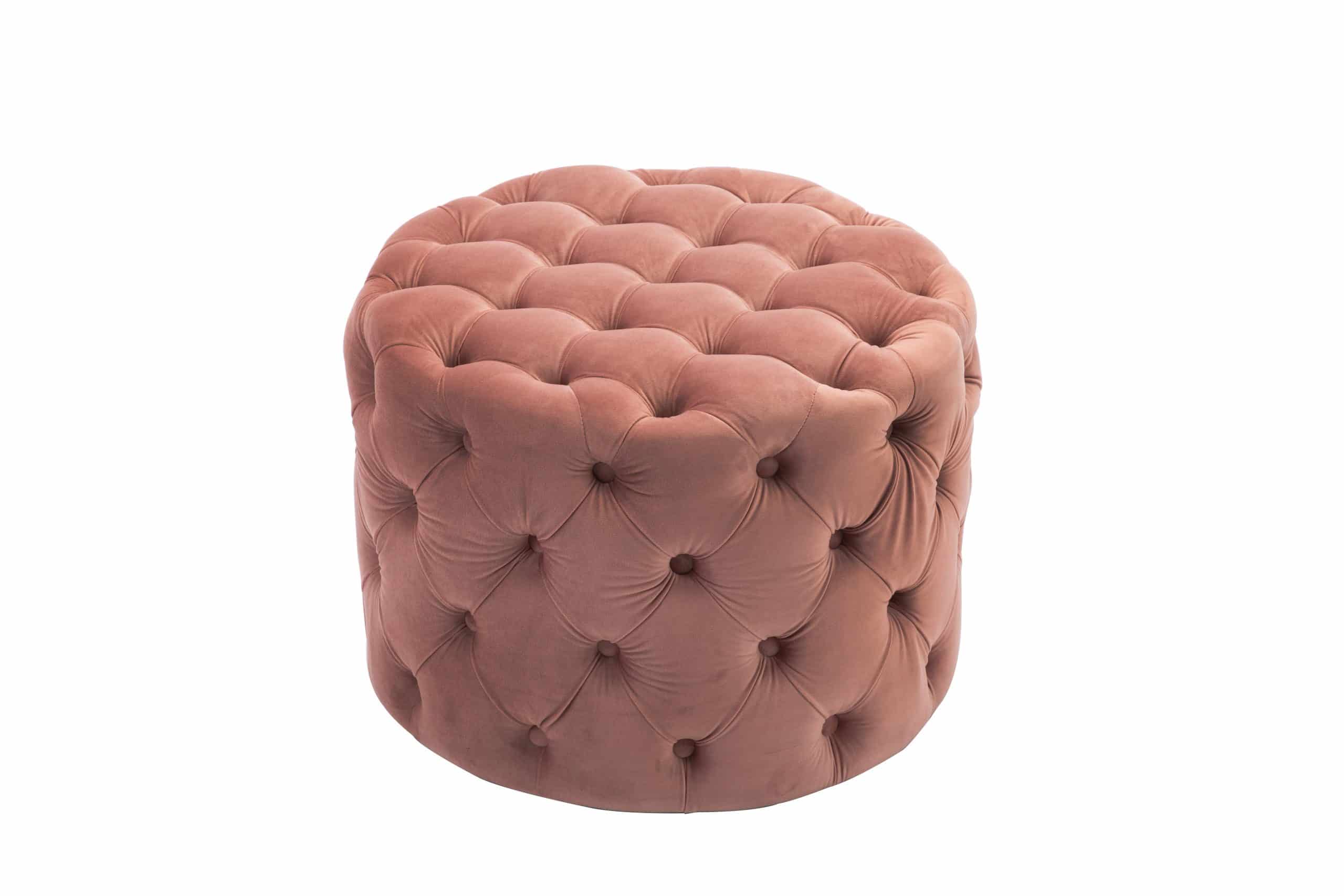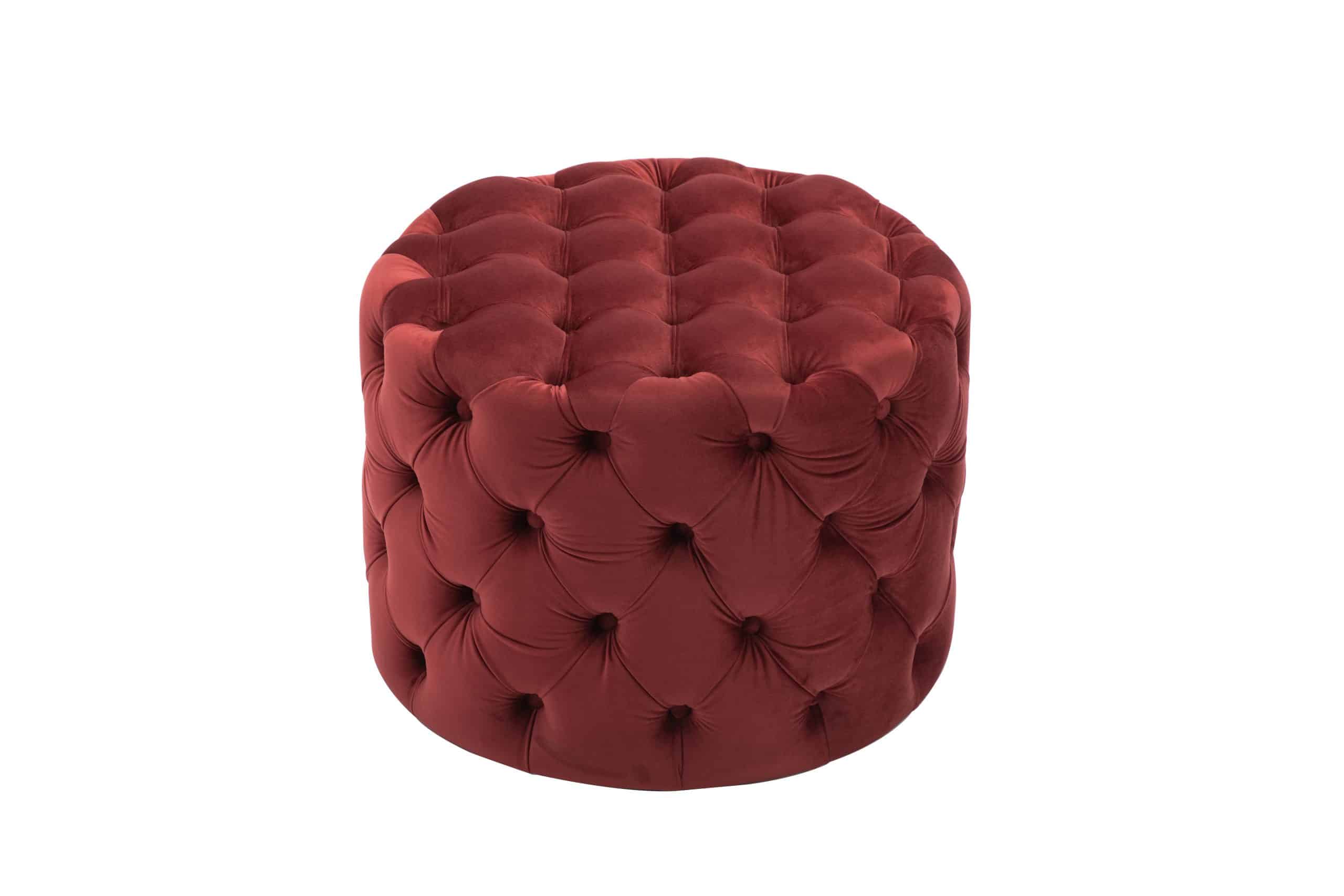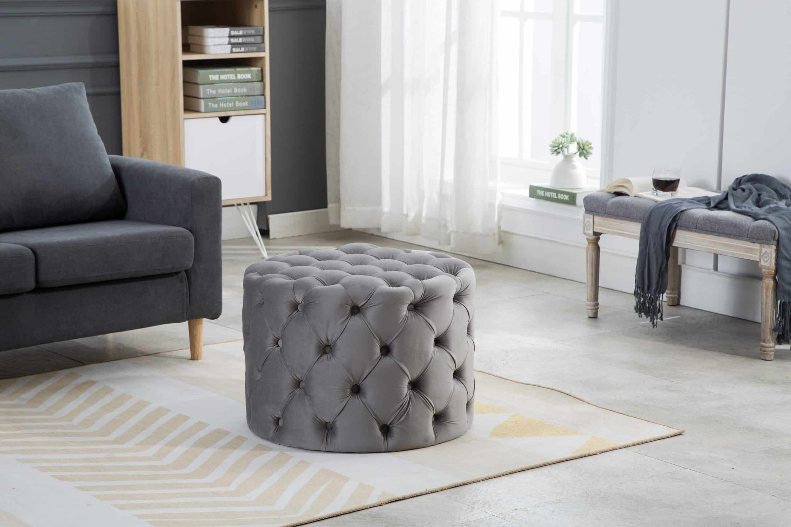 This Tufted Ottoman is available in four finishes; blue, gray, pink, and red. It is constructed with flannel and sponge. It is tufted all around the ottoman, and has perfect padding to sit on or rest your feet up on after a long day. There is no assembly required.