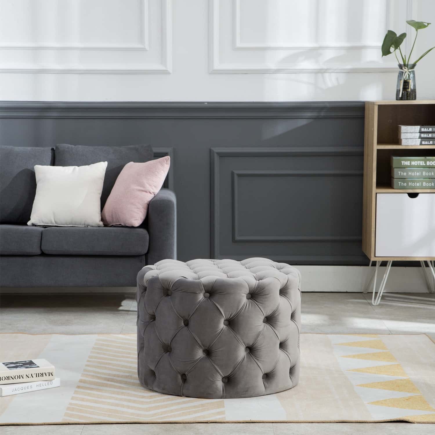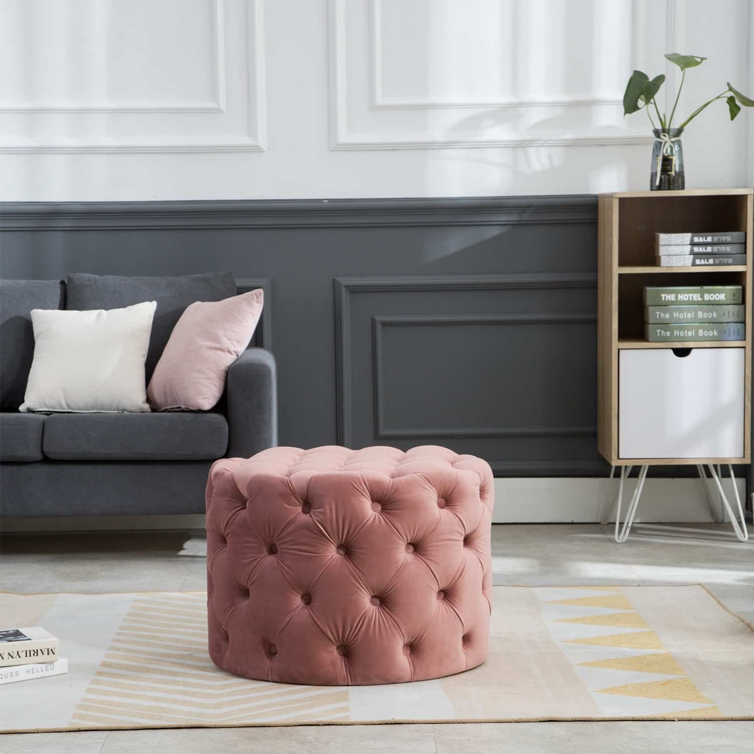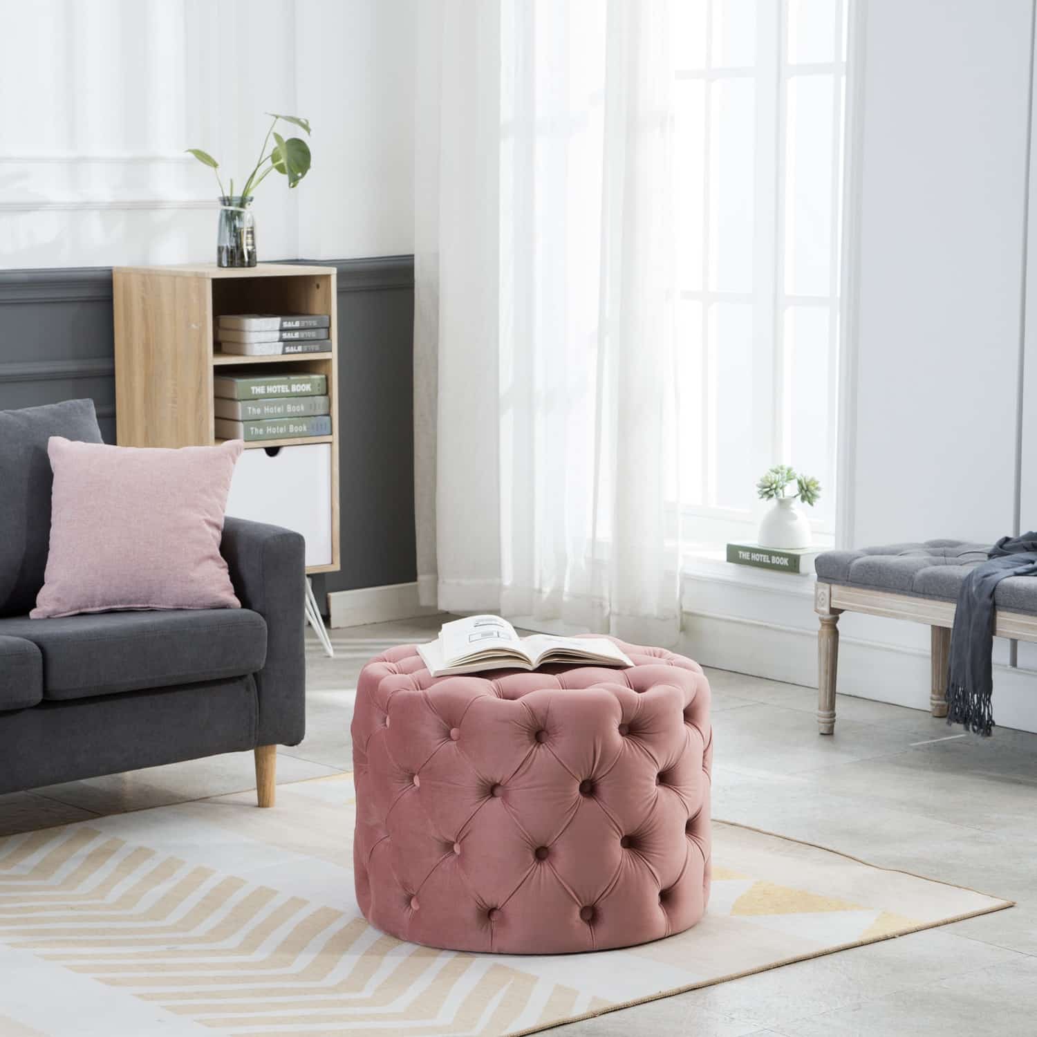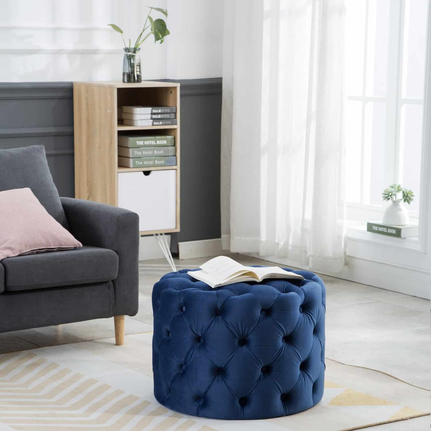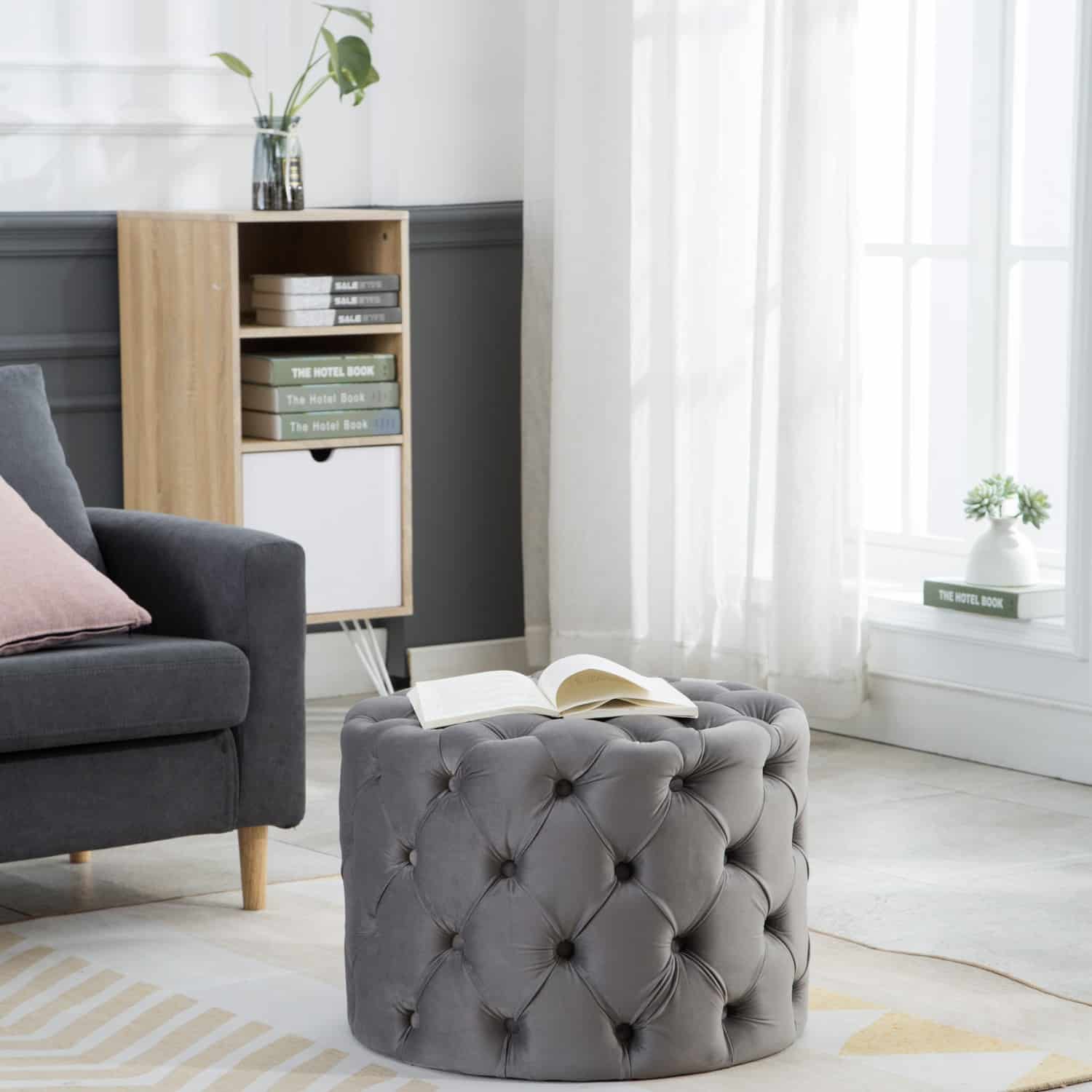 This Tufted Ottoman is available in four finishes; blue, gray, pink, and red. It is constructed with flannel and sponge. It is tufted all around the ottoman, and has perfect padding to sit on or rest your feet up on after a long day. There is no assembly required.