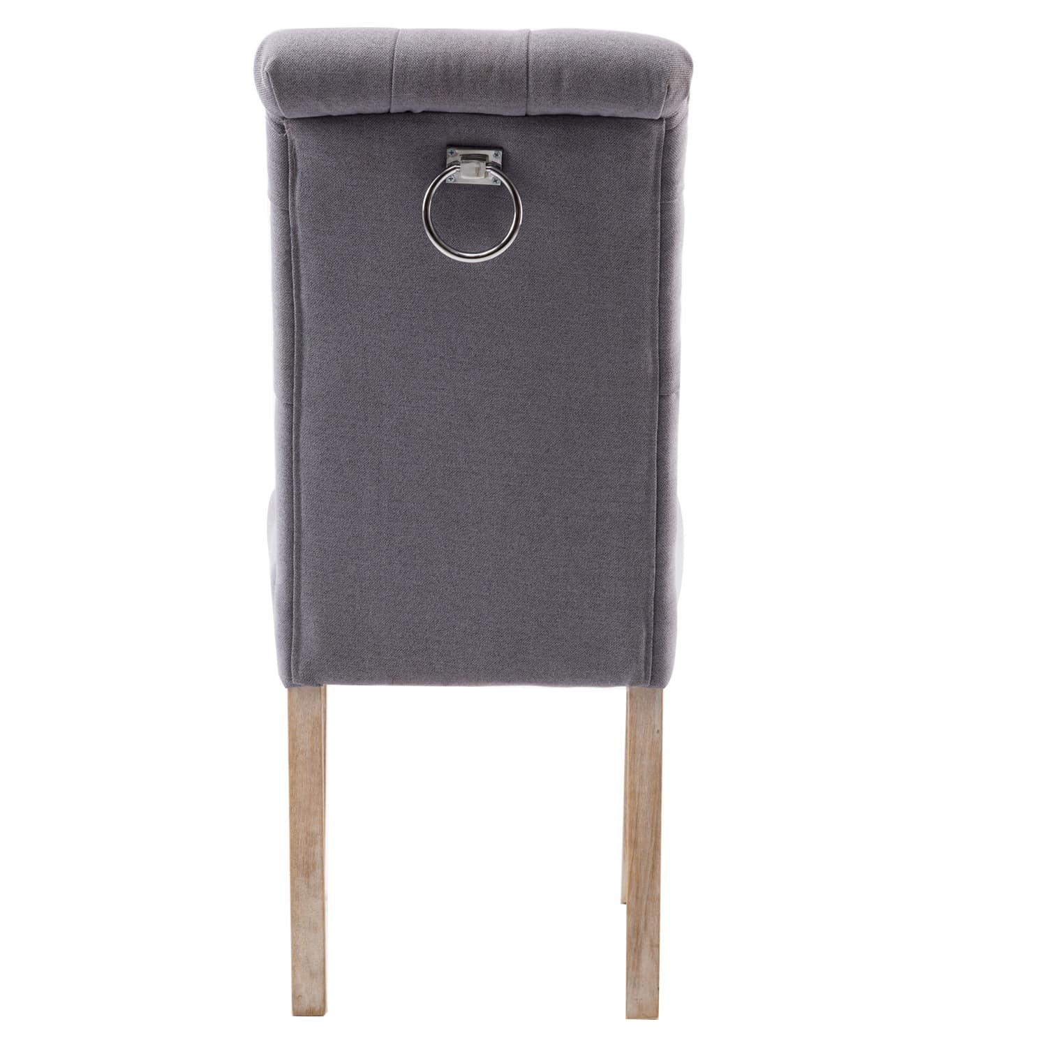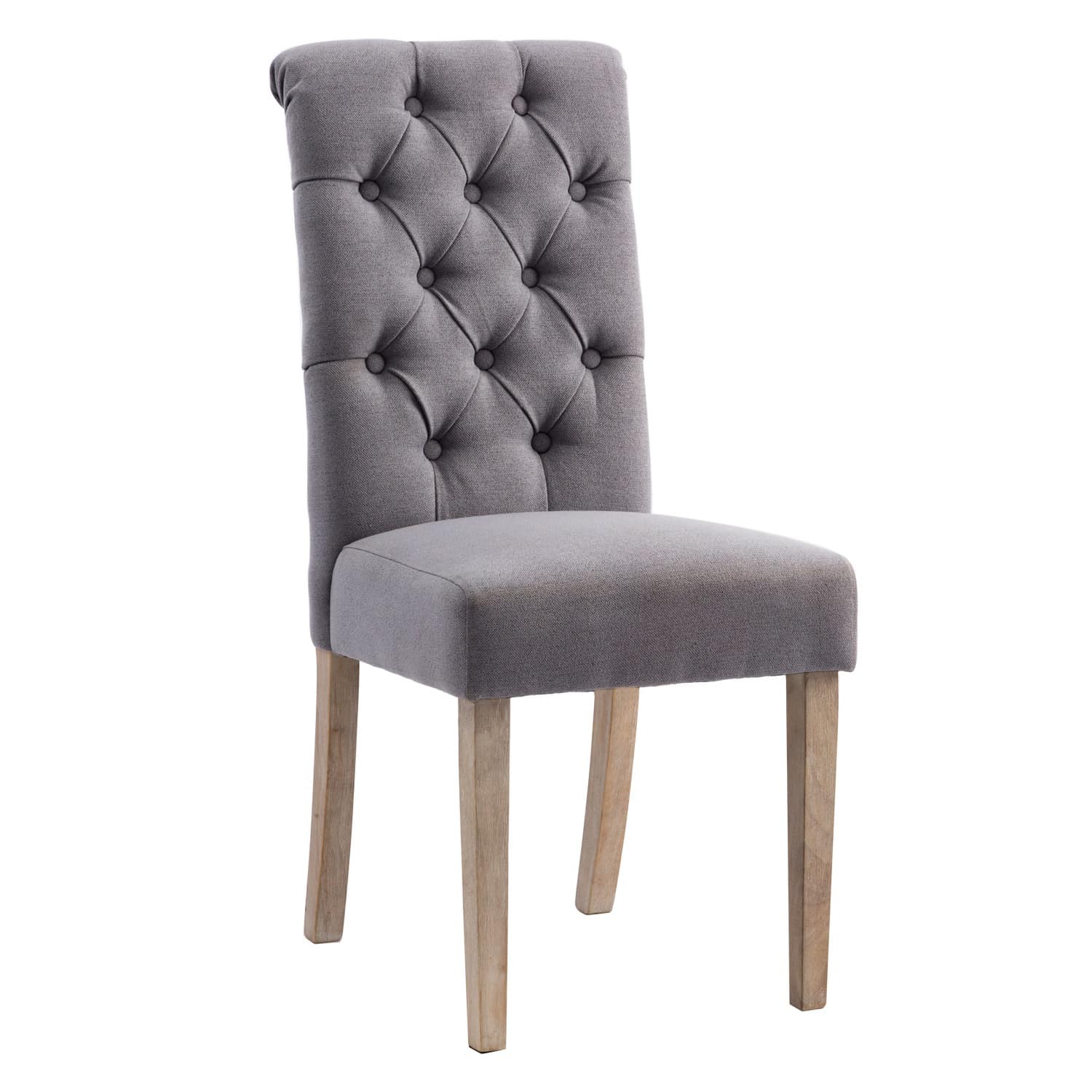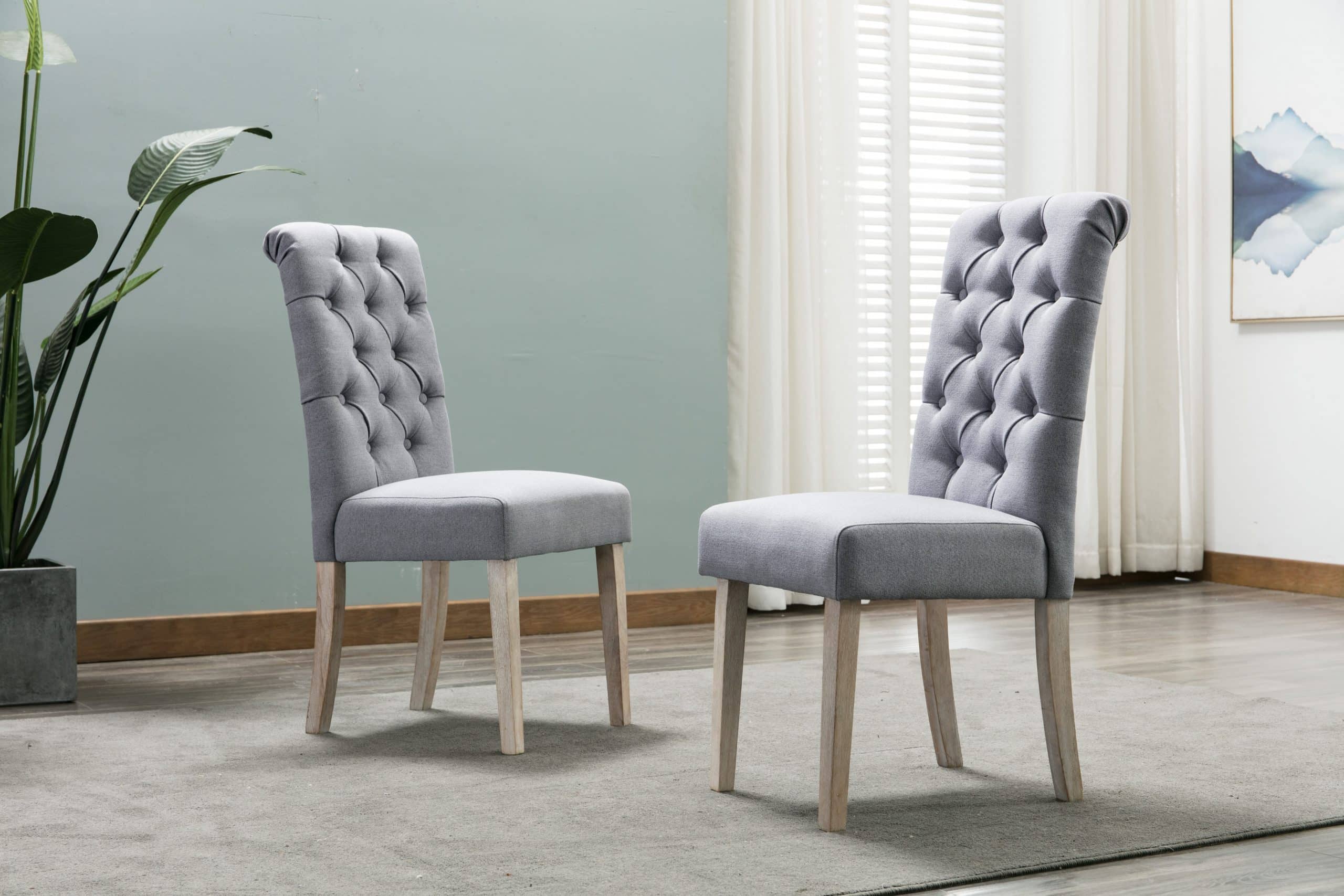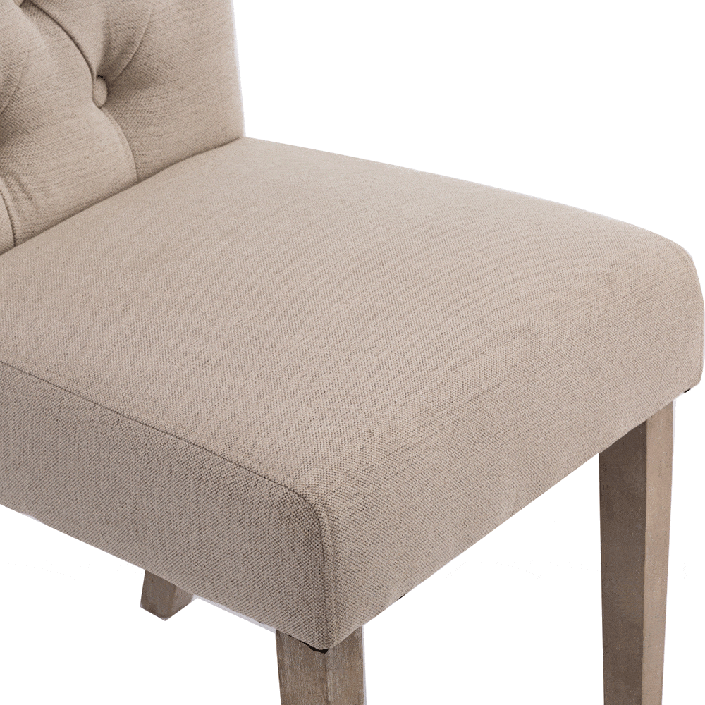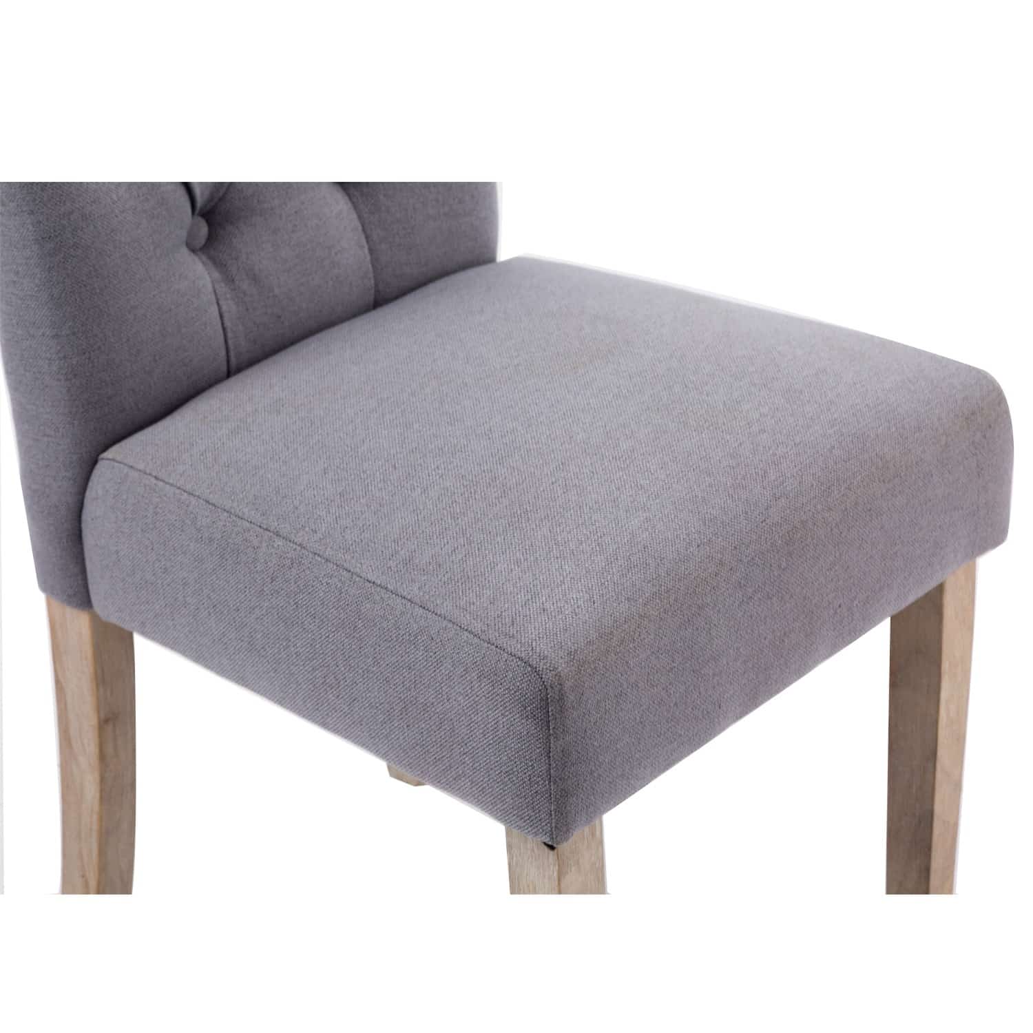 Available in two finishes; beige and gray. Comes as a set of 2. Upholstered and tufted backrest. Made with rubberwood and polyester.