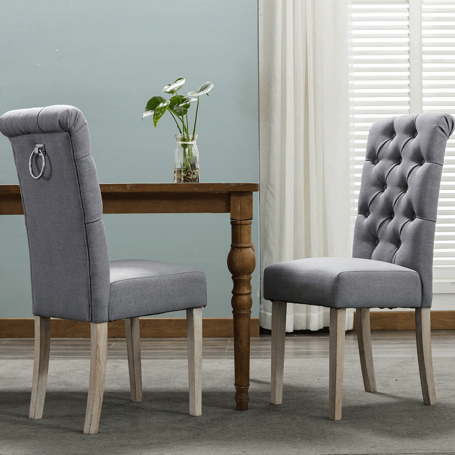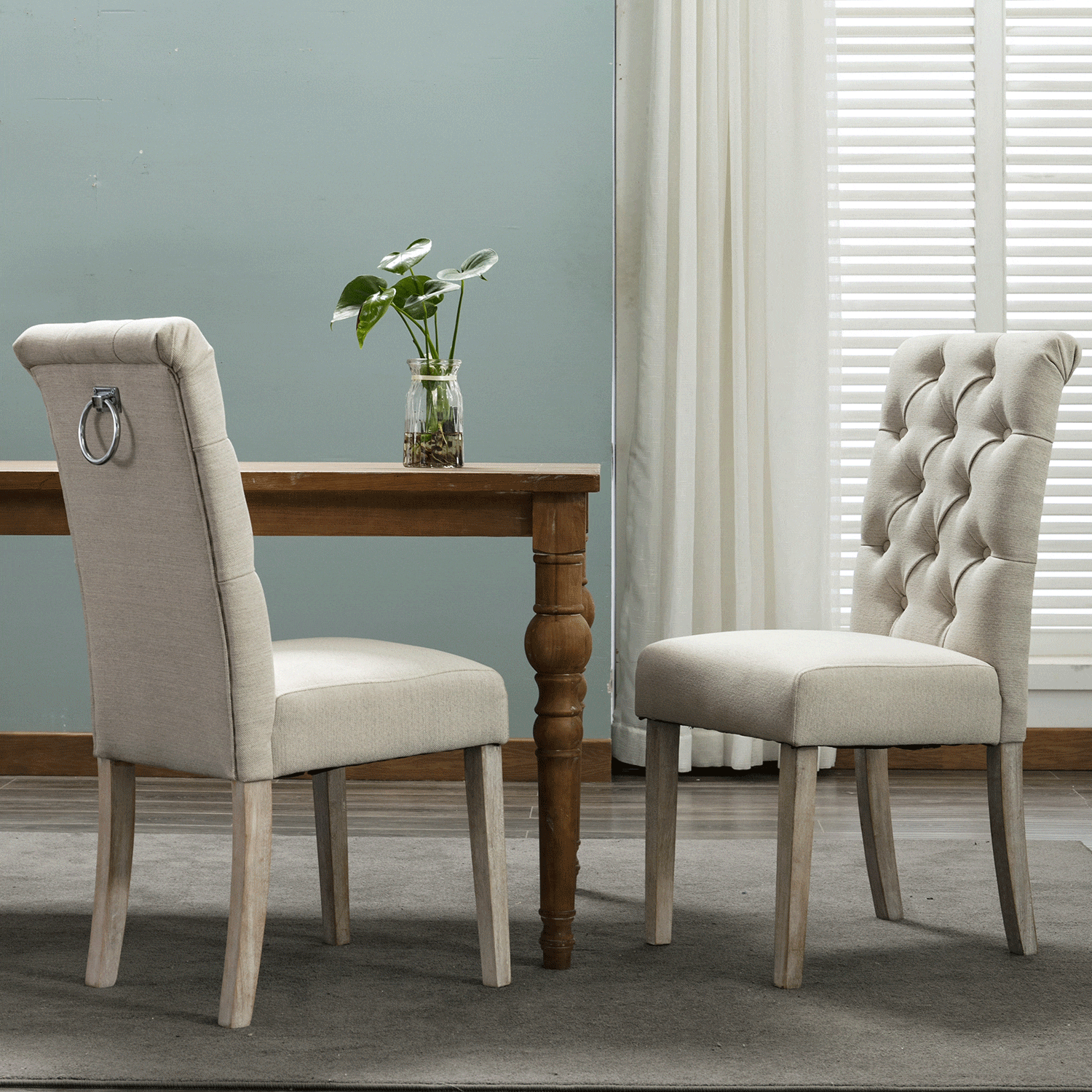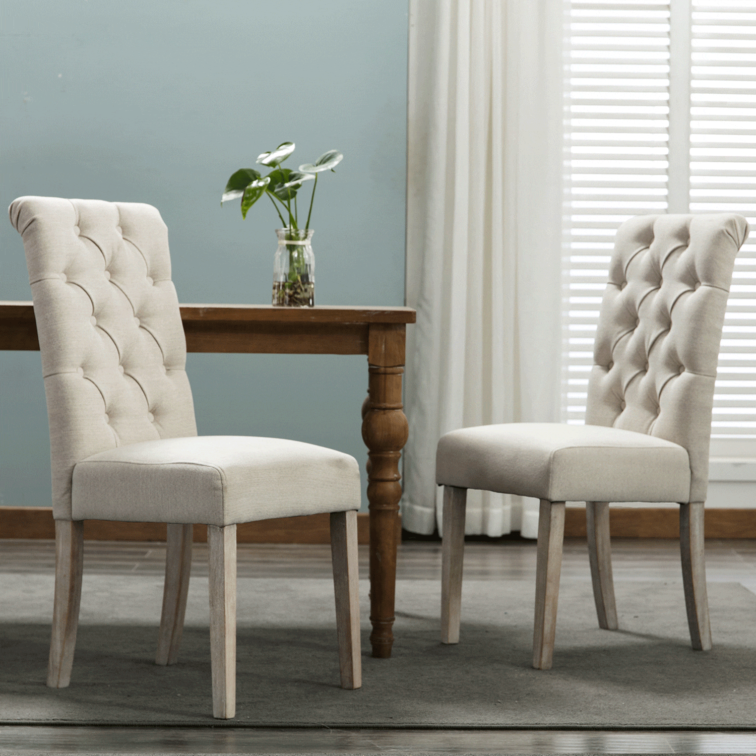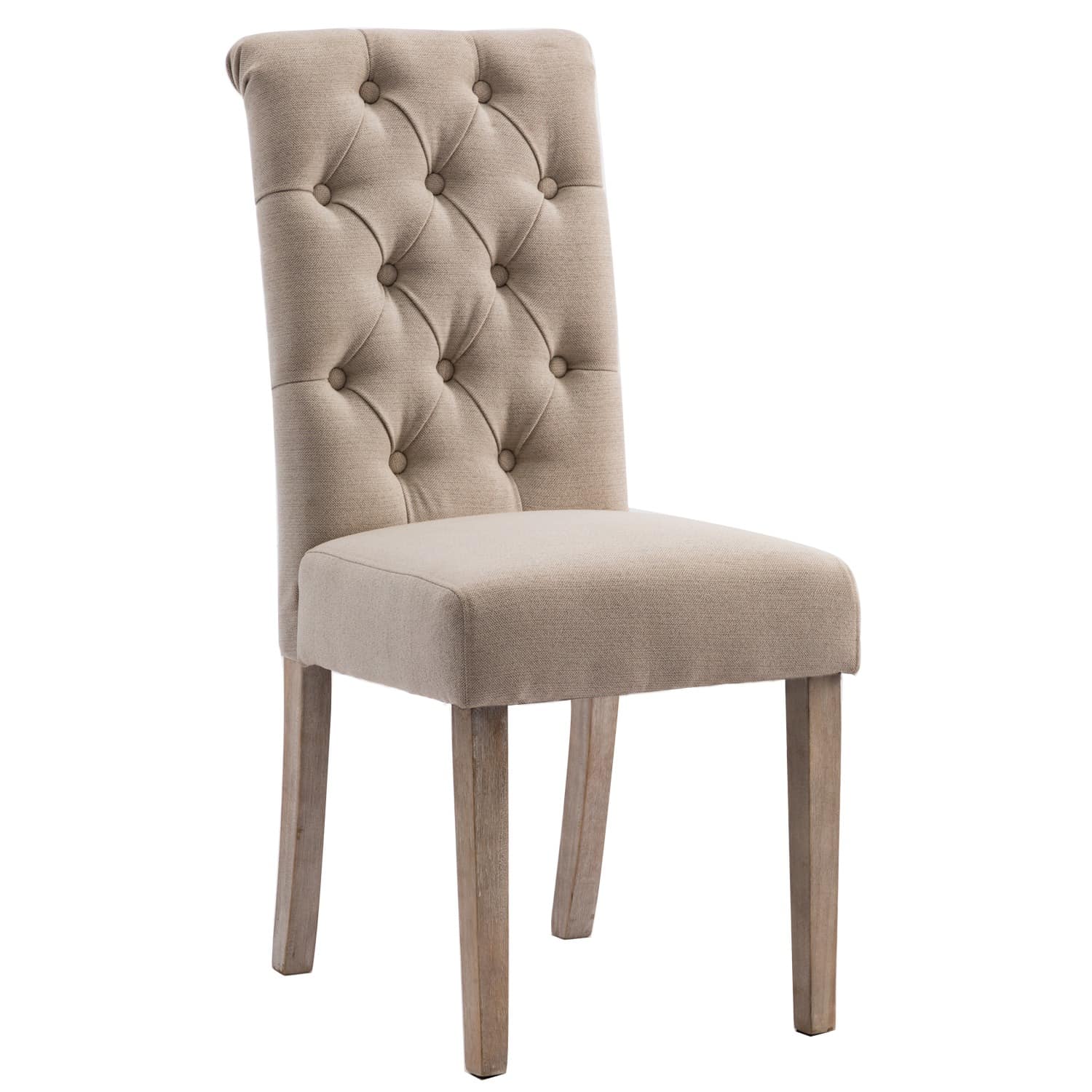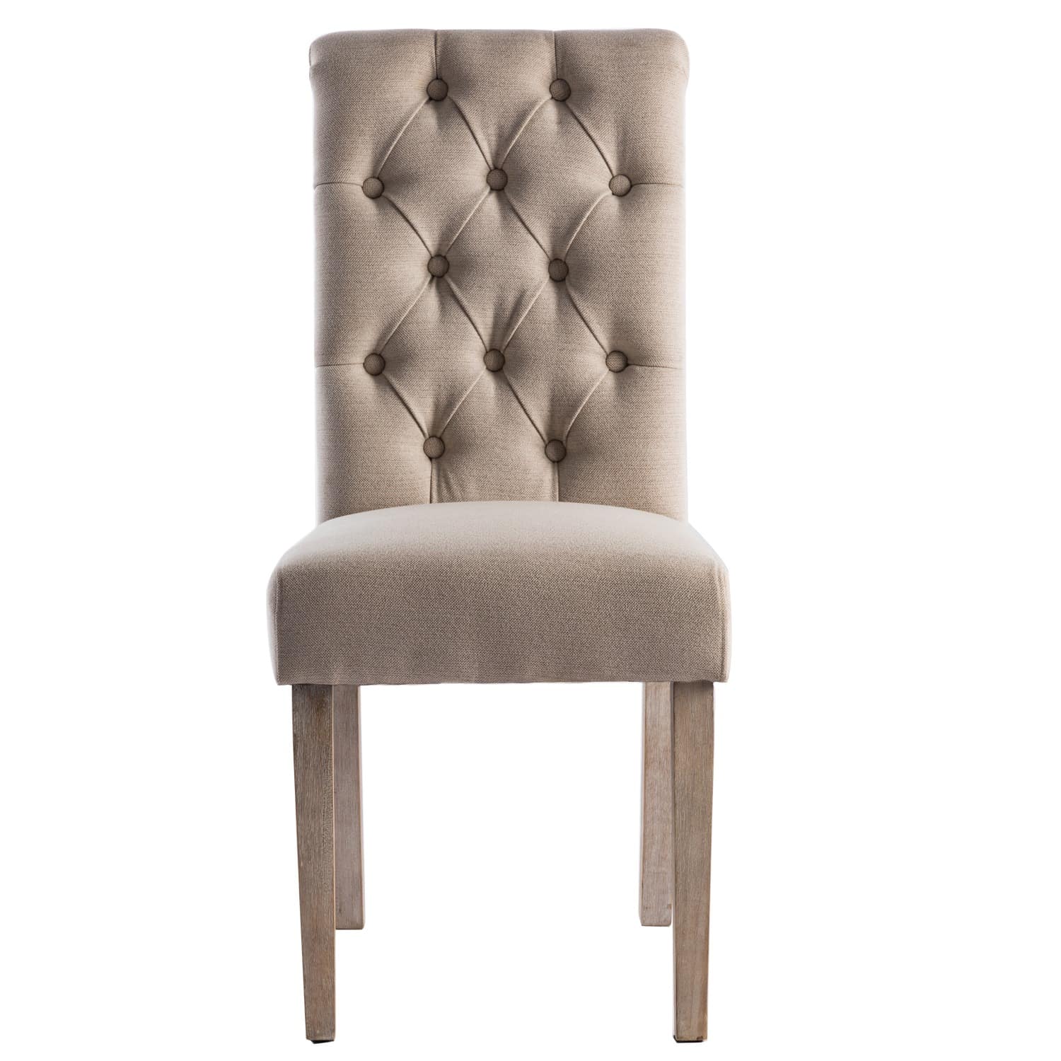 Available in two finishes; beige and gray. Comes as a set of 2. Upholstered and tufted backrest. Made with rubberwood and polyester.