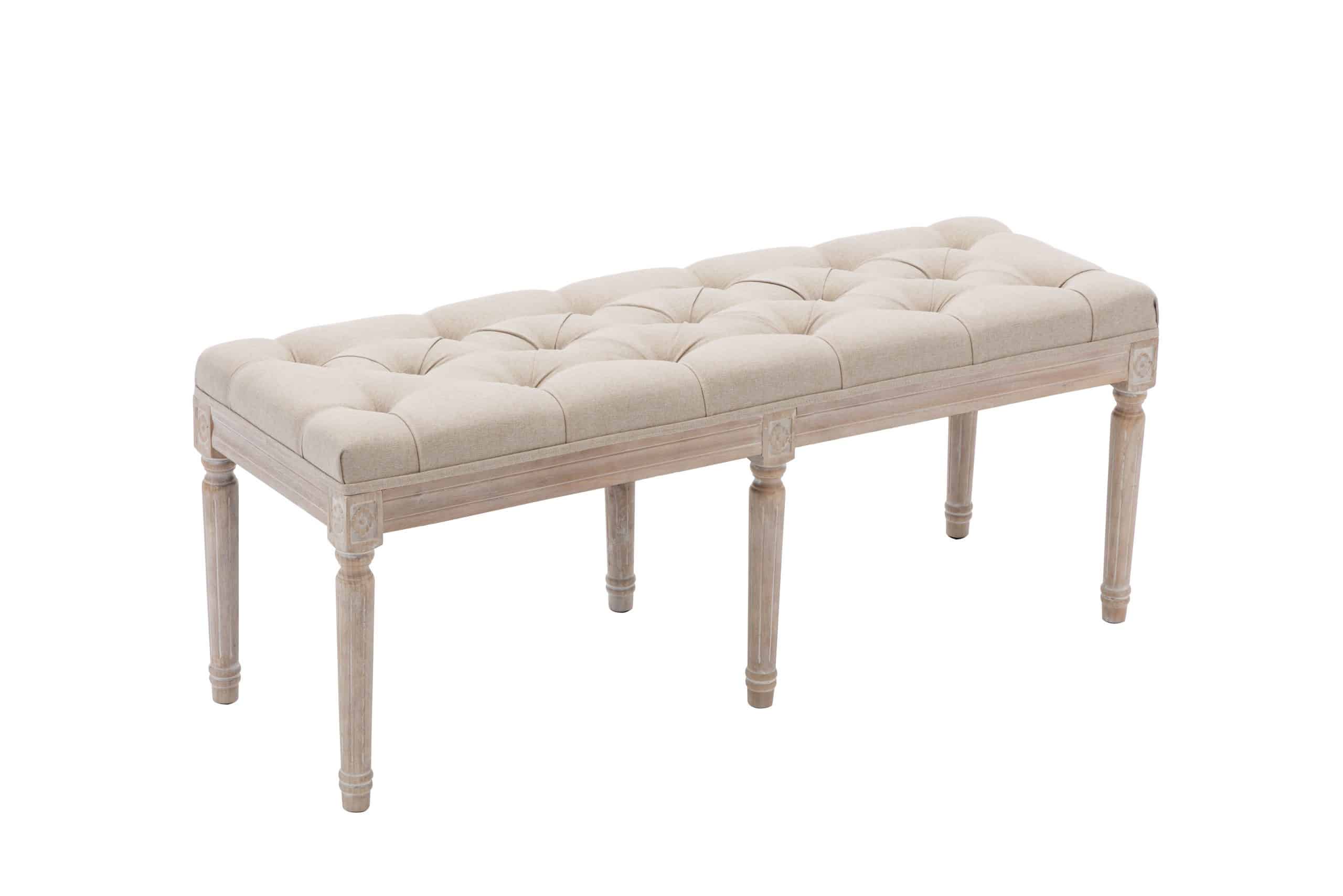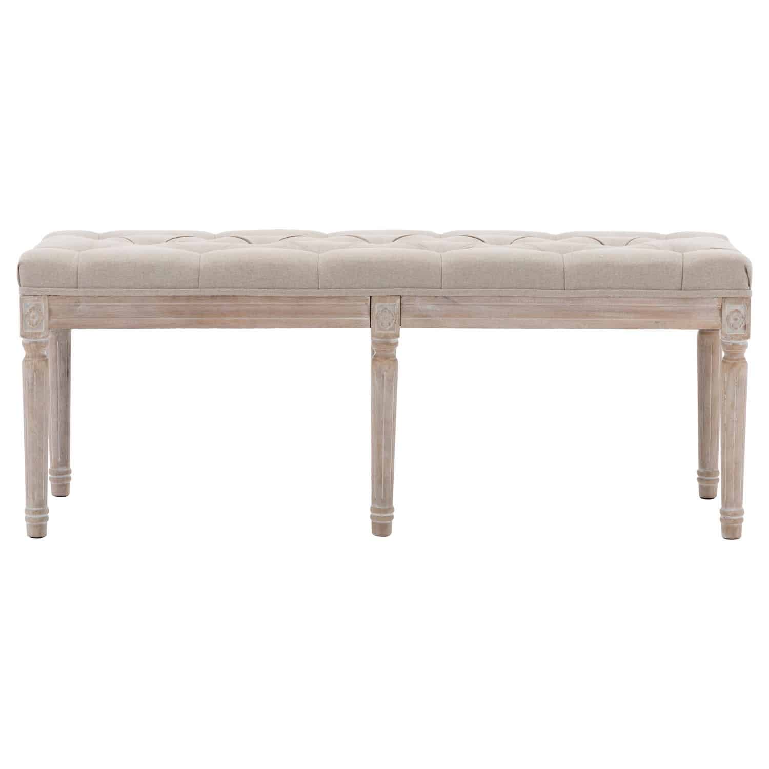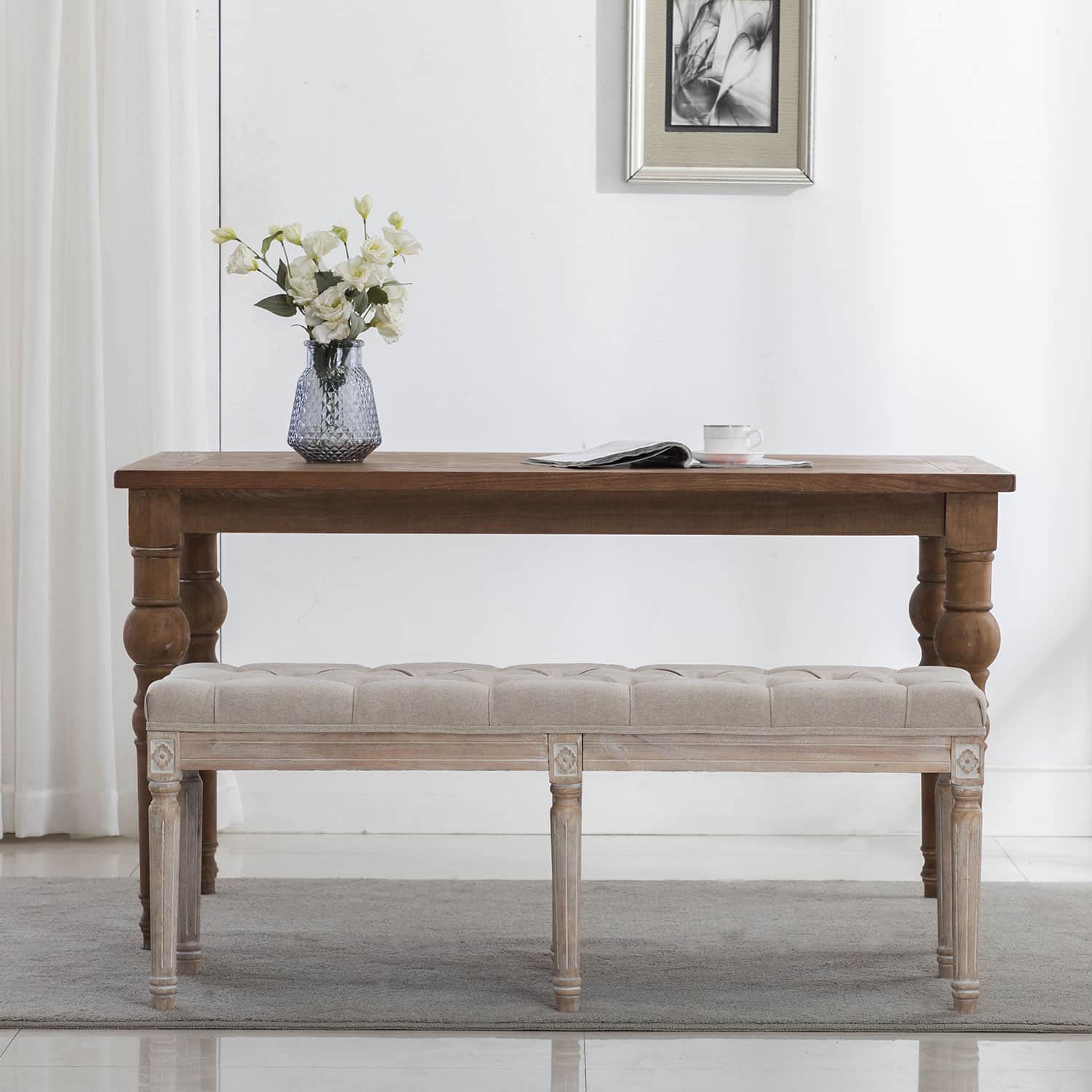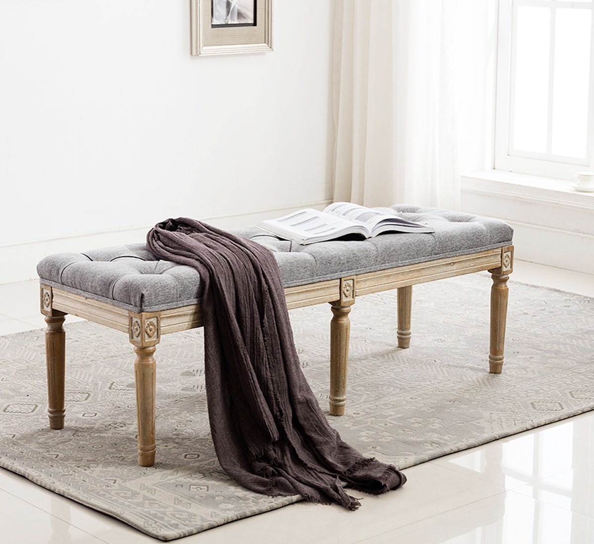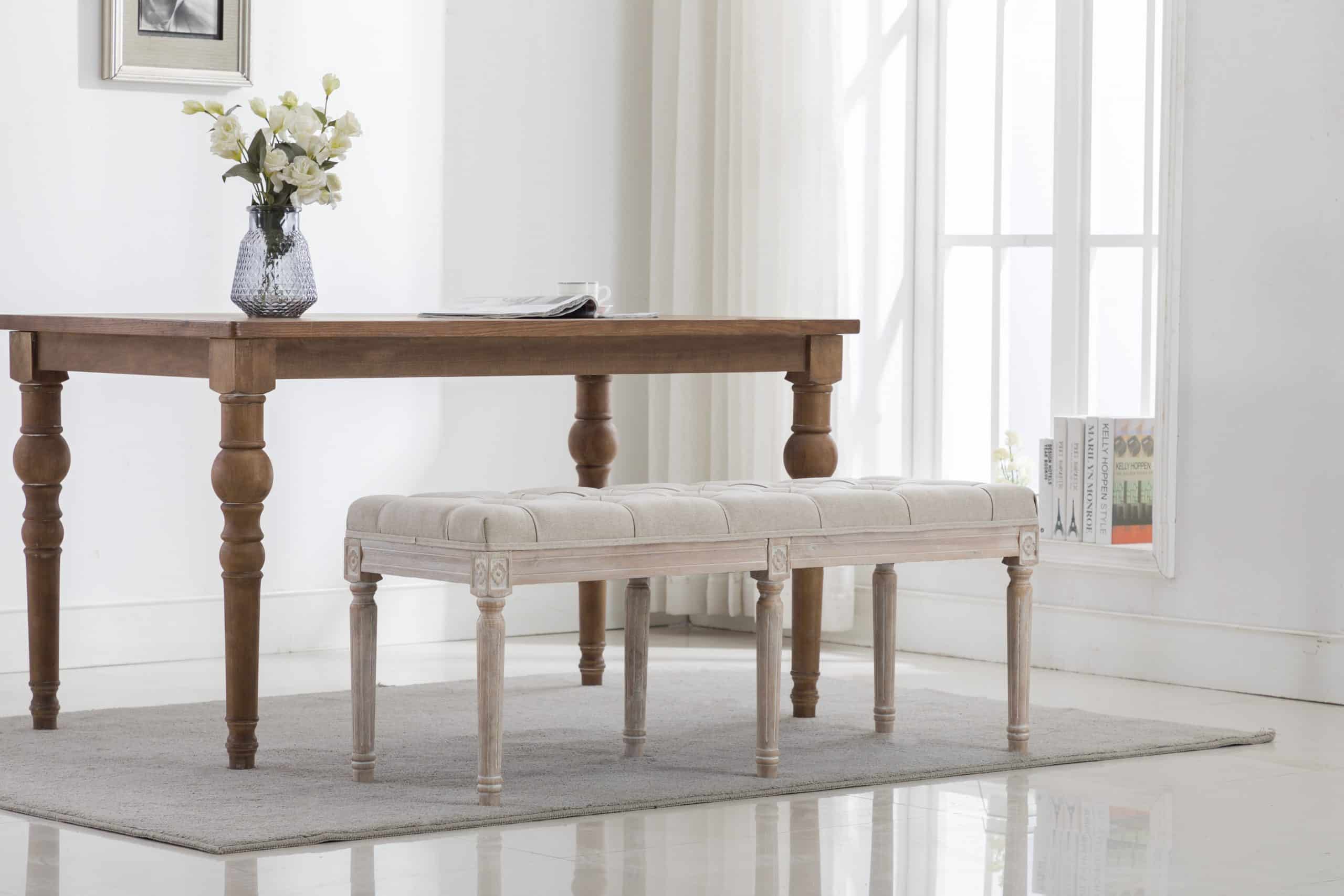Comes in two finished; gray and beige. Made with Rubber Wood, Polyurethane sponge and Polyester. Dining height bench.