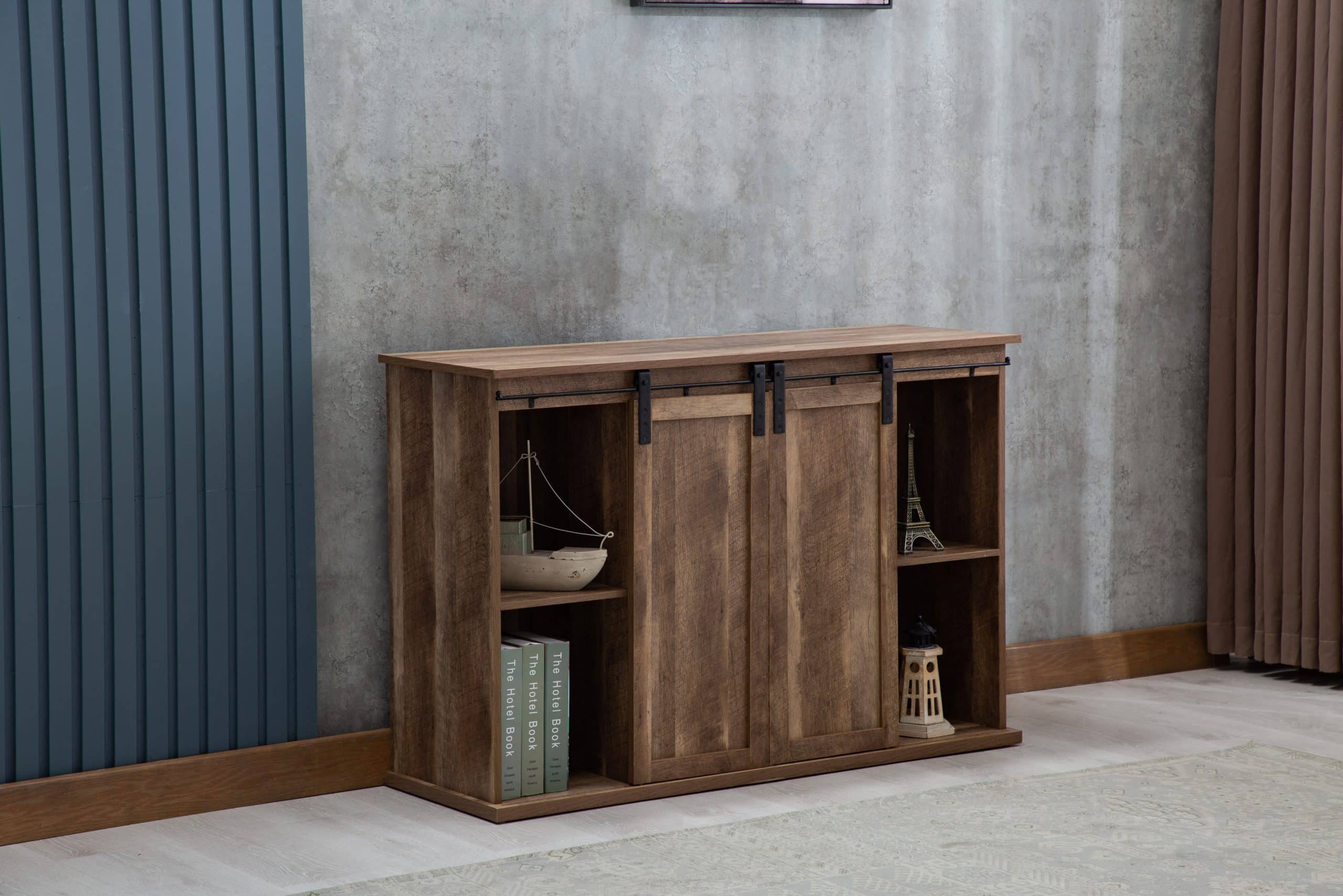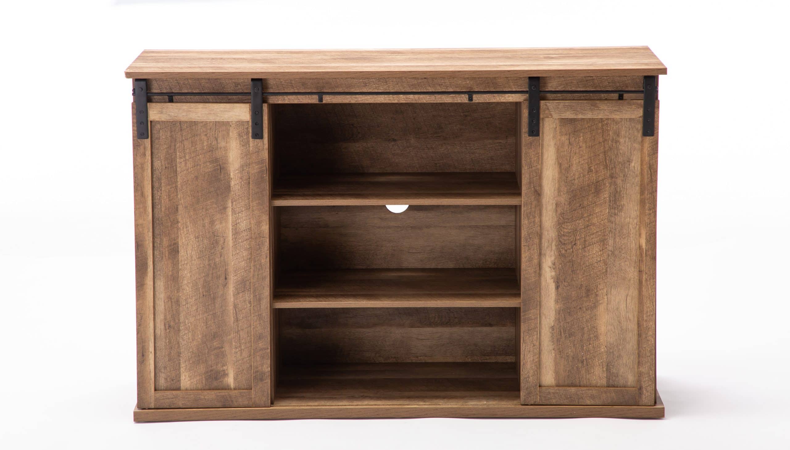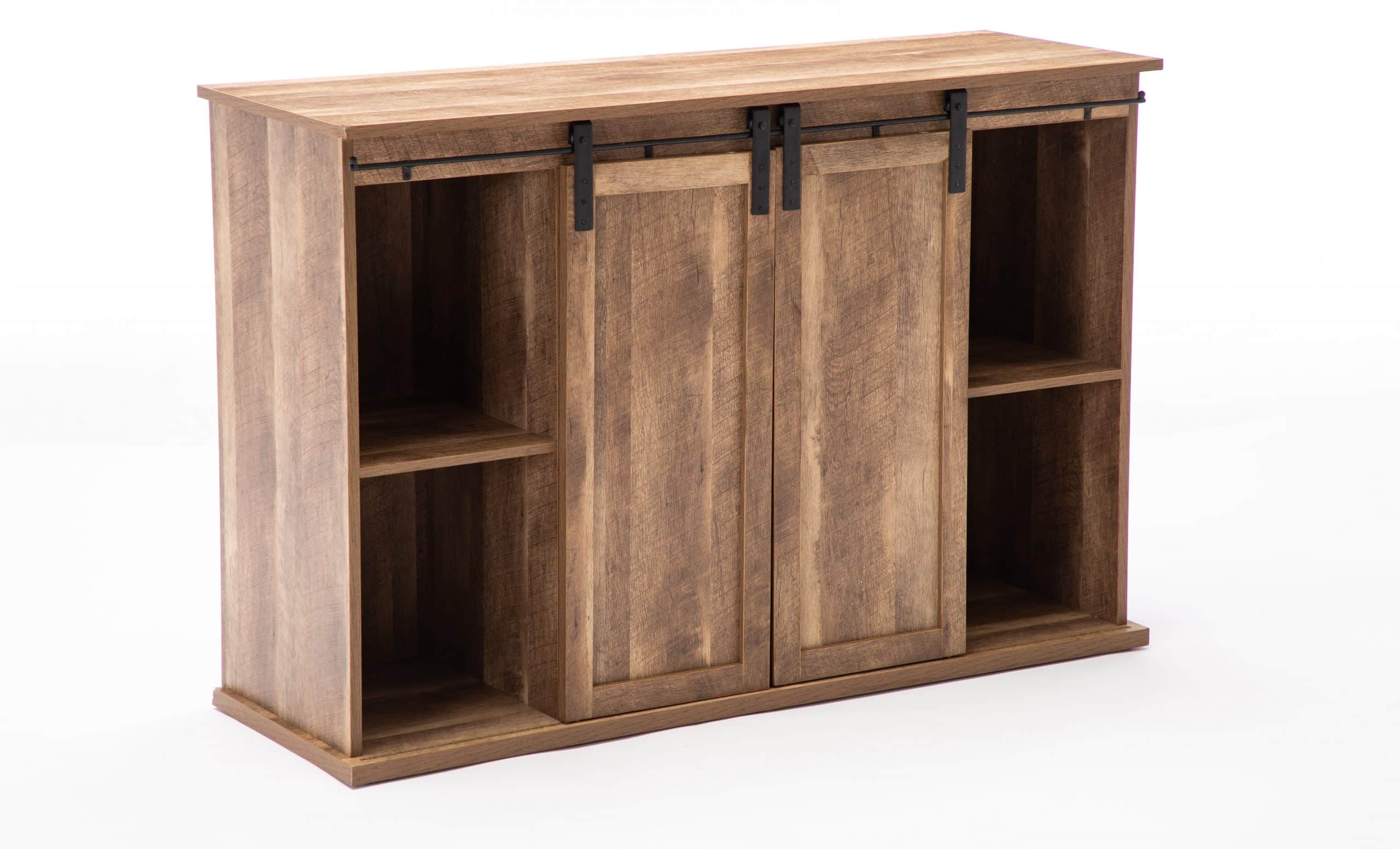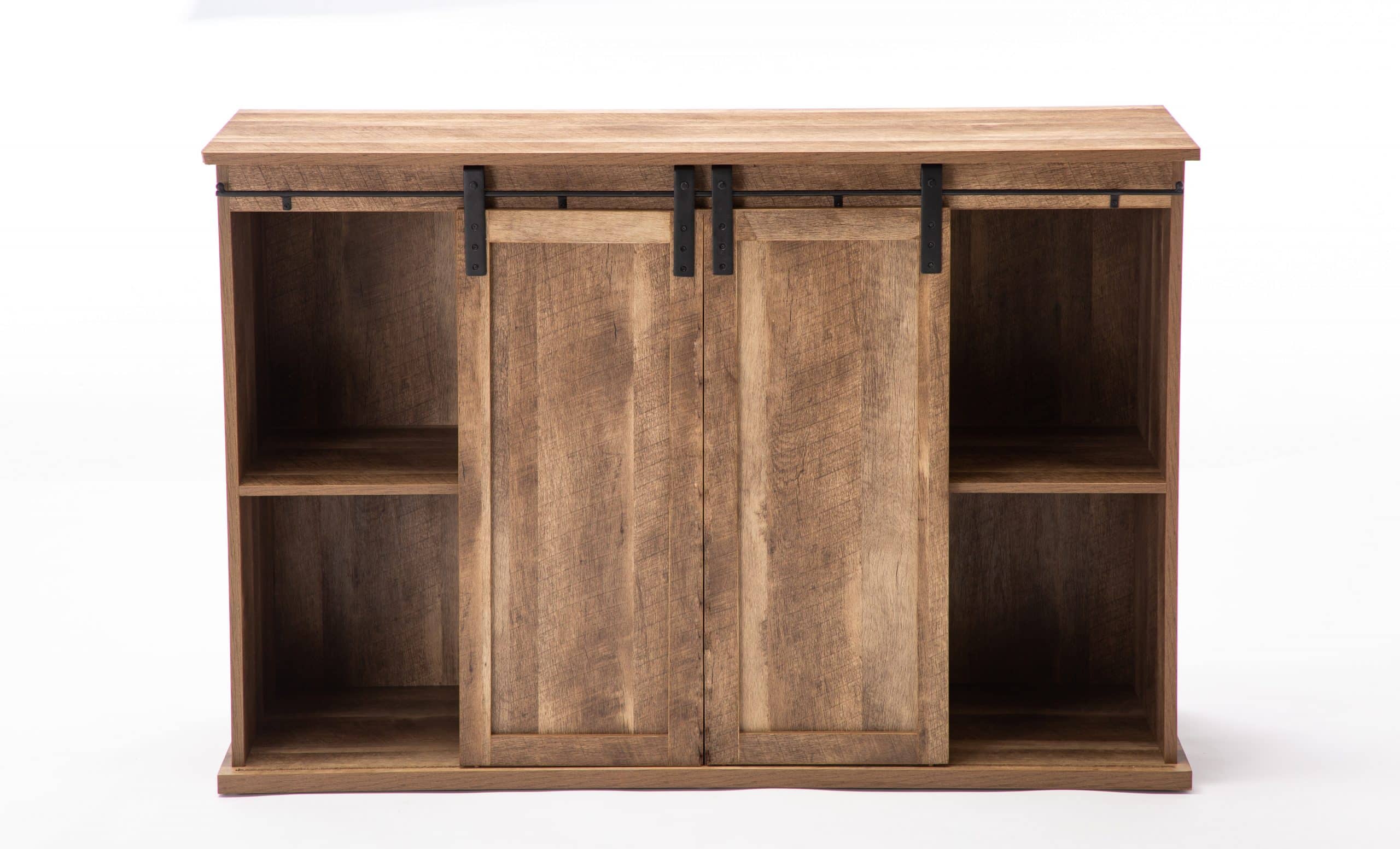 Bring farmhouse-inspired charm to your living room or family room with the Weston Sliding Barn Door Media Cabinet. Use it to organize all your media essentials in one place. The quaint sliding doors cover several shelves, plus there are multiple open shelves, so you won’t run out of storage space. The Weston comes with a built-in wire management cutout, so you can feeds cords from your television, game console, or other electronics through it. This media cabinet is made from a combination of chipboard, medium density fiberboard, and iron. It arrives ready to assemble.