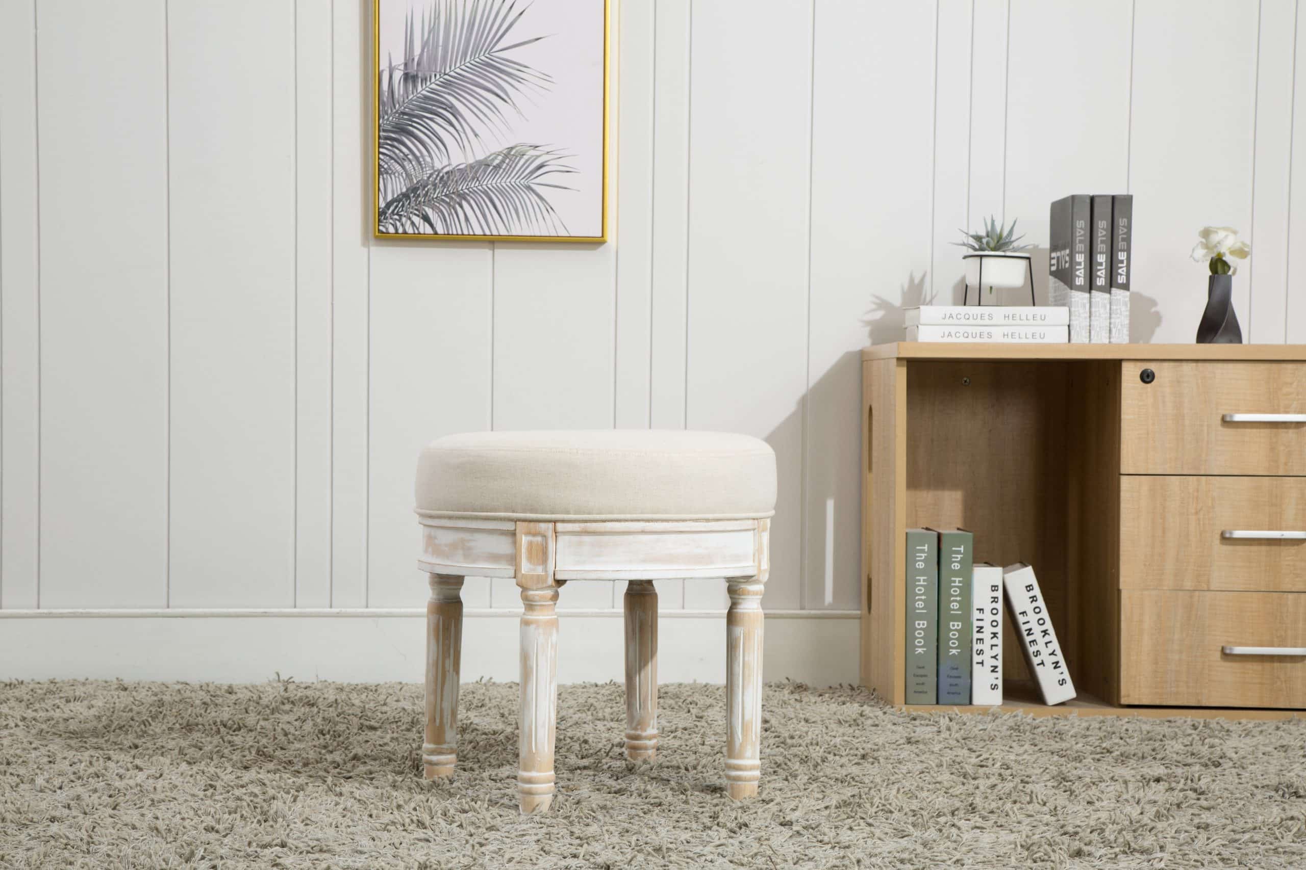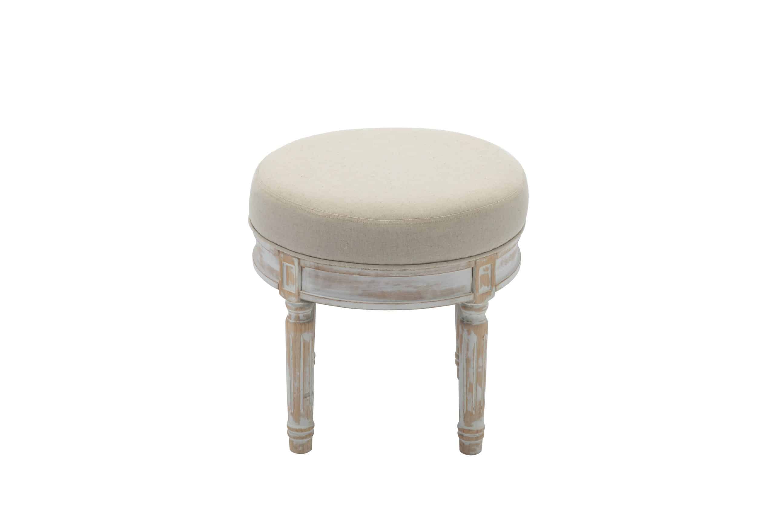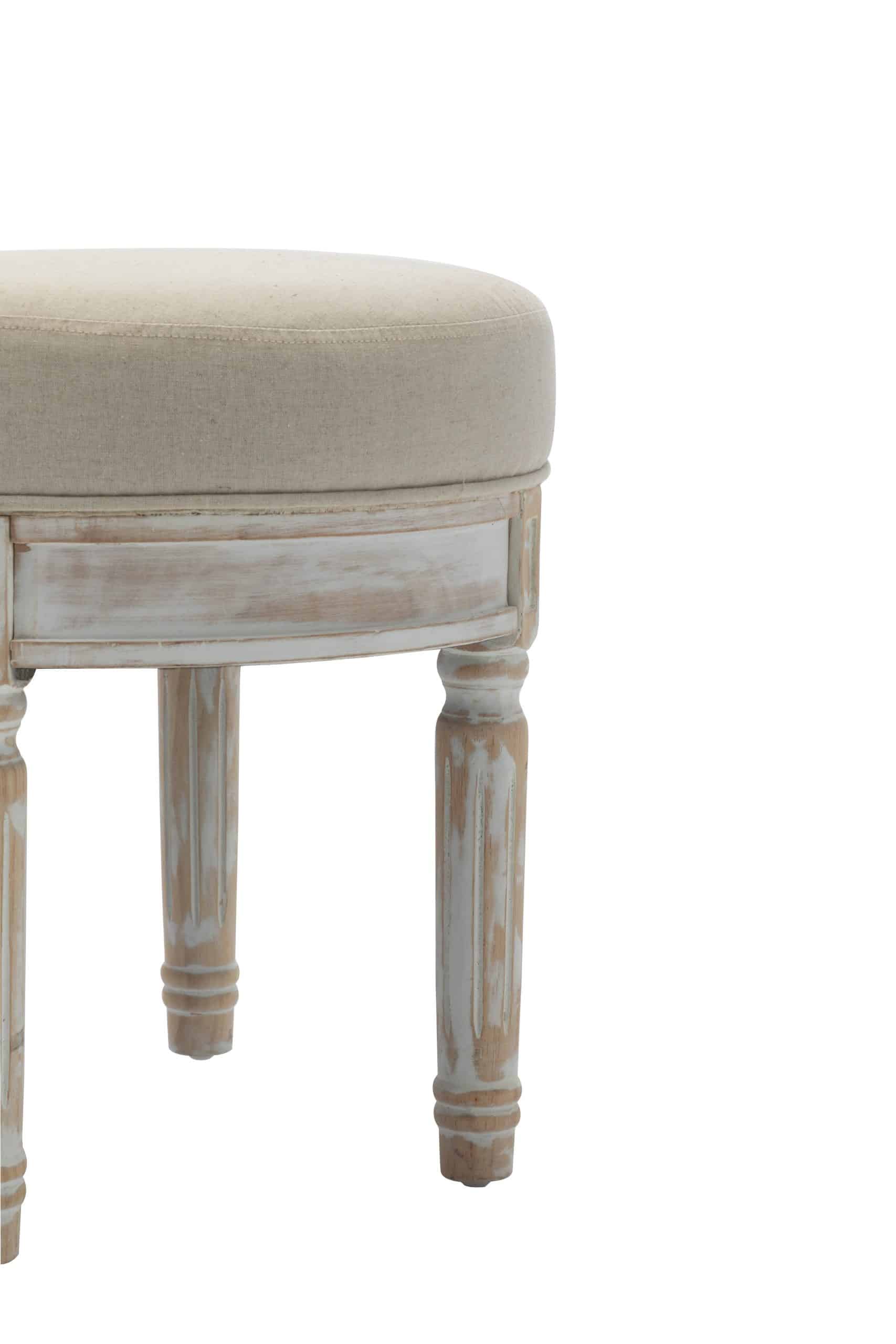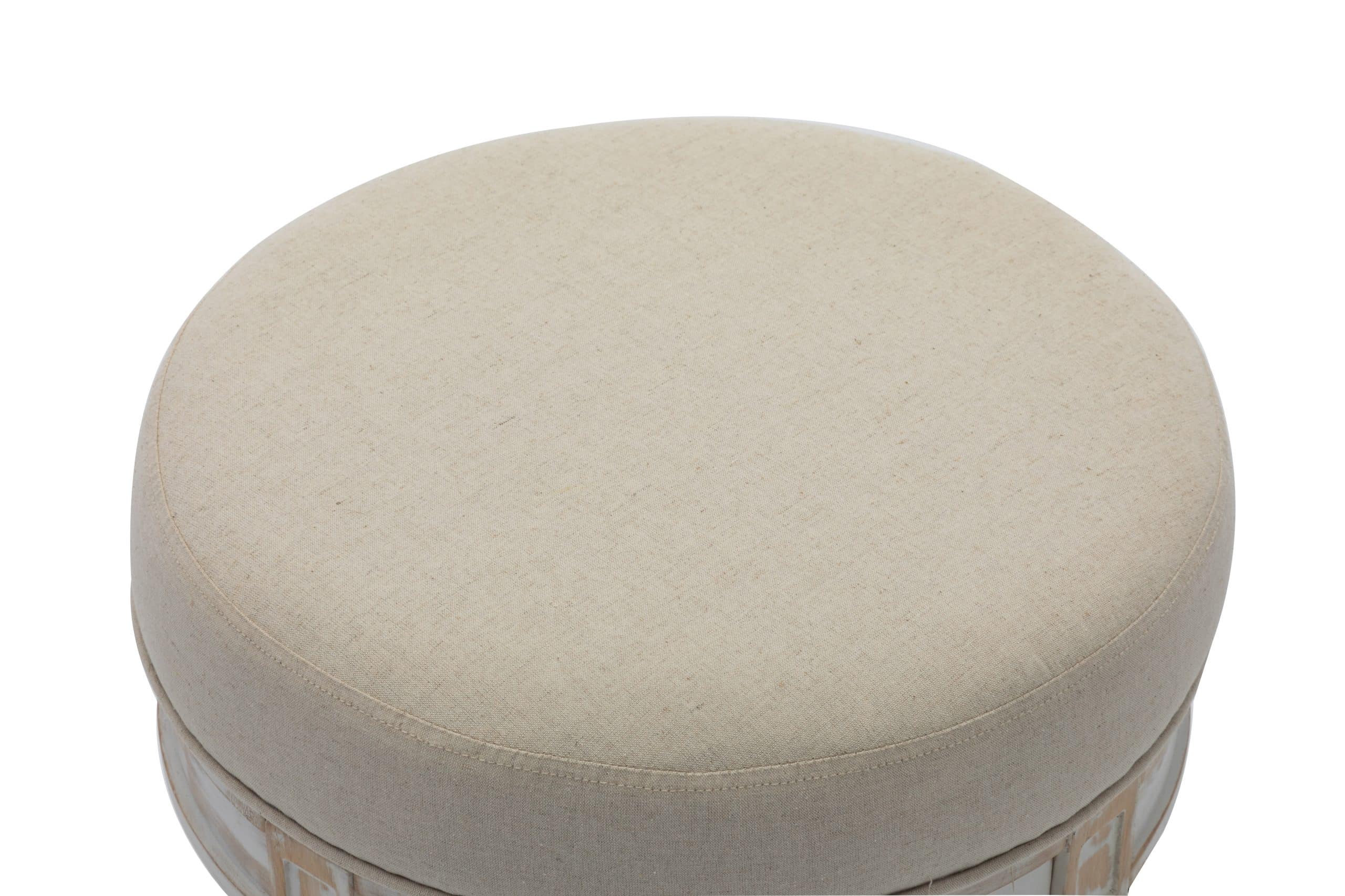 Dynamic footrest that can be used in different areas around the house. The base is a white wash finish with a taupe padded seat. Constructed with rubber wood, PU sponge, and polyester.
