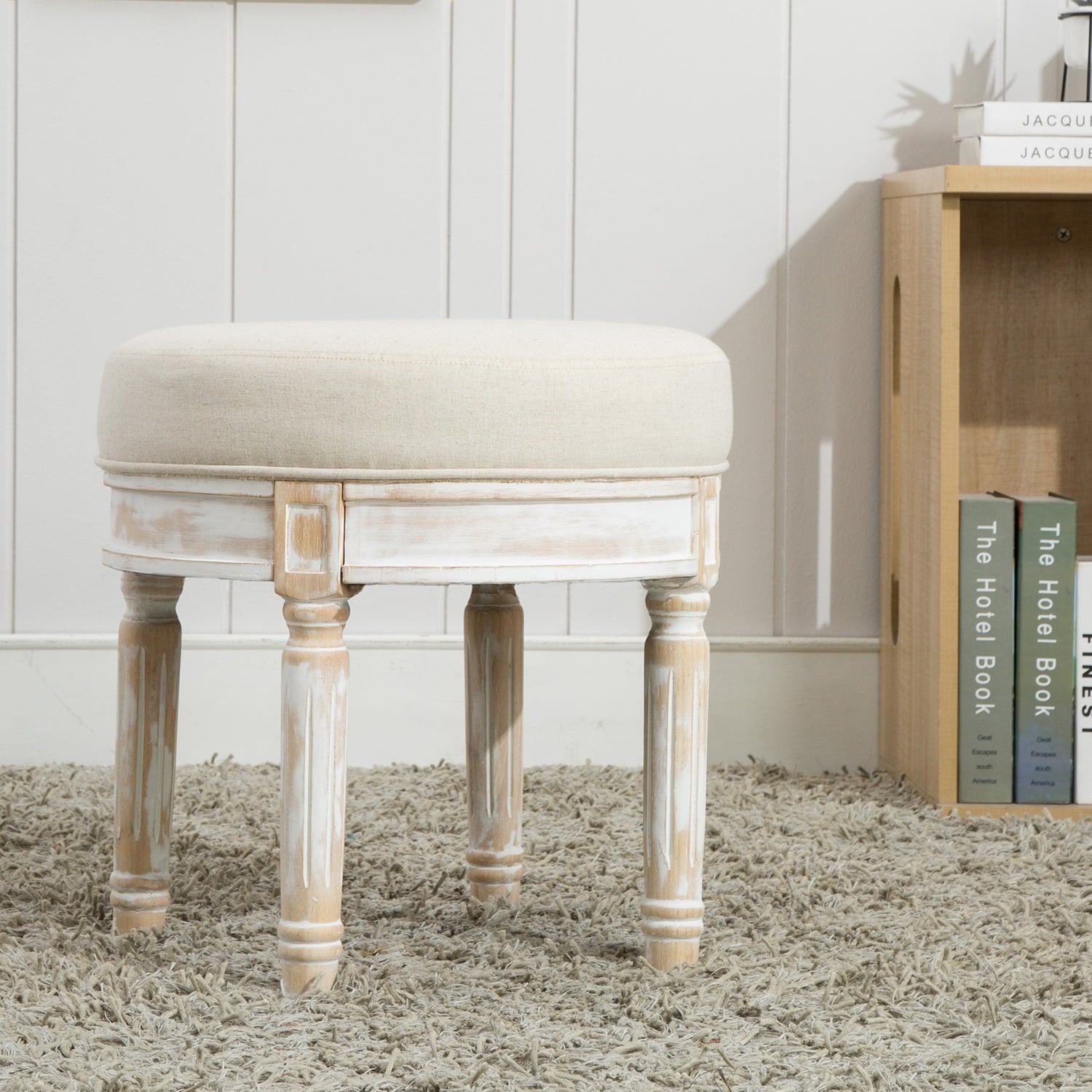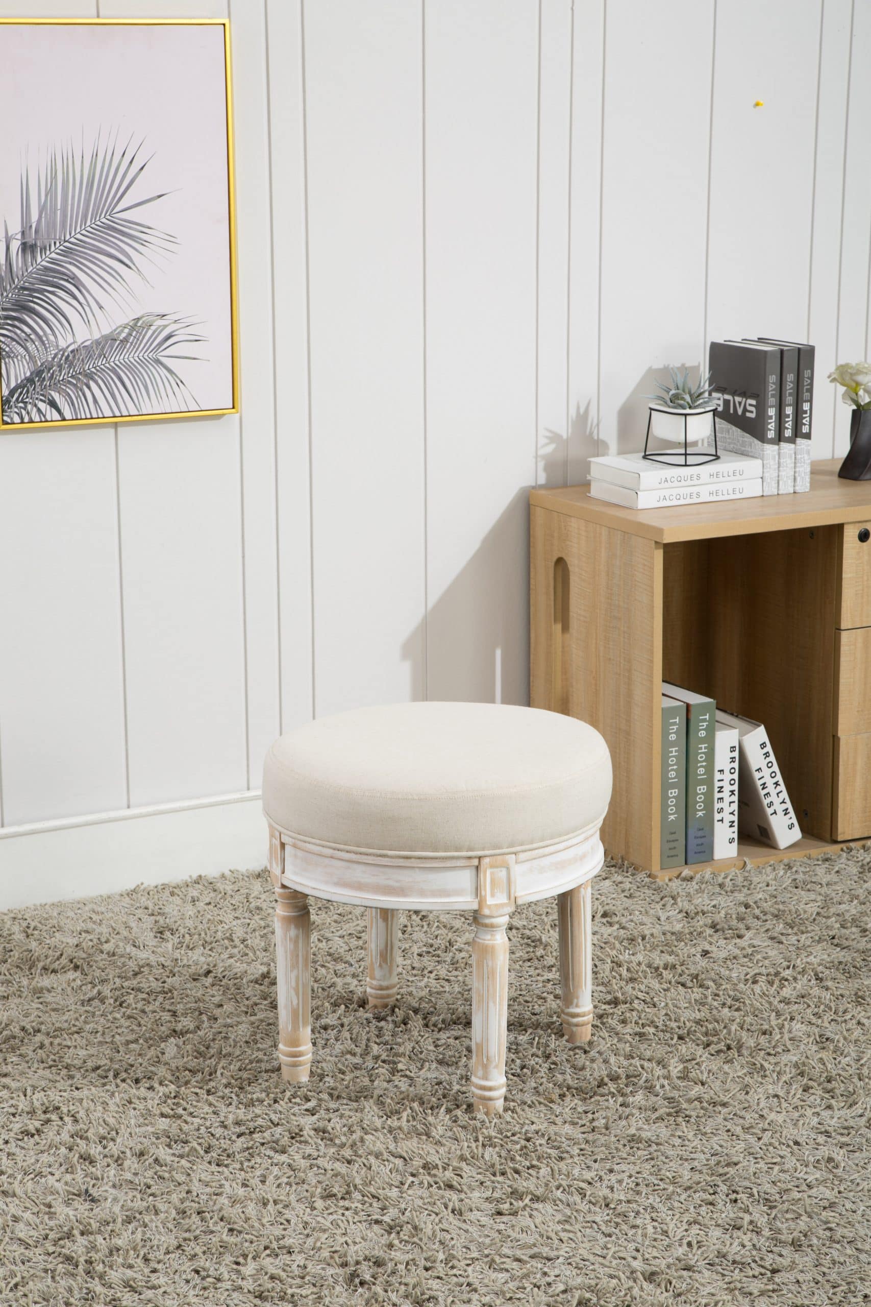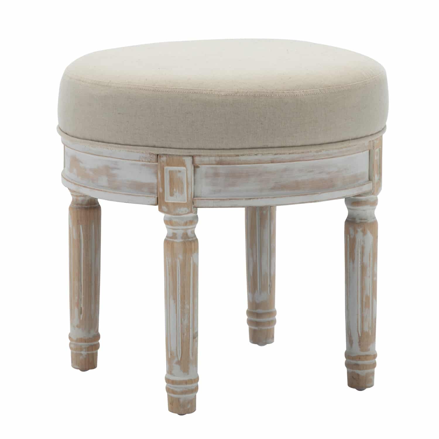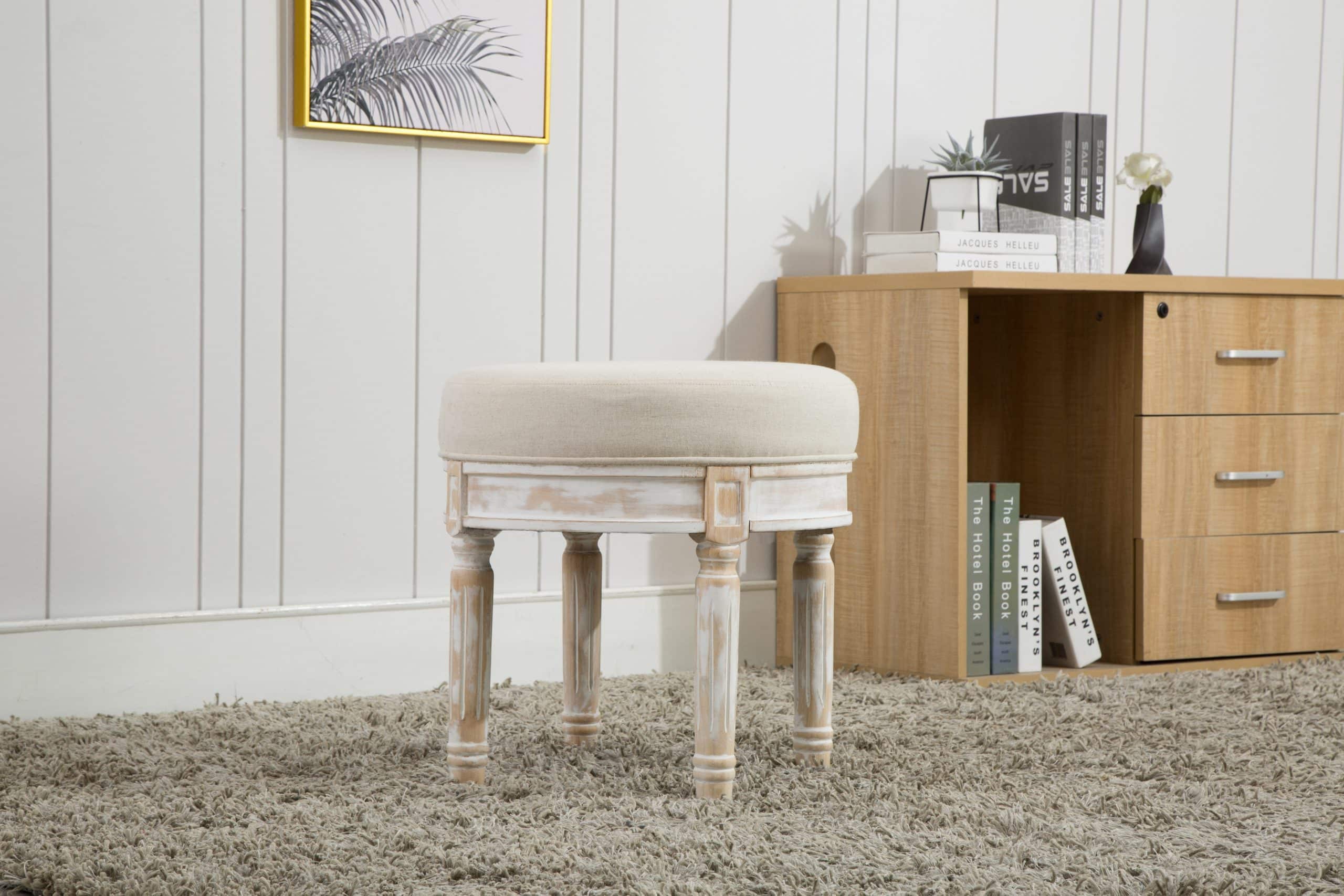 Dynamic footrest that can be used in different areas around the house. The base is a white wash finish with a taupe padded seat. Constructed with rubber wood, PU sponge, and polyester.