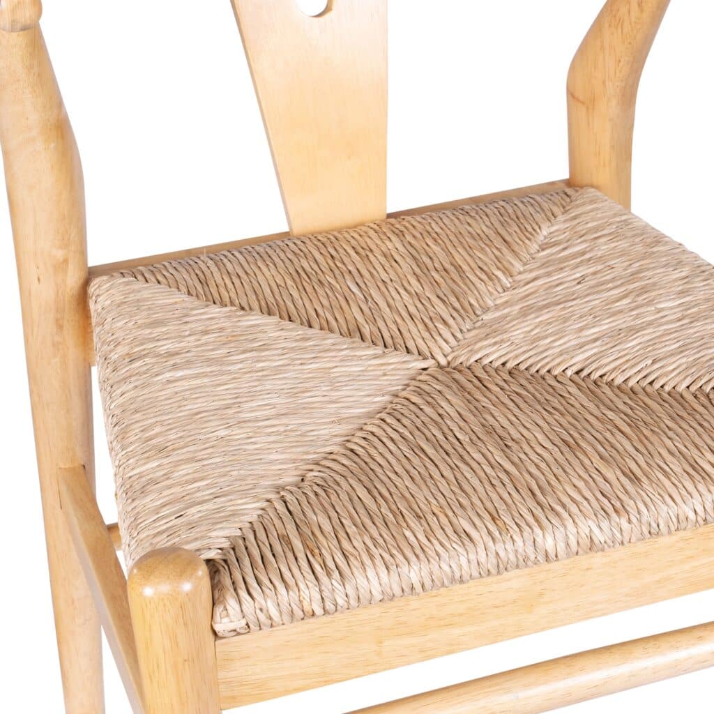 - The Wishbone chair's surface is adorned with natural hand-woven paper rope. This material is intricately crafted, offering solidity, elasticity, high wear-resistance, environmental friendliness, and waterproof qualities.
