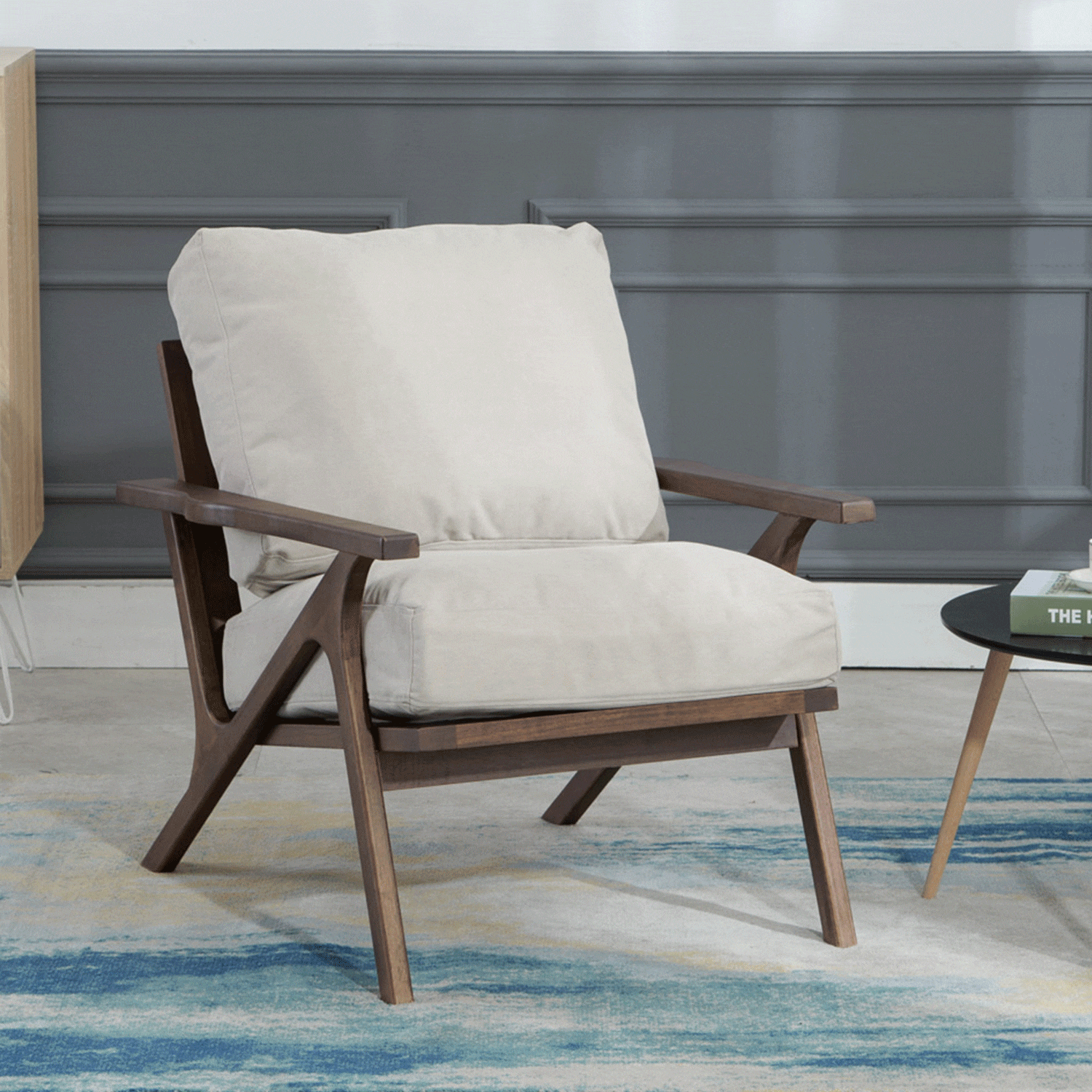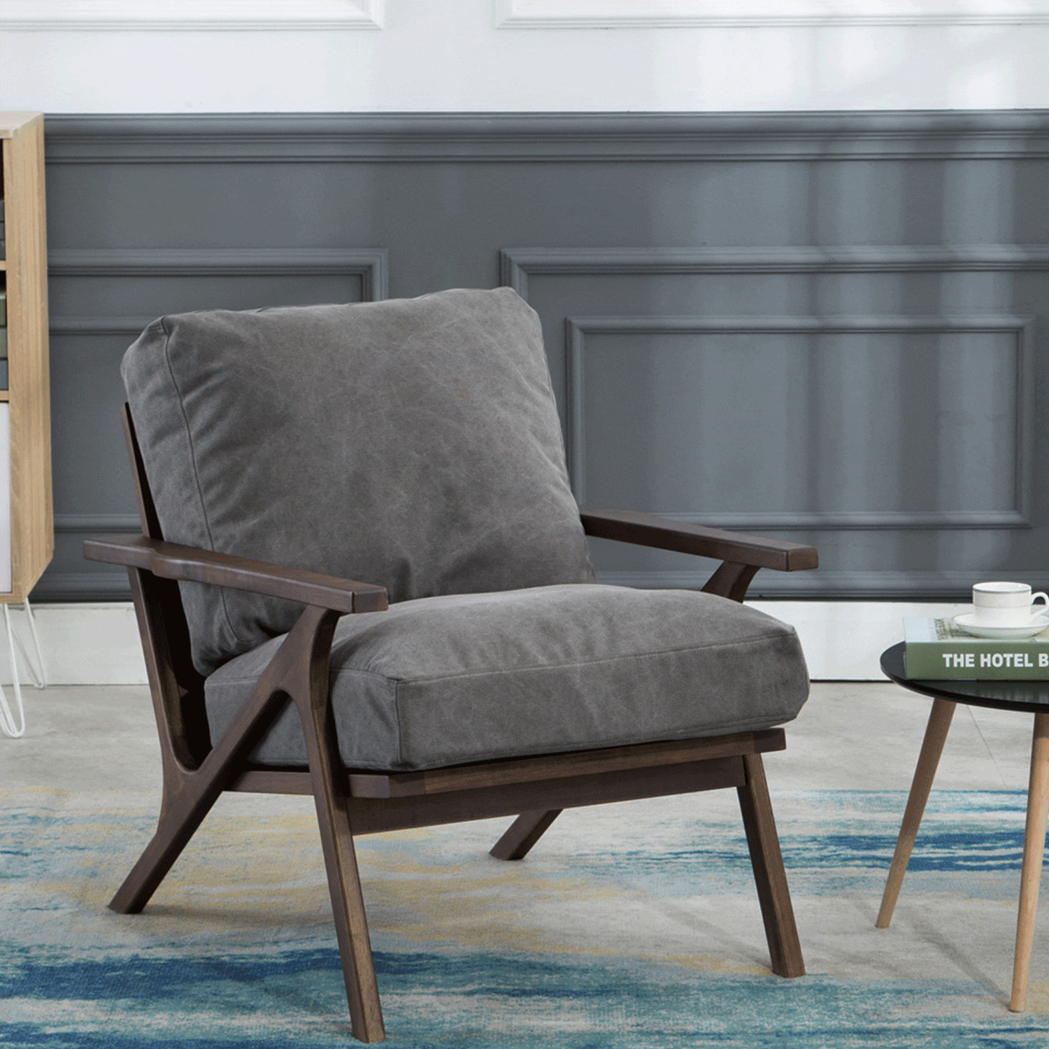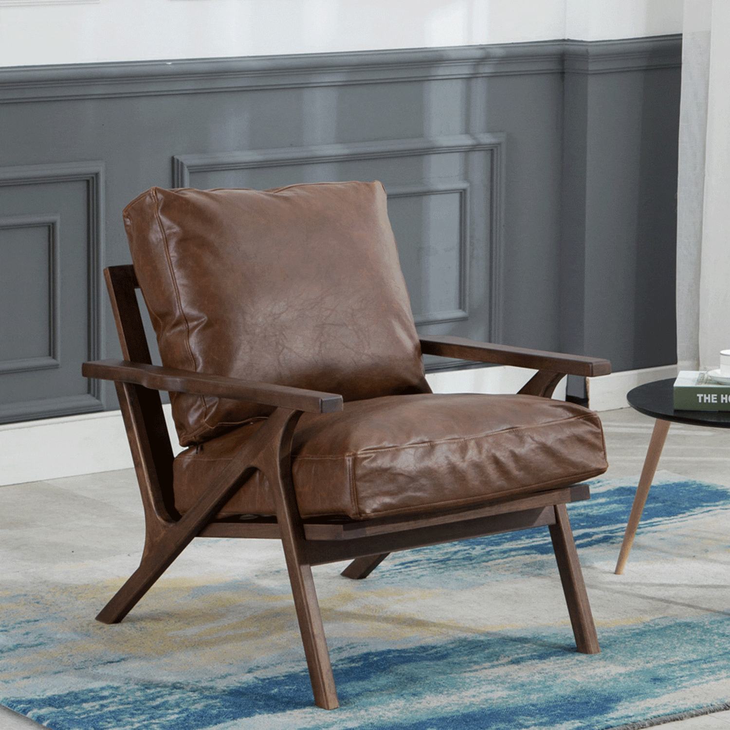 Wood arm chair that would be a perfect addition into any living room or bedroom environment. The seat and backrest are available in three finishes; brown PU, gray, and taupe. The arm chair is constructed rubber wood, PU sponge, and polyester. Some assembly required